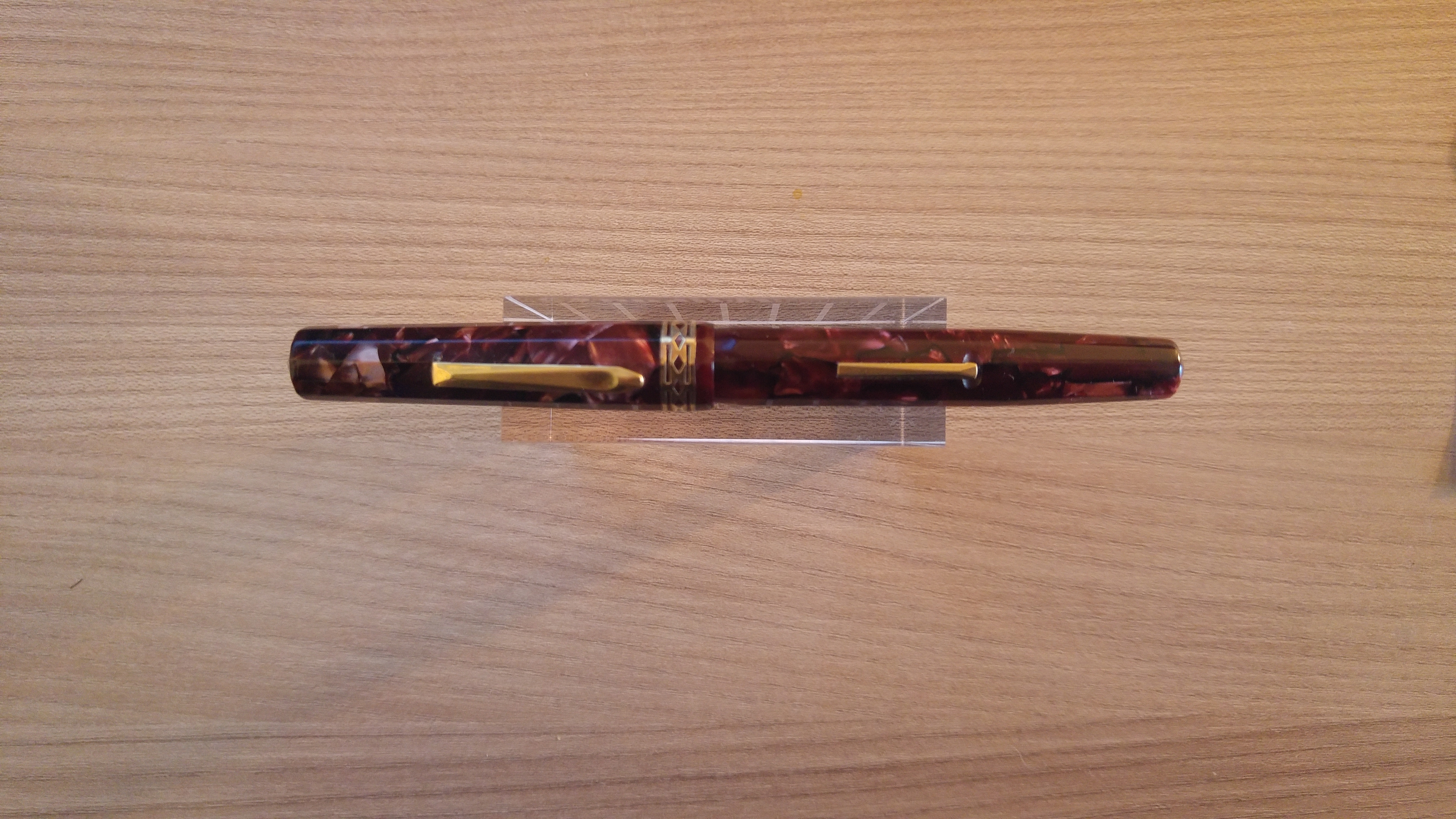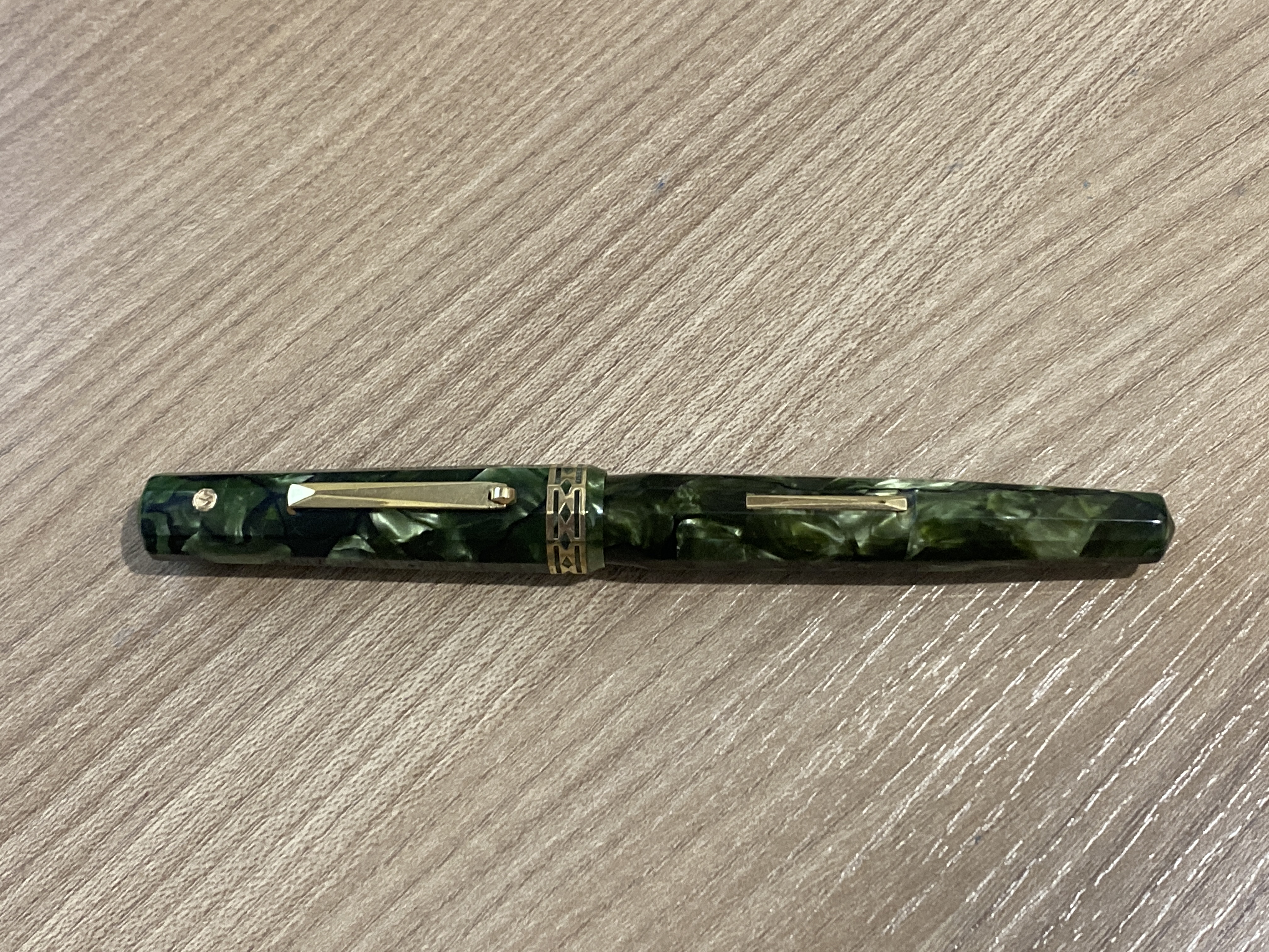La penna in argomento è relizzata in una celluloide chiamata Morocco Pearl ed è una Popular Priced, senza Gold Seal, appartenente alla prima generazione delle Doric. Il modello è di misura standard ossia: