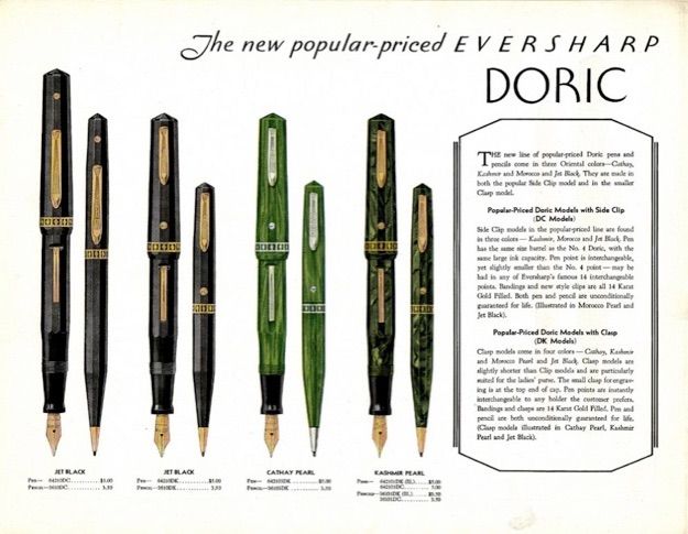 La Eversharp Doric è a mio parere l'icona della penna in stile Art Deco, un modello che a fronte di un discreto successo in patria ha avuto ben più fortuna in Italia. Non solo OMAS, ma molti altri marchi italiani nelle loro realizzazioni di penne sfaccettate, si sono ispirati allo stile introdotto da questo modello.