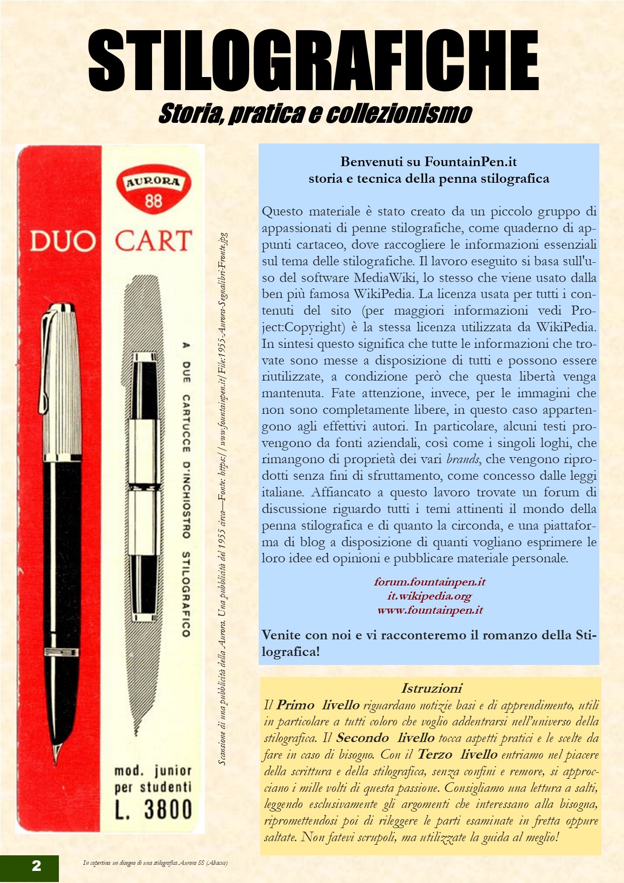 Questo materiale è stato creato da un piccolo gruppo di appassionati di penne stilografiche, come quaderno di appunti cartaceo, dove raccogliere le informazioni essenziali sul tema delle stilografiche. Il lavoro eseguito si basa sull'uso del software MediaWiki, lo stesso che viene usato dalla ben più famosa WikiPedia. La licenza usata per tutti i contenuti del sito (per maggiori informazioni vedi Project:Copyright) è la stessa licenza utilizzata da WikiPedia. In sintesi questo significa che tutte le informazioni che trovate sono messe a disposizione di tutti e possono essere riutilizzate, a condizione però che questa libertà venga mantenuta. Fate attenzione, invece, per le immagini che non sono completamente libere, in questo caso appartengono agli effettivi autori. In particolare, alcuni testi provengono da fonti aziendali, così come i singoli loghi, che rimangono di proprietà dei vari brands, che vengono riprodotti senza fini di sfruttamento, come concesso dalle leggi italiane. Affiancato a questo lavoro trovate un forum di discussione riguardo tutti i temi attinenti il mondo della penna stilografica e di quanto la circonda, e una piattaforma di blog a disposizione di quanti vogliano esprimere le loro idee ed opinioni e pubblicare materiale personale.