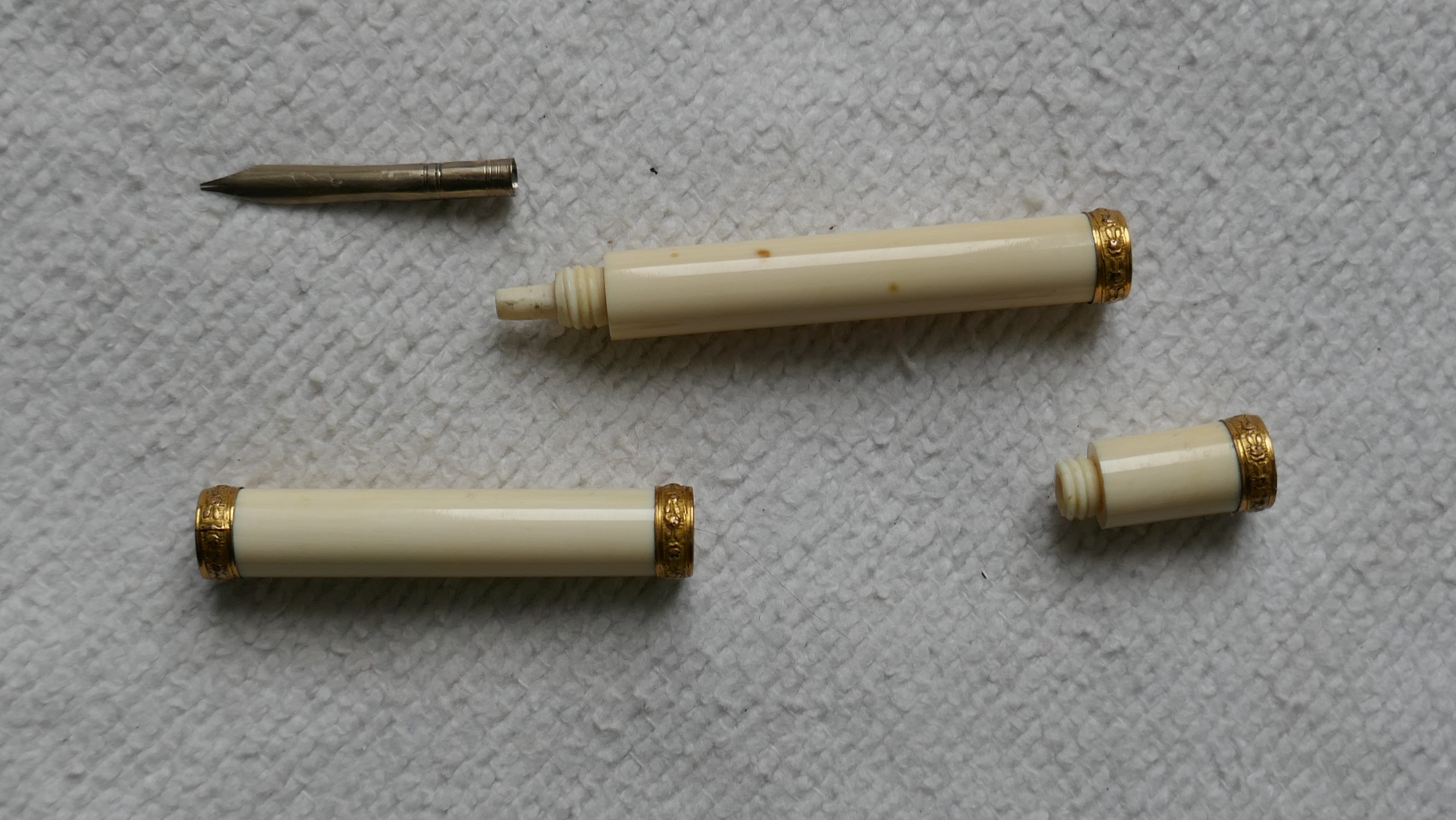 Potrebbe essere un penner in avorio o qualche sorta di pennino da viaggio.
