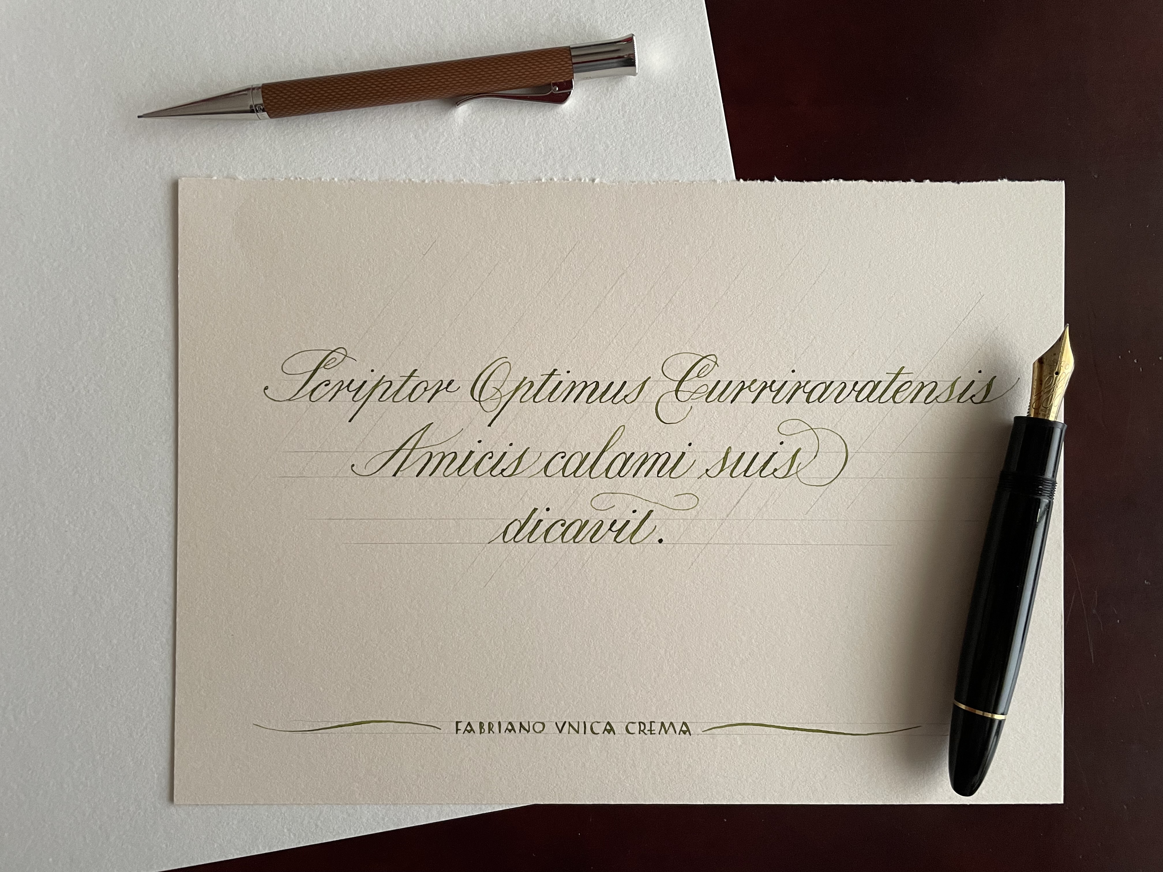 Forse alcuni di voi ricorderanno che mi sono sperticato in elogi per una carta di Fabriano che uso con frequenza per le mie operette calligrafiche: la Unica. A 250 grammi è ovviamente troppo pesante come carta per uso quotidiano, ma ha una consistenza- liscia ma non burrosa - e una tenuta all’inchiostro che la rendono magica per la scrittura curata.