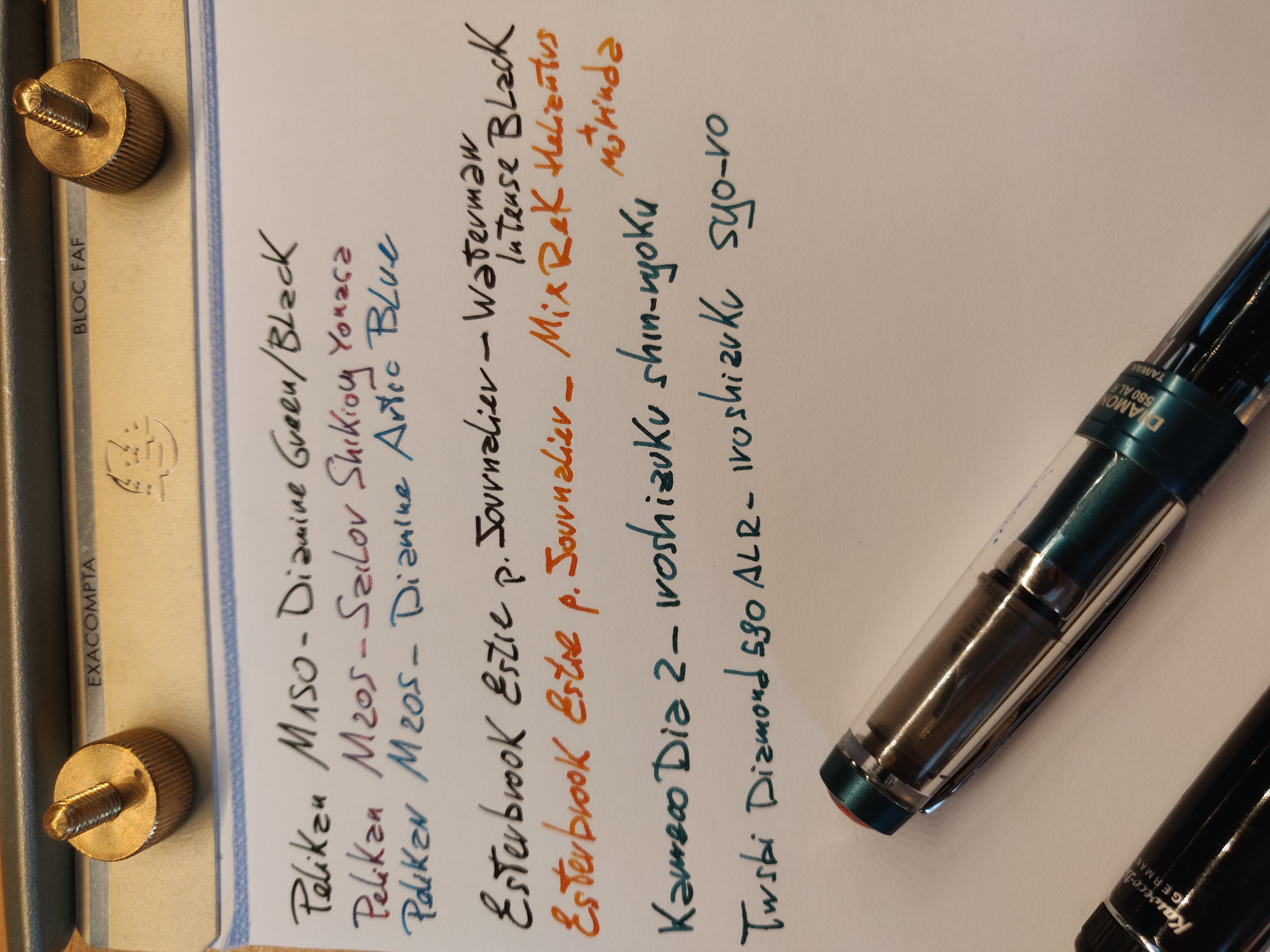 - Pelikan M150 Old style con Diamine Green/Black (inchiostro molto bello e comodo, secondo me... asciuga rapidamente, non spiuma, non trapassa, non annoia ;-) )