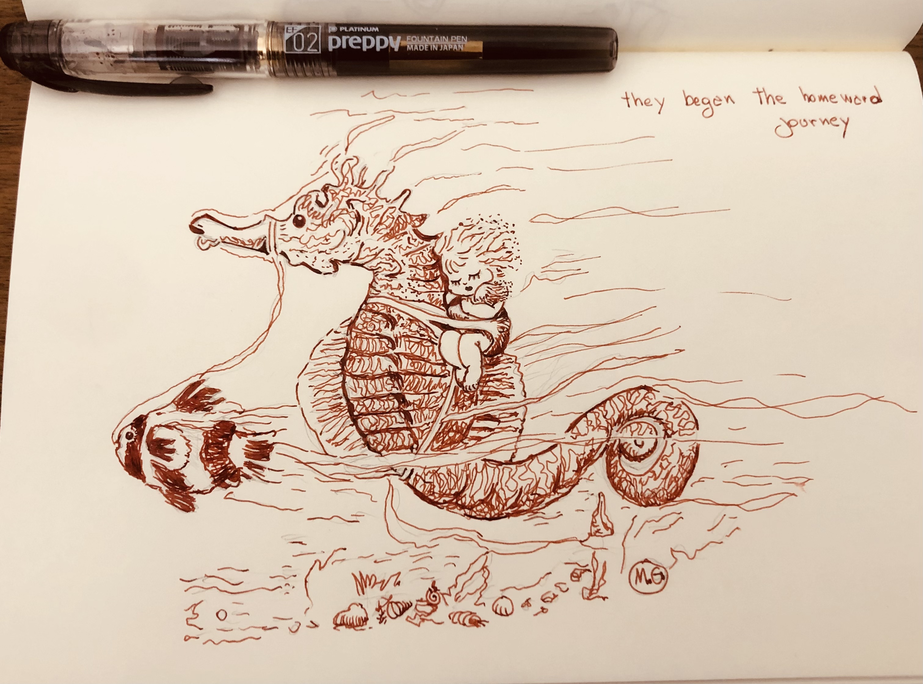 L’illustrazione che ho scelto di riportare sul mio quaderno mi ha subito colpito per il romanticismo e senso d’avventura che porta con se. Qui un breve video: