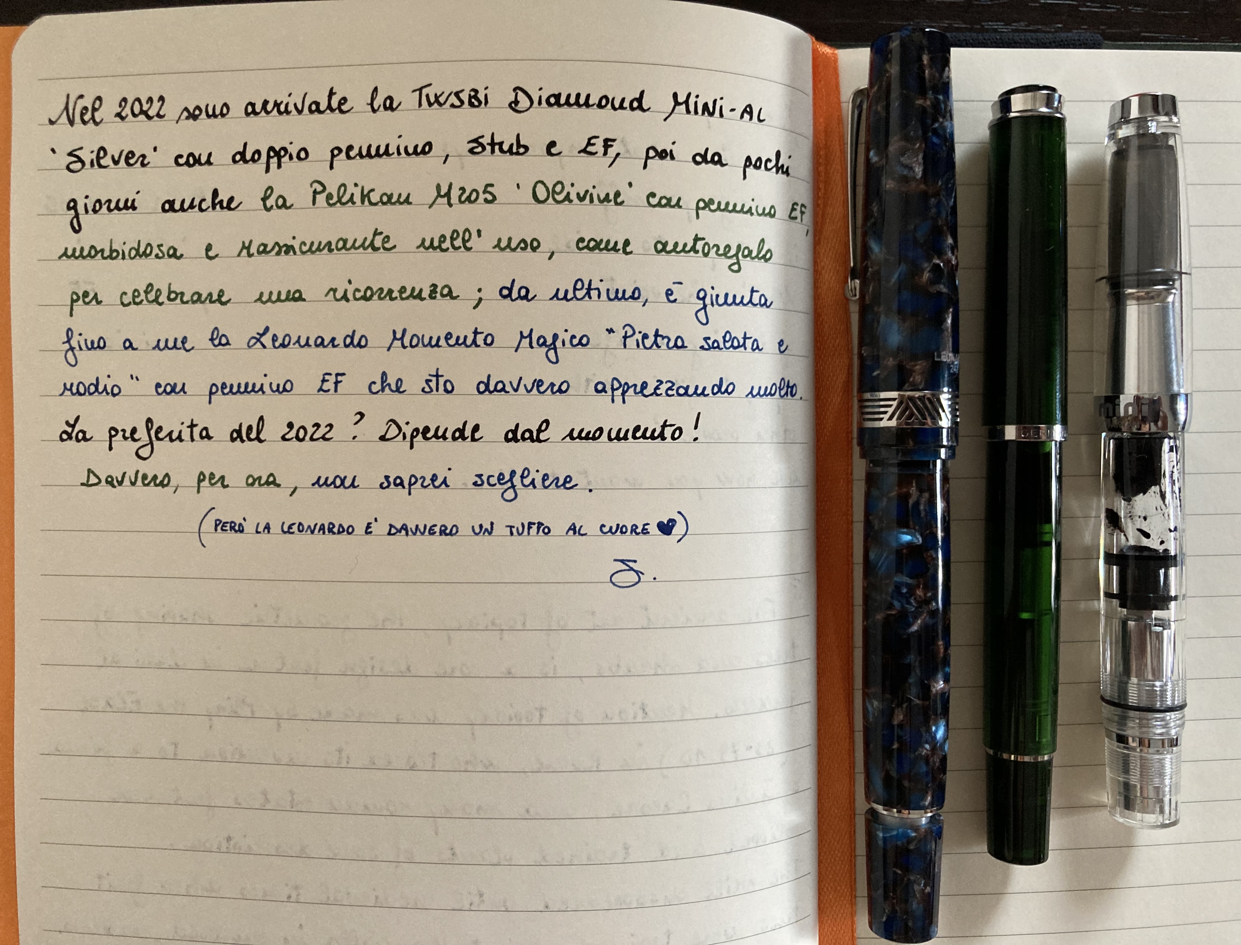 Avrei messo anche la Kaweco Dia2 F ma non è un acquisto, è un regalo di Natale (quindi 2021) anche se la prima inchiostrata è stata nel 2022, ed è fra le mie penne preferite in assoluto fra quelle che ho