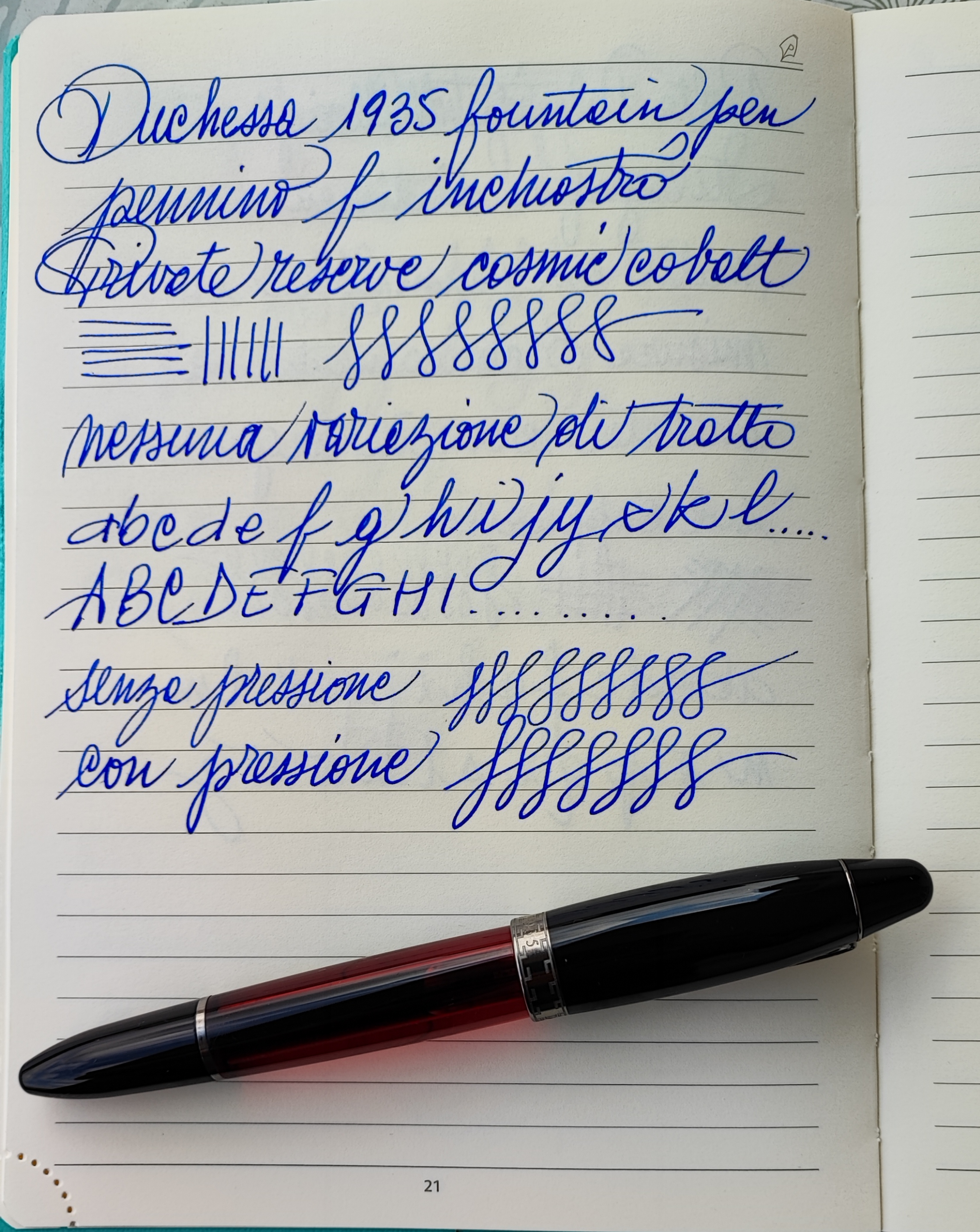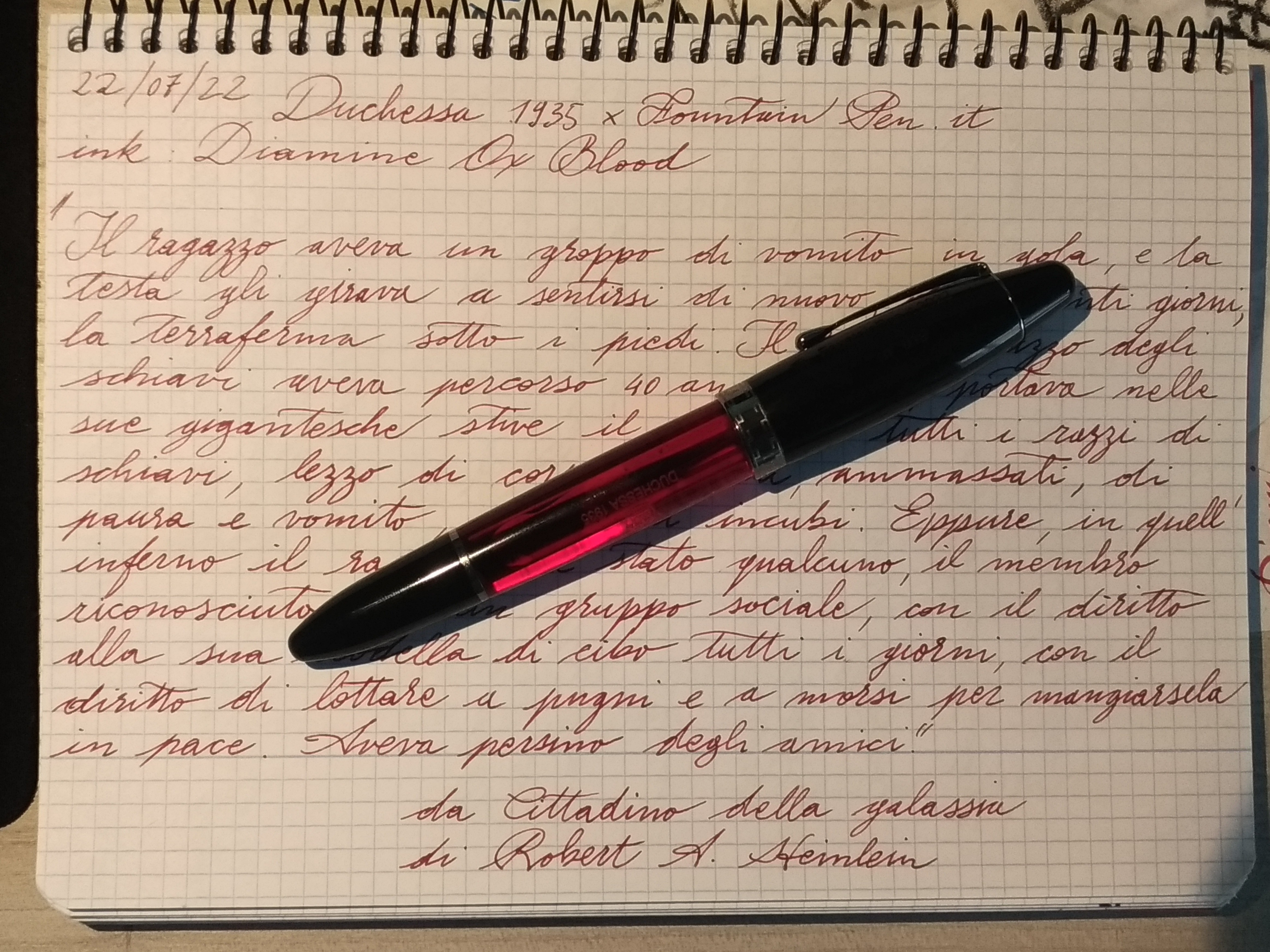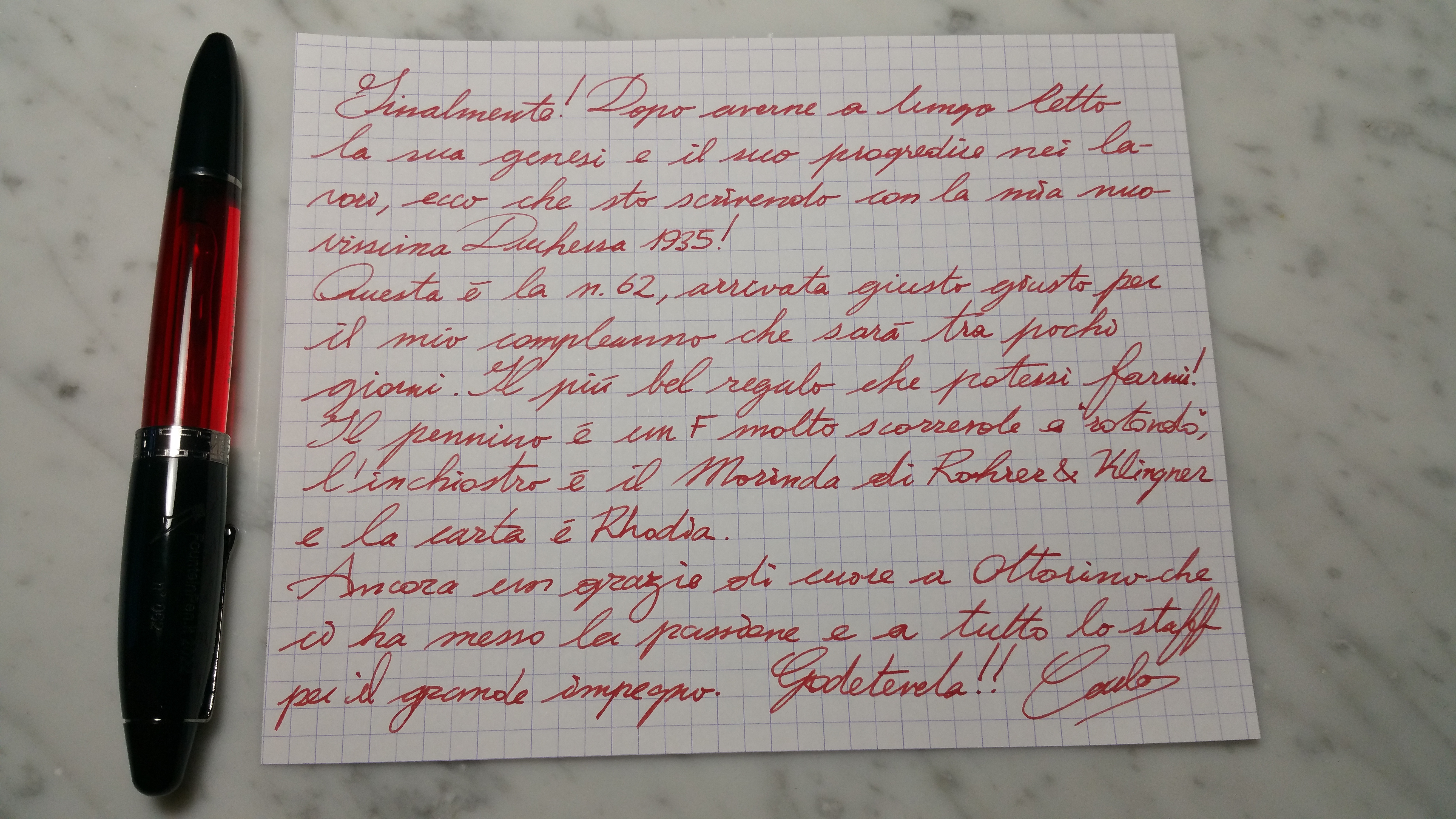 Sto provando la Duchessa con il pennino M, semi caricata con il Parker blu è partita al primo colpo, non l'ho nemmeno lavata e/o caricata con l'acqua come prima azione. Per scrivere utilizzo un blocco di carta comune, quelli pubblicitari delle ditte, e il tratto è un medio discreto. Il pennino, rigido ma non il classico chiodo, scorre bene e rilascia un leggero fruscio che non disturba. Si impugna bene per via di quella curvatura della sezione e la filettatura non compromette la presa. Il sistema di carica, molto semplice, funziona bene, in definitiva sono soddisfatto della penna.
