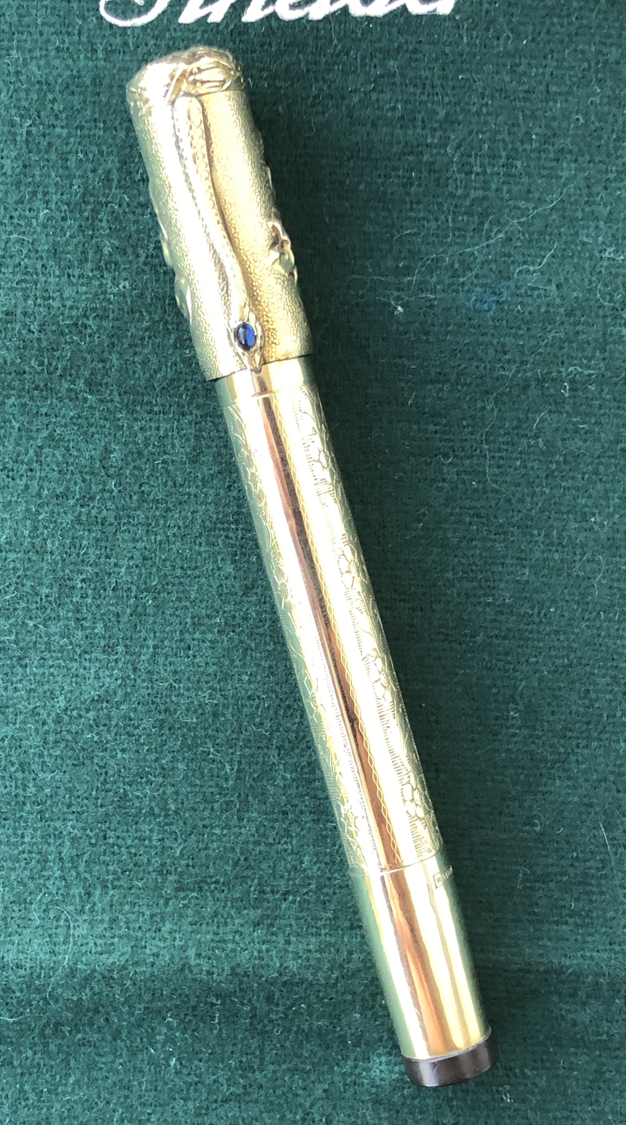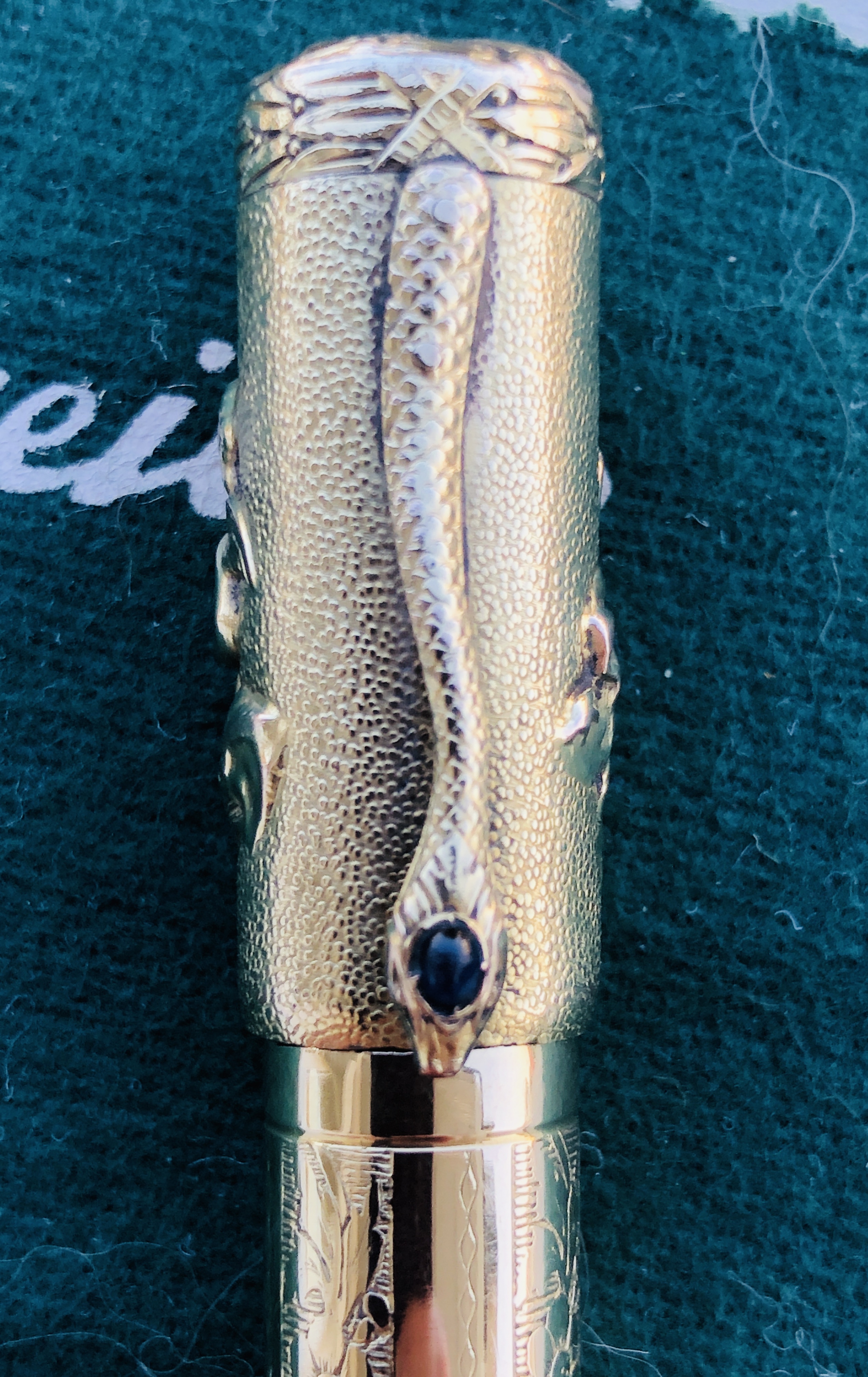 Penna interessante, ma fuori da denti, quel cappuccio, per quanto sia un lavoro pregevole e di livello altissimo, non mi piace proprio, appesantisce le linee della penna, che diventa una specie di fiammiferone...