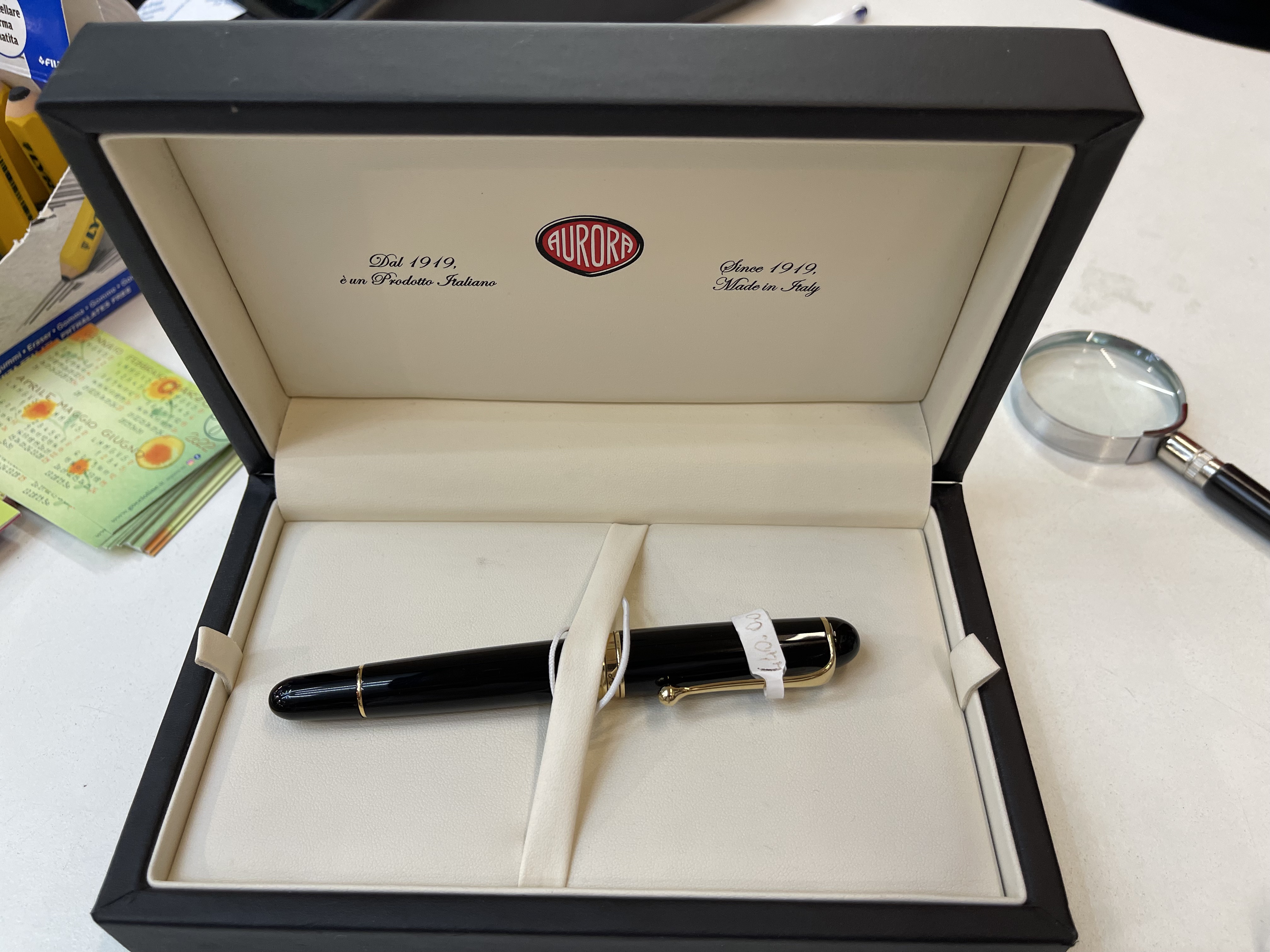 Salve sono nuovo del Forum, sono un piccolo appassionato di stilografica, sto per fare un acquisto di una penna Aurora, quella che vedete nell'immagine allegata, qualcuno sa dirmi se effettivamente è una Aurora 88 Big?, il titolare della cartoleria non sa dirmi da quando tempo è in vetrina, non trova nemmeno la scatola di cartone originale.