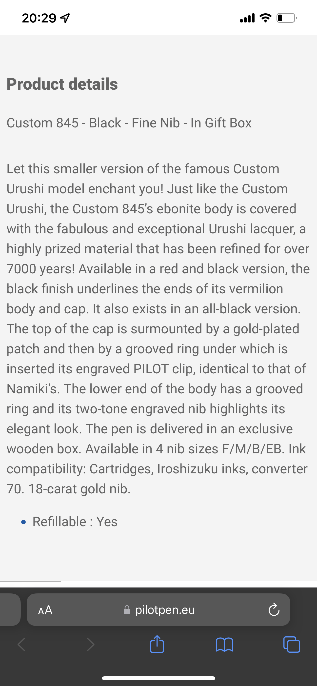 Su questo catalogo è descritta così, ma cercando sul sito Pilot (quello .eu, su quello italiano e inglese non c’è nessuna penna delle serie Custom 74/91/742/912/743/823/845/Urushi) riporta “exceptional Urushi lacquer” anche per la 845, così come tutti i siti di negozianti dove l’ho vista.