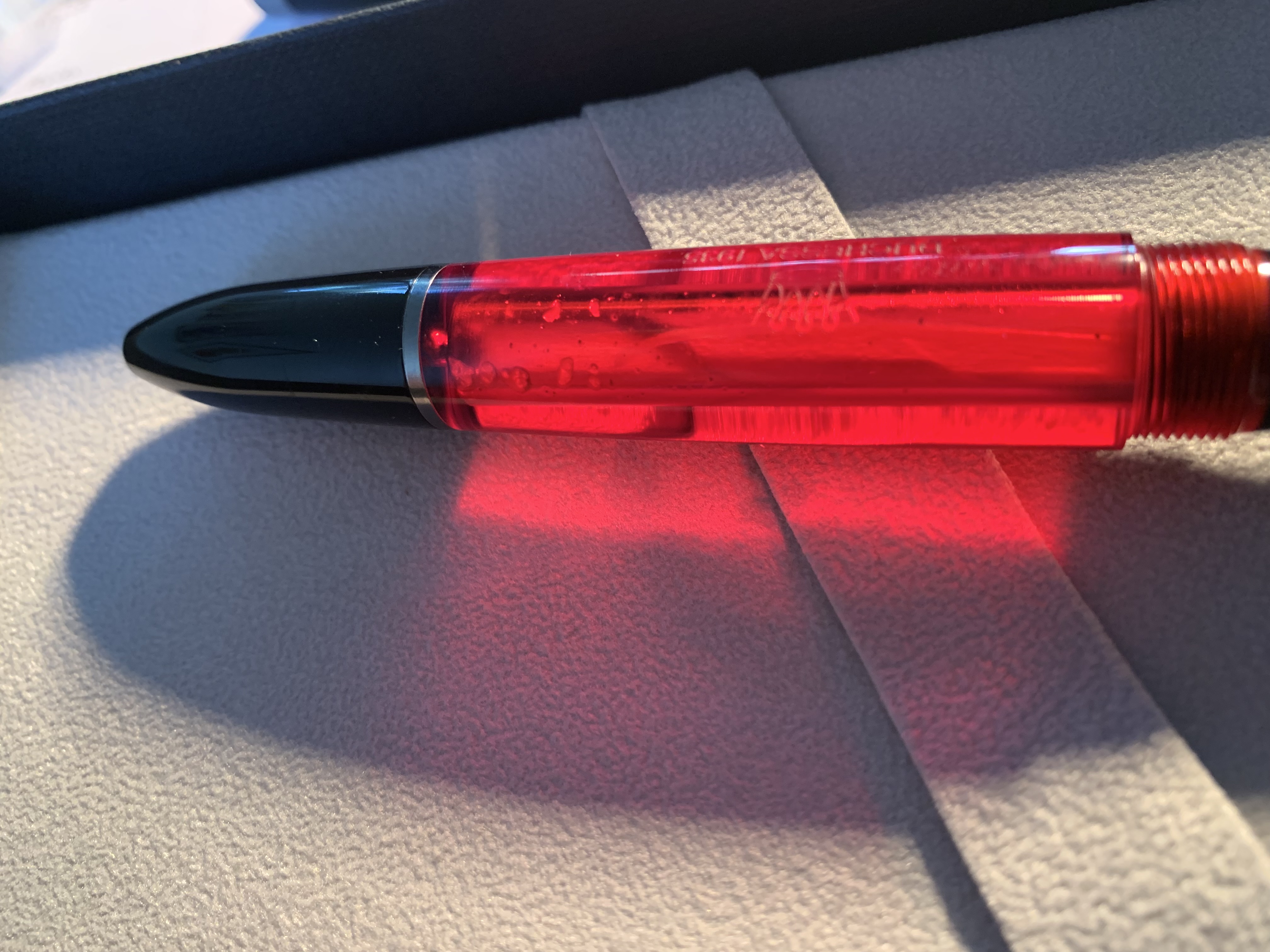 L'ho notata subito anche io ed avrei preferito che l'incisione sul pennino fosse fatta al contrario, in modo da avere le scritte allineate.