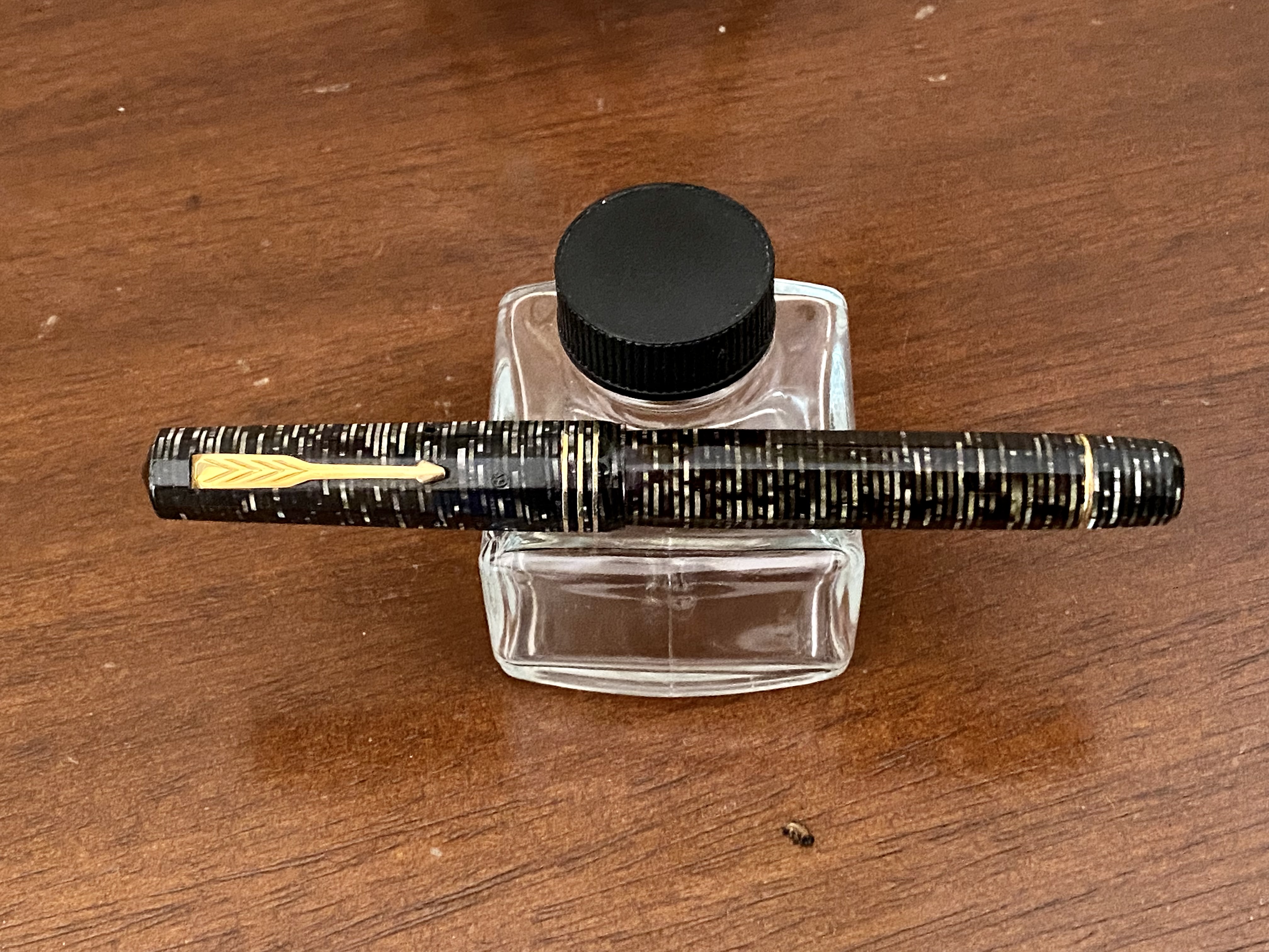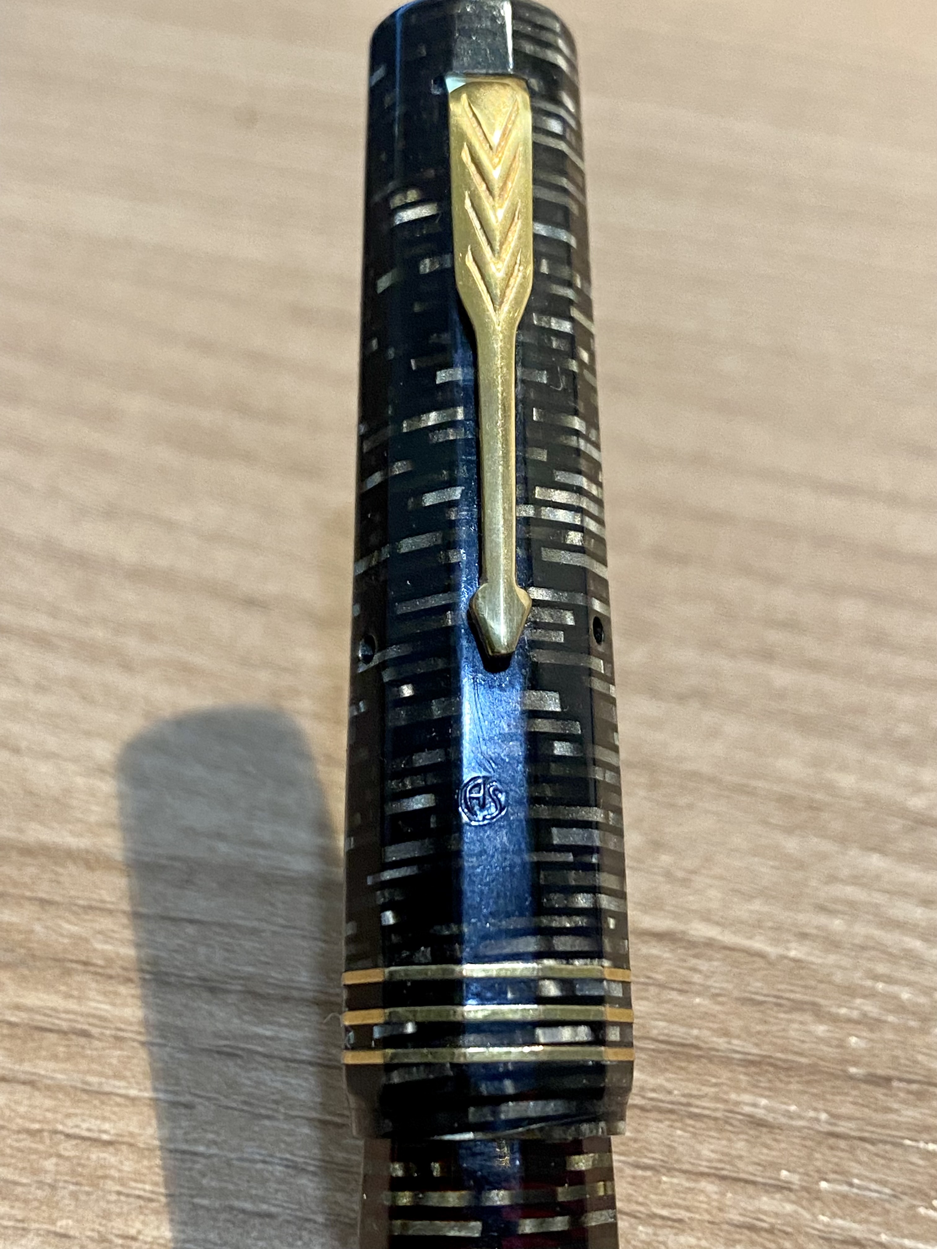 Il mio orgoglio oltre che per la penna in ottime condizioni, a dirla tutta, è per essere riuscito a riportarla in ottime condizioni. La presi ad inizio 2022 con il fondello di ricarica masticato, lo stantuffo tuffante che non funzionava (ma questo era il minimo), la clip spezzata e un pennino in acciaio generico pure arrugginito. Riuscire a ritrovare le parti mancanti originali e coeve è stato un lavoraccio, più che trovare chi me la rimettesse in sesto!