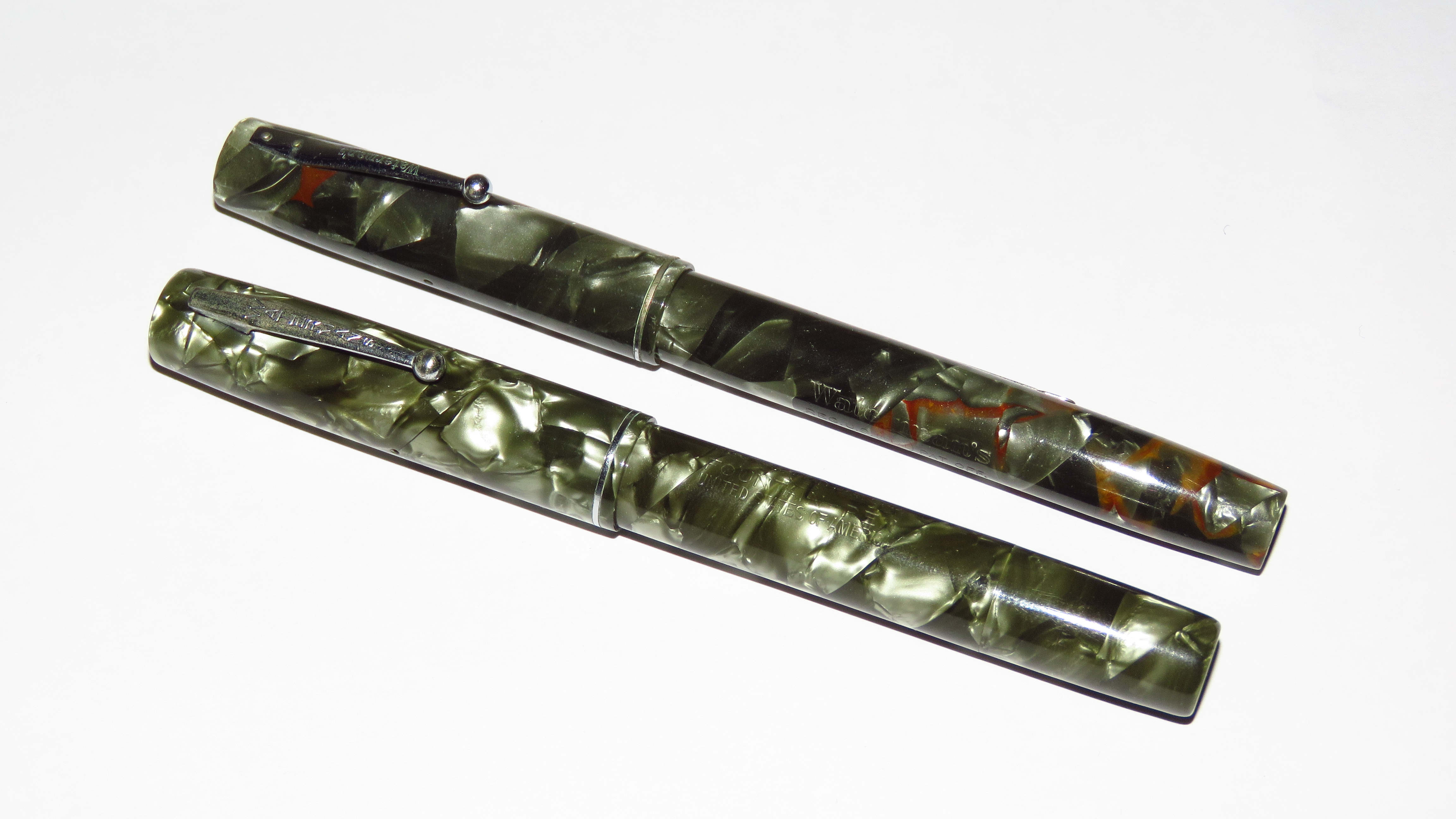 Entrambe sono lavorate dal torciglione di celluloide, come di consueto, entrambe made in USA e possiedono la stessa incisione sul fusto. Unica differenza magari imputabile a una data di produzione diversa: una ha ancora la clip rivettata l'altra ha quella di tipo a cravatta, montata.