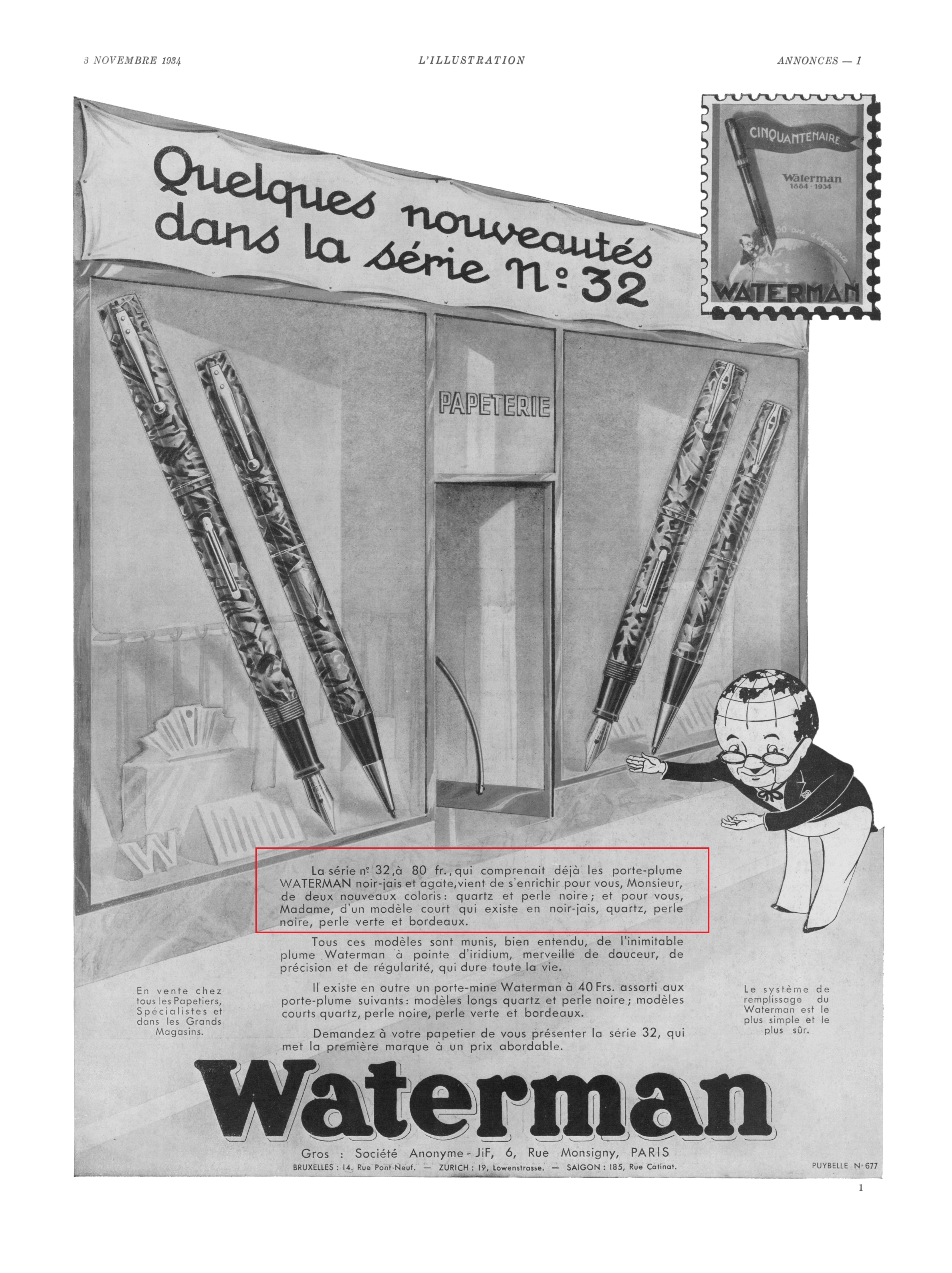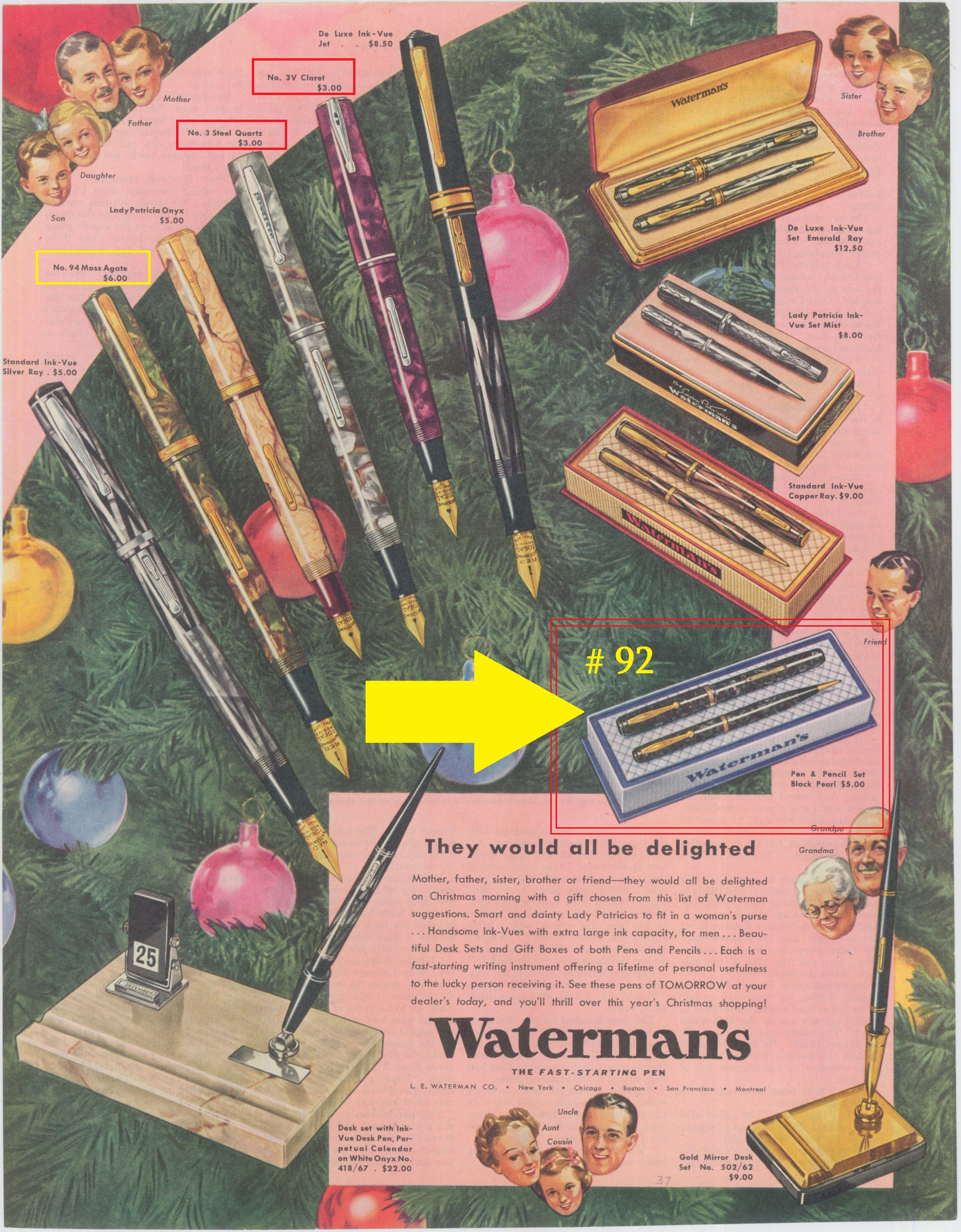 mi sento di escludere con certezza che le Waterman/JiF a "cartouche d'encre" (cartridge filler) derivassero dalle più blasonate e costose 94 e 92. Sono modificazioni della linea economica "3" e "3V", come si vede benissimo ad esempio in questa pubblicità americana del 1937.