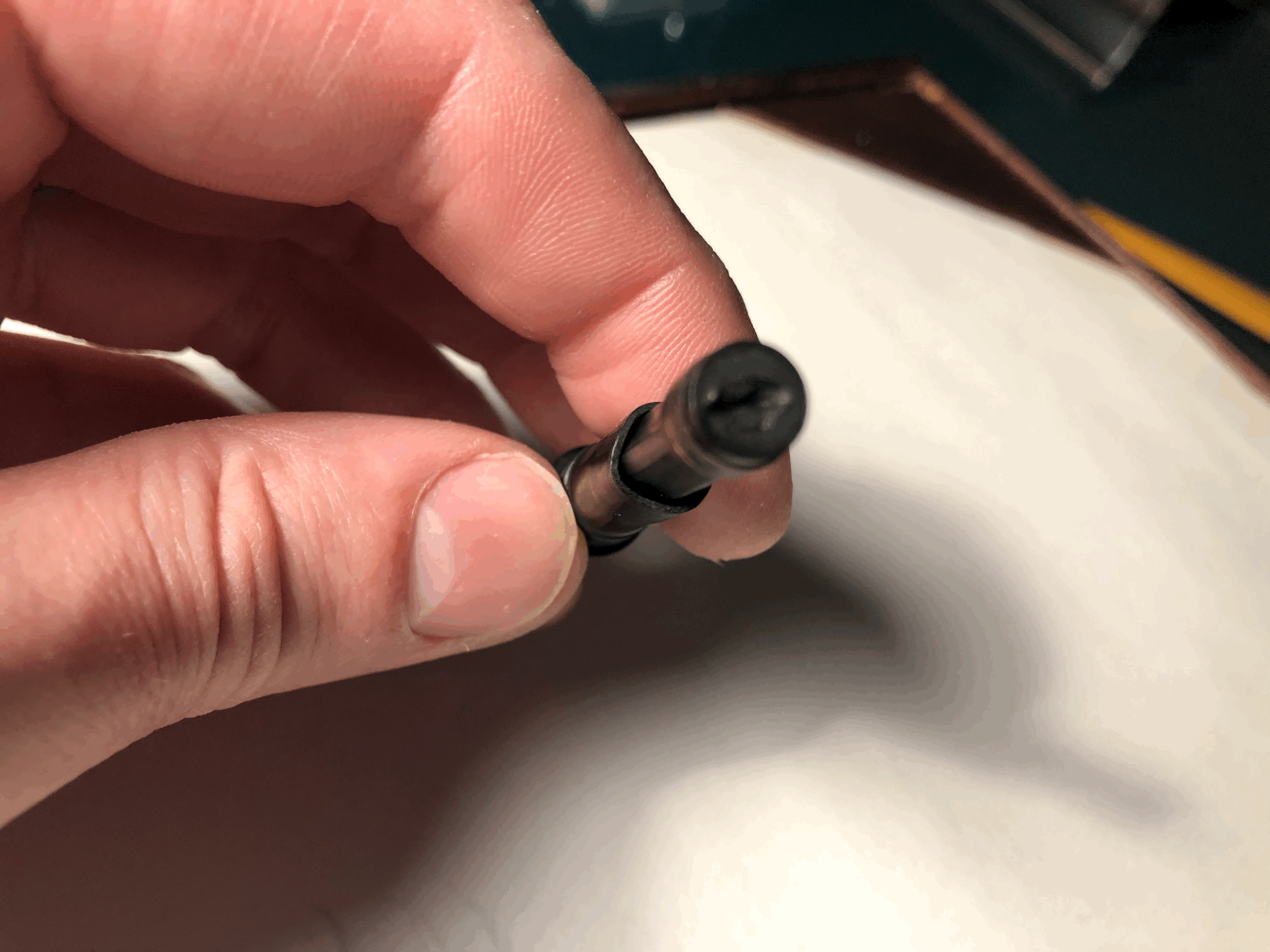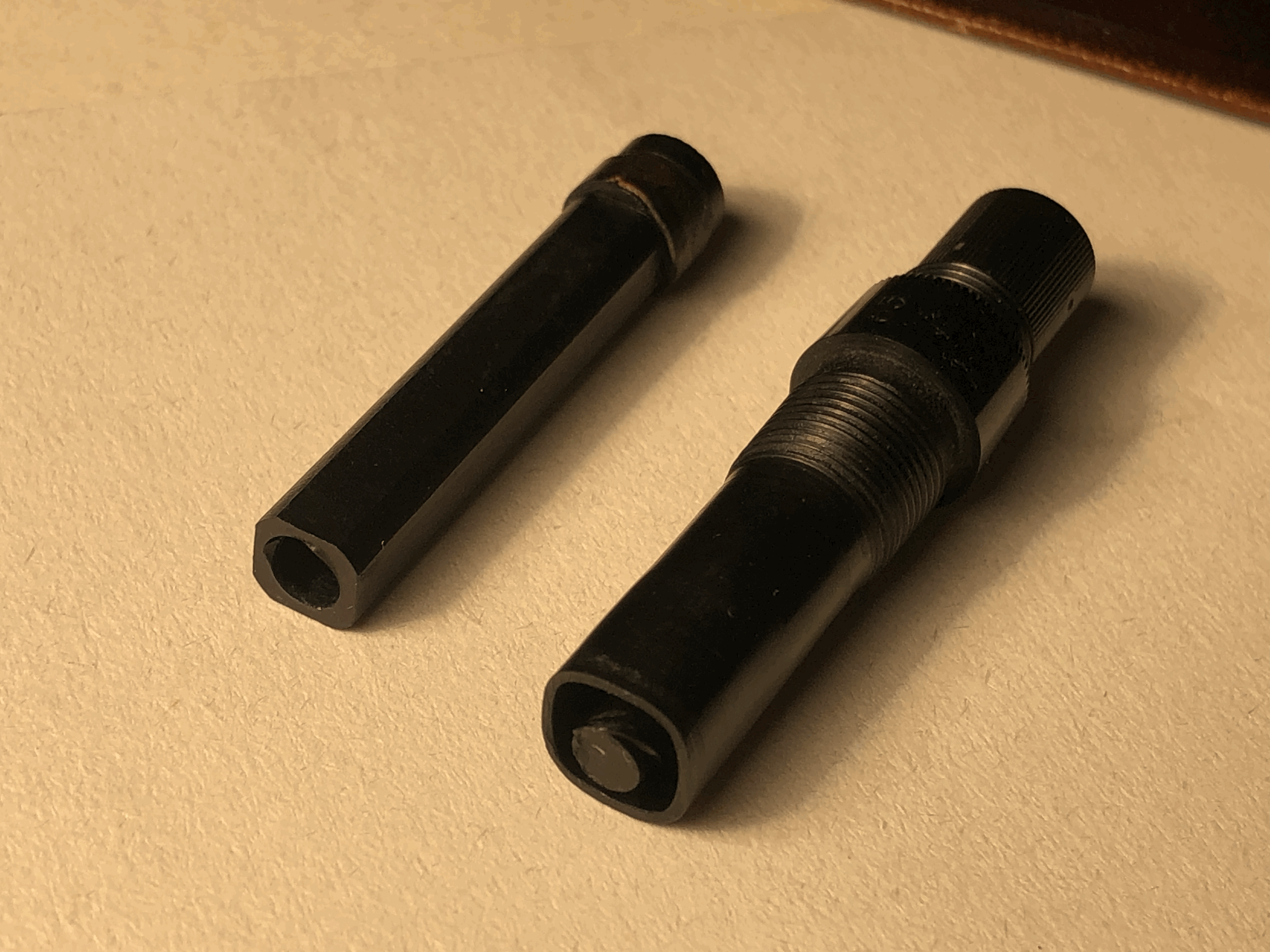 • PROBLEMA AL PISTONE: qui arriva la nota dolente, davvero non so che pesci pigliare... L'albero dello stantuffo, come si vede in foto, è a sezione quadrata, questo perché scorre all'interno di un tubo a sezione quadrata che gli impedisce di ruotare quando si gira il pomello per la ricarica permettendo un moto rettilineo anziché rotatorio; il problema è che questo non accade in quanto il tubo entro al quale deve avanzare e ritrarsi il pistone è troppo largo e solo quando il pistone è ruotato di 45° all'interno di esso lo tocca ma sfiorandolo solo appena, non è abbastanza stretto da fermare la rotazione del pistone scaricando il momento (penso che in fisica si dica così) in un moto rettilineo anziché rotatorio. Qualcuno ha idea su come si possa risolvere questo problema? Il meccanismo dovrebbe essere in ebanite che non mi pareva avesse i problemi di deformazione dalla celluloide, mi chiedo come sia possibile questa cosa. Il problema si vede nelle ultime due foto: nella penultima il pistone è in posizione corretta mentre nell'ultima è ruotato di 45° enon dovrebbe essere possibile.