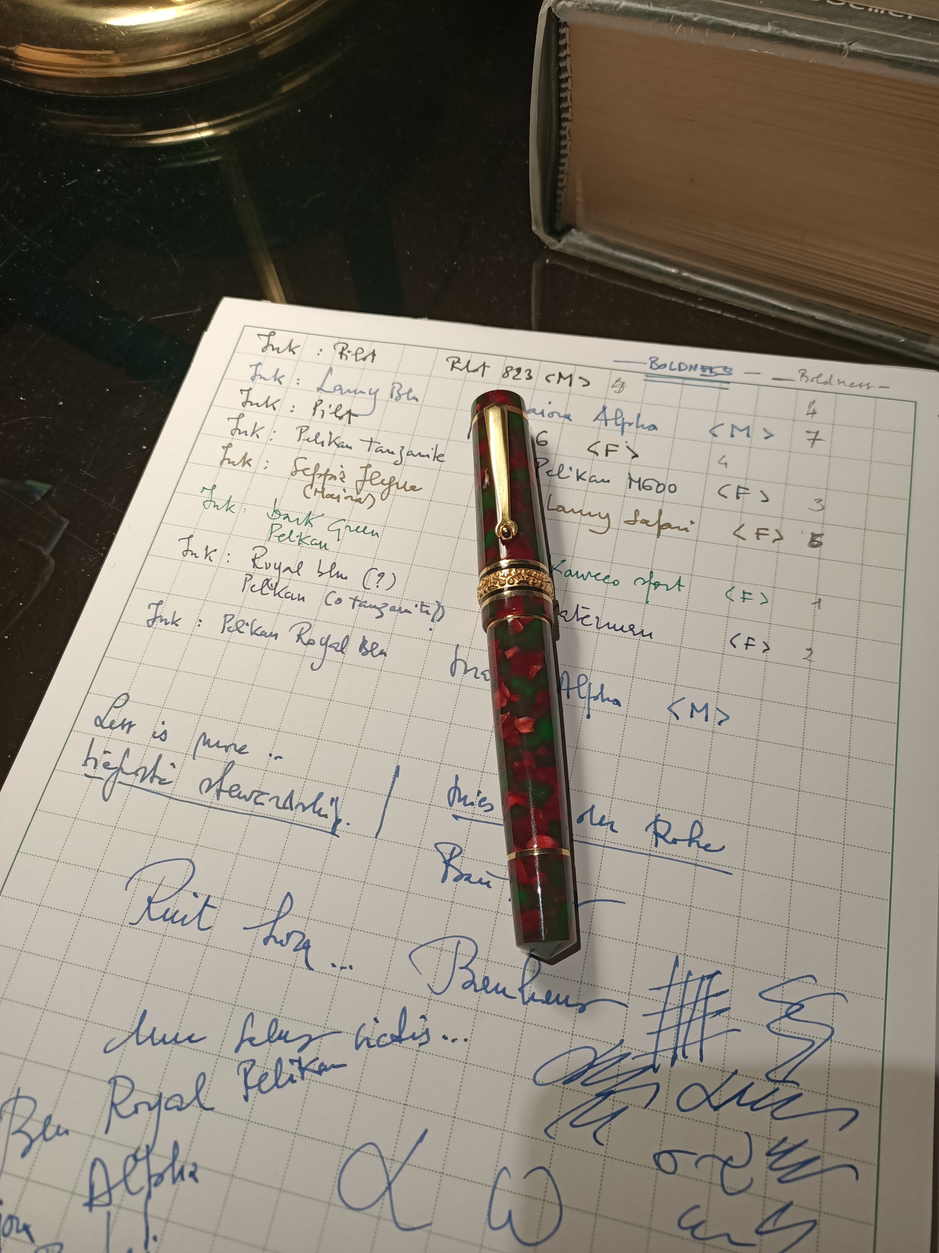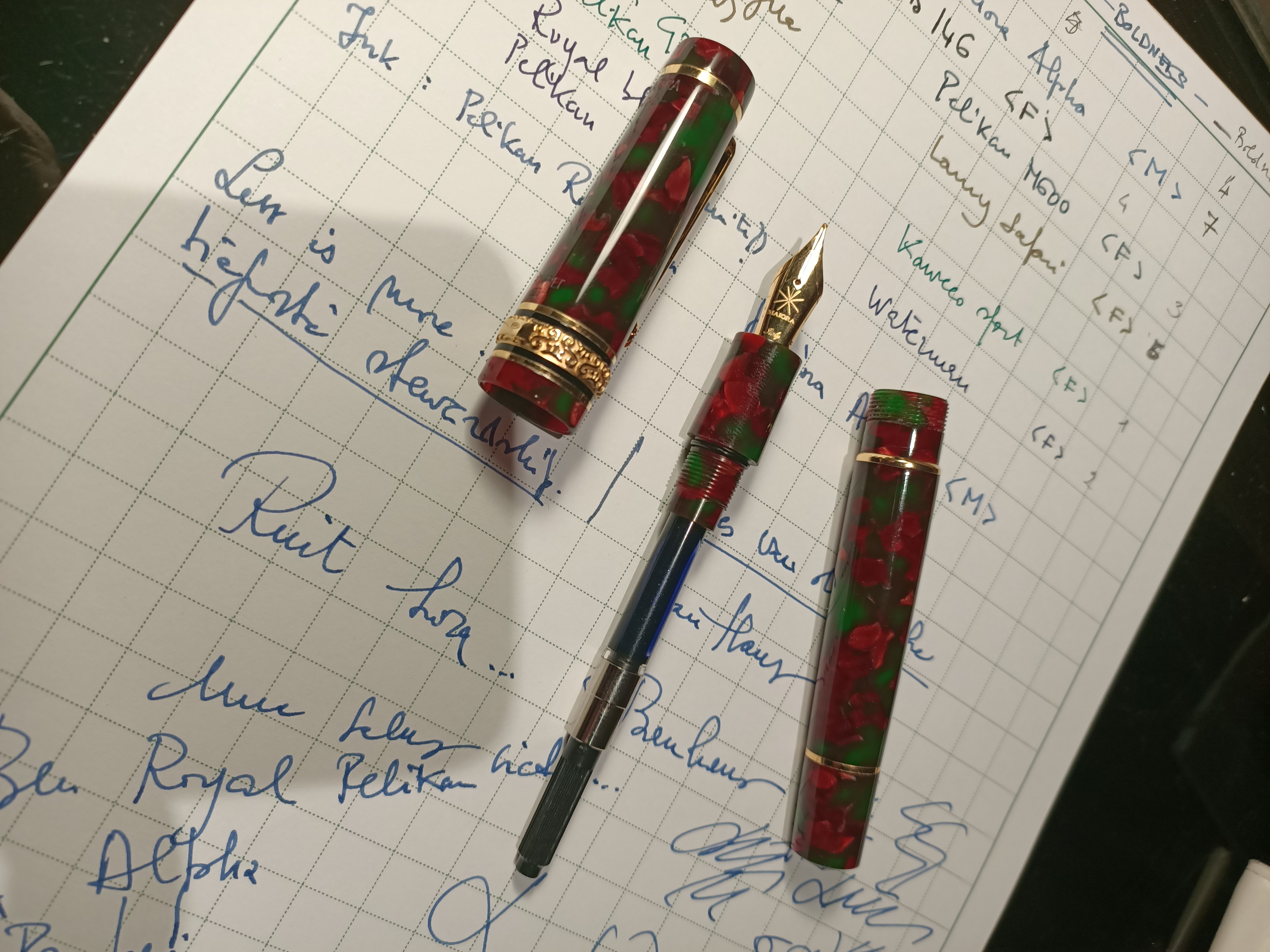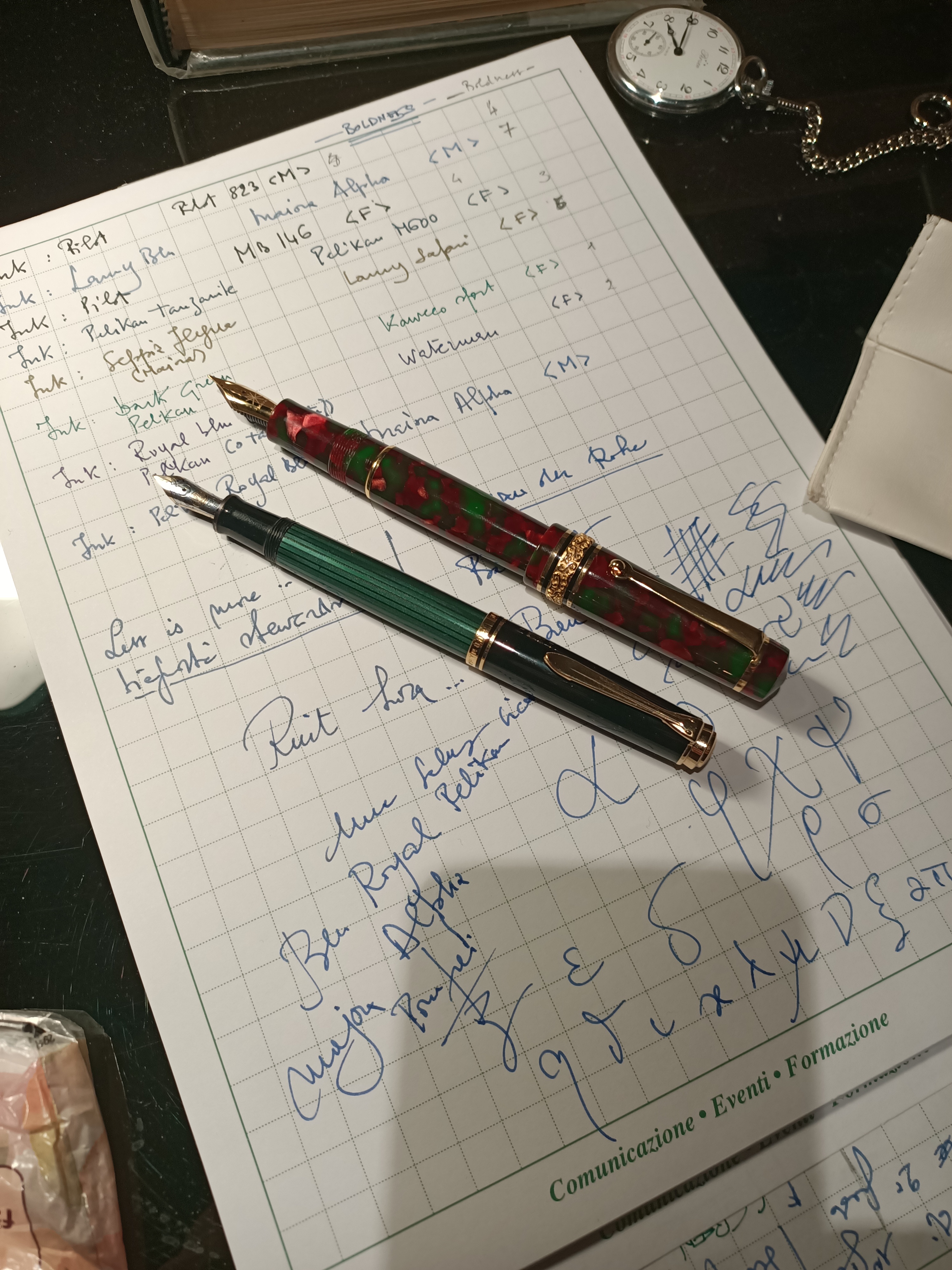 Allego qualche foto, con un paragone con la M600 per darvi un'idea delle dimensioni, e qualche pagina, con la comparazione di scrittura con le altre penne che ho attualmente inchiostrate.