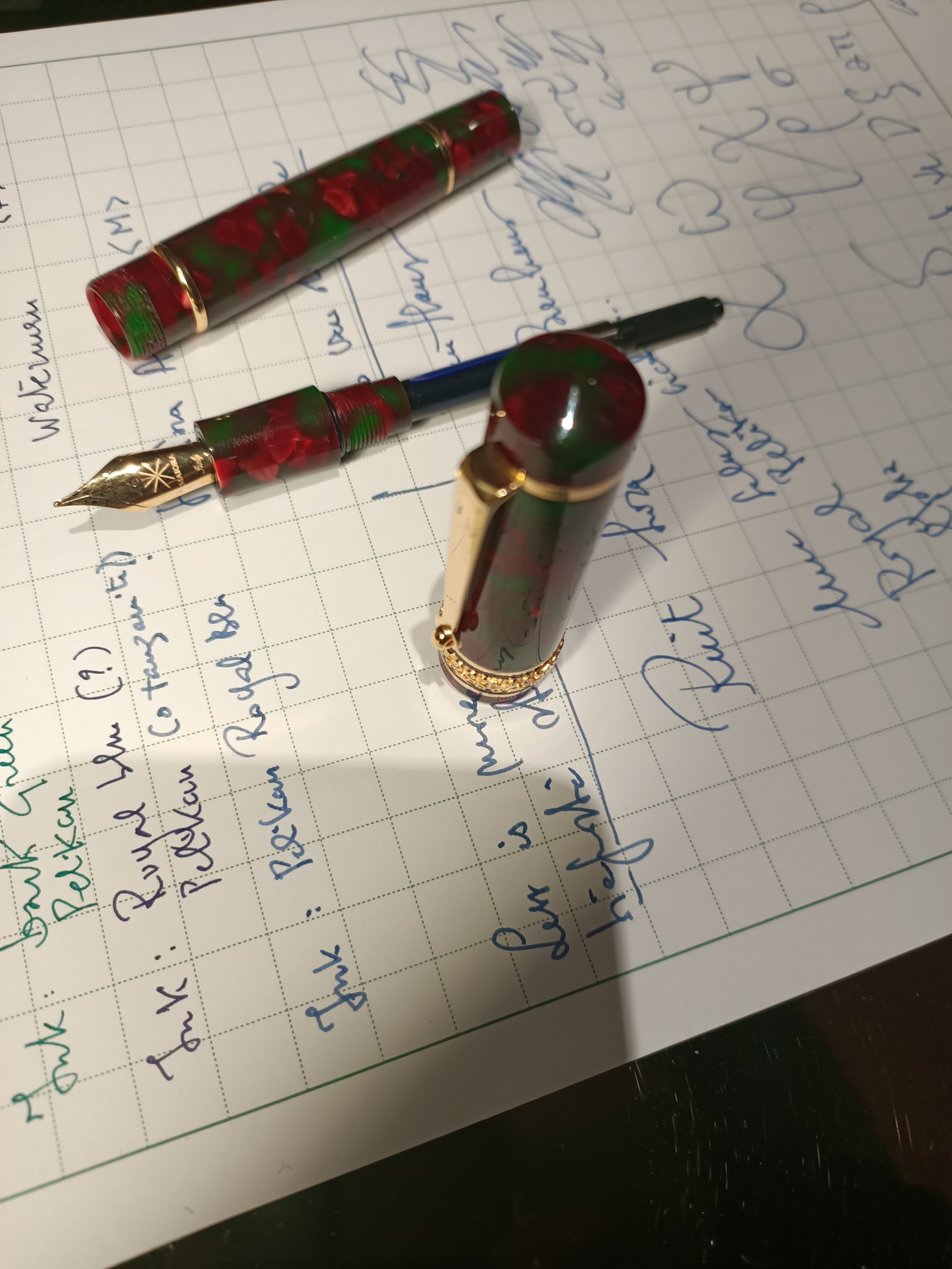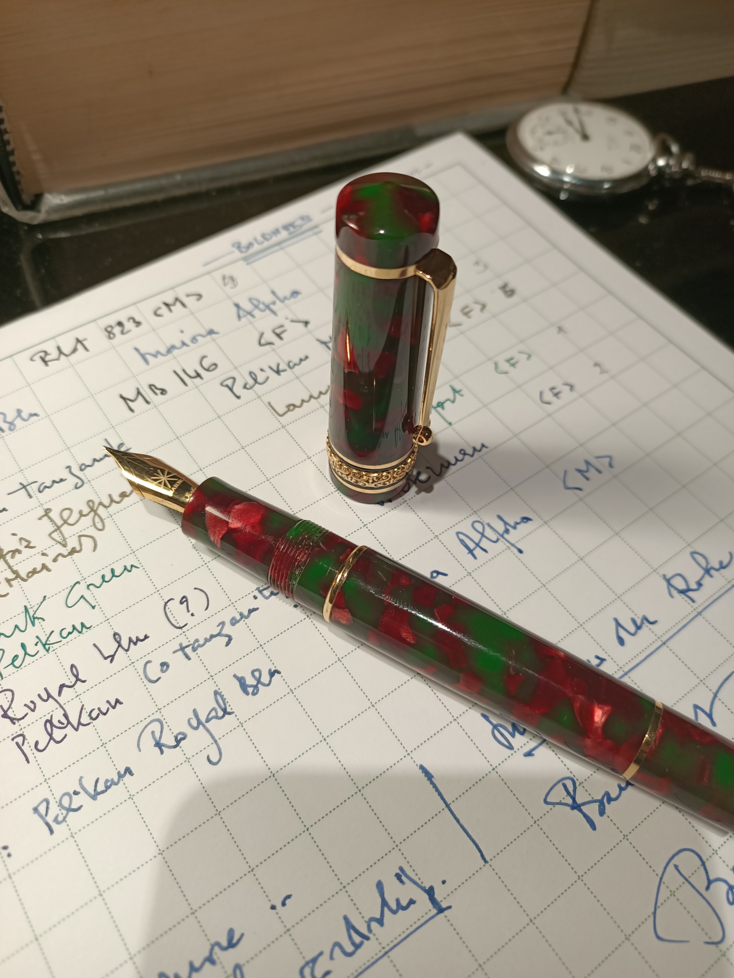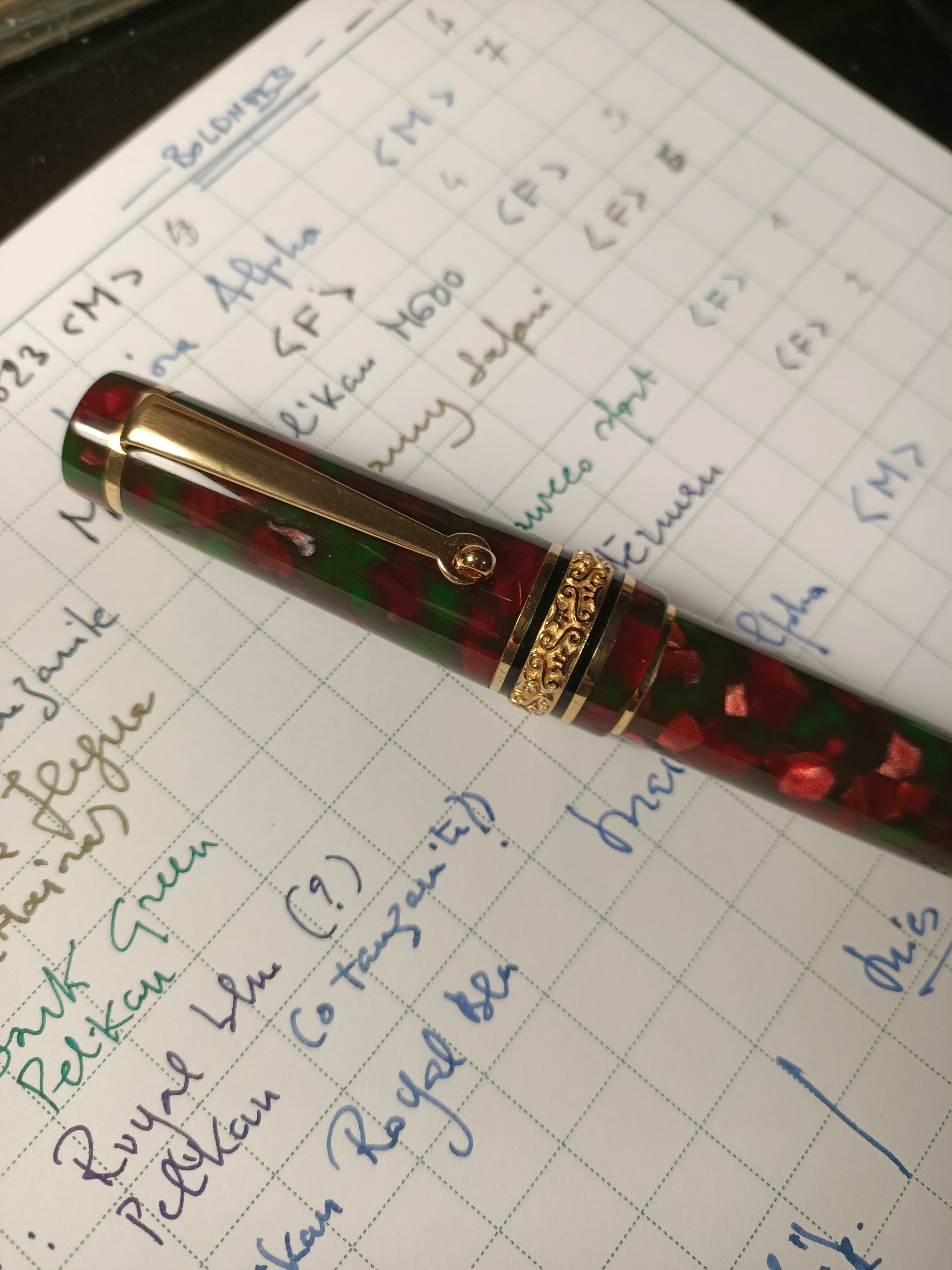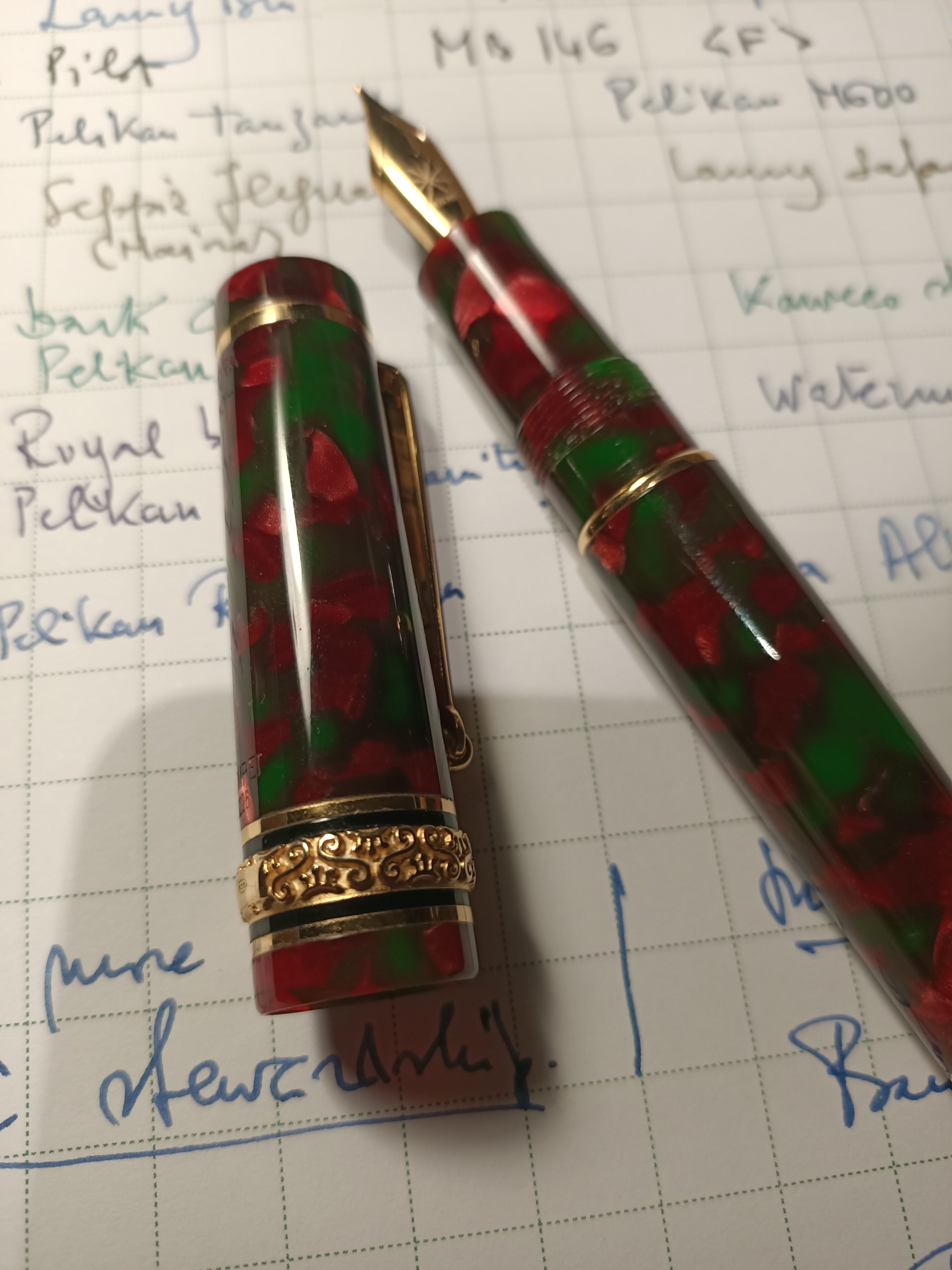Penna molto bella da vedere, indubbiamente, leggerina senza cappuccio (ma non ha senso secondo me scrivere con il cappuccio calzato): ben impugnabile e con una adeguata scorrevolezza del pennino (M). Fa la sua figura, soprattutto per l'opulenza dei colori (almeno a me piace la versione Pompei rosso verde scuro, davvero evocativo) e per la vera in argento massiccio placcata oro 18 K del cappuccio, che è meravigliosamente sfavillante. Bella anche la clip, dorata, anche se è piuttosto dura e per infilarla nel taschino occorrono due mani...