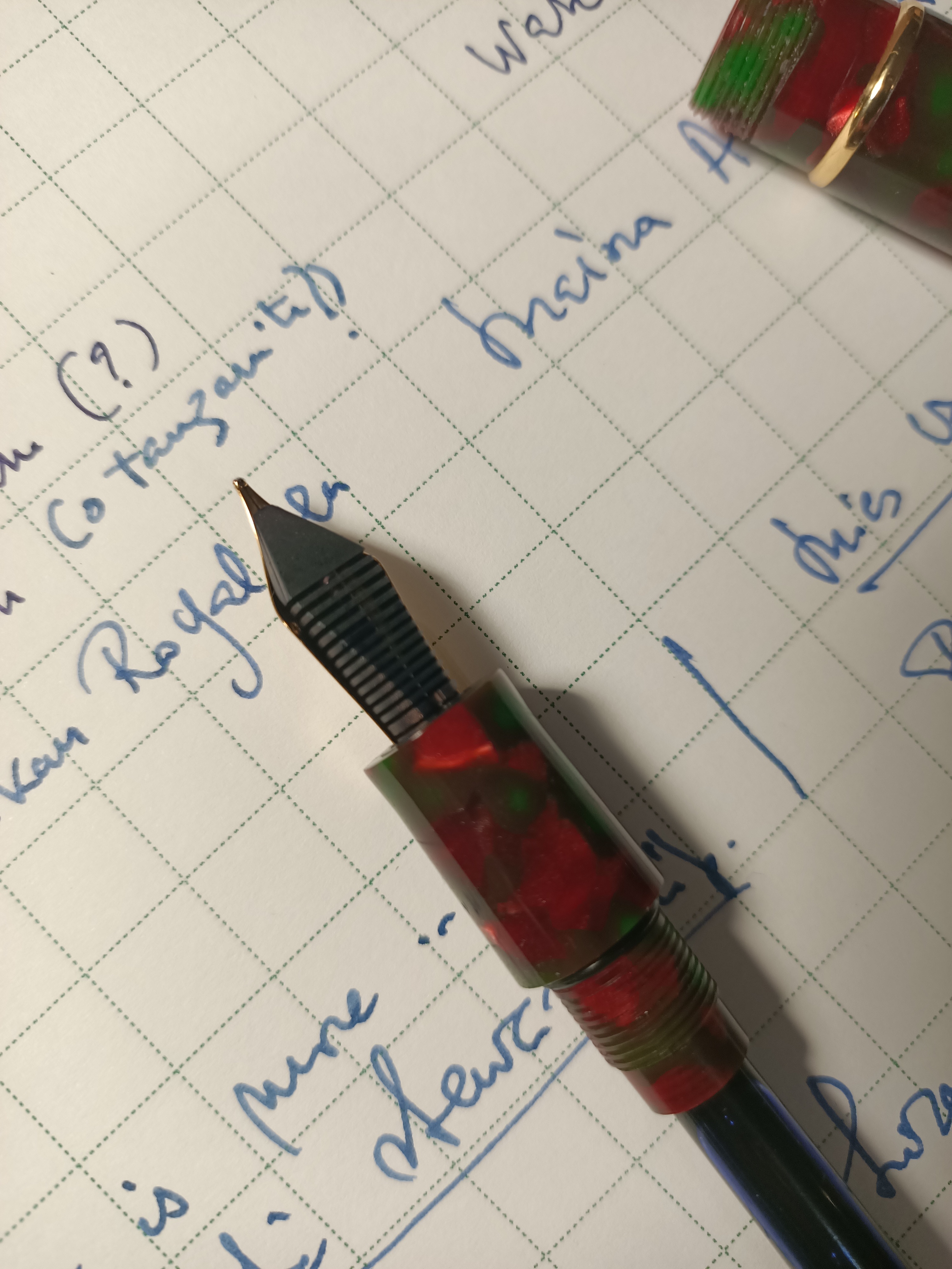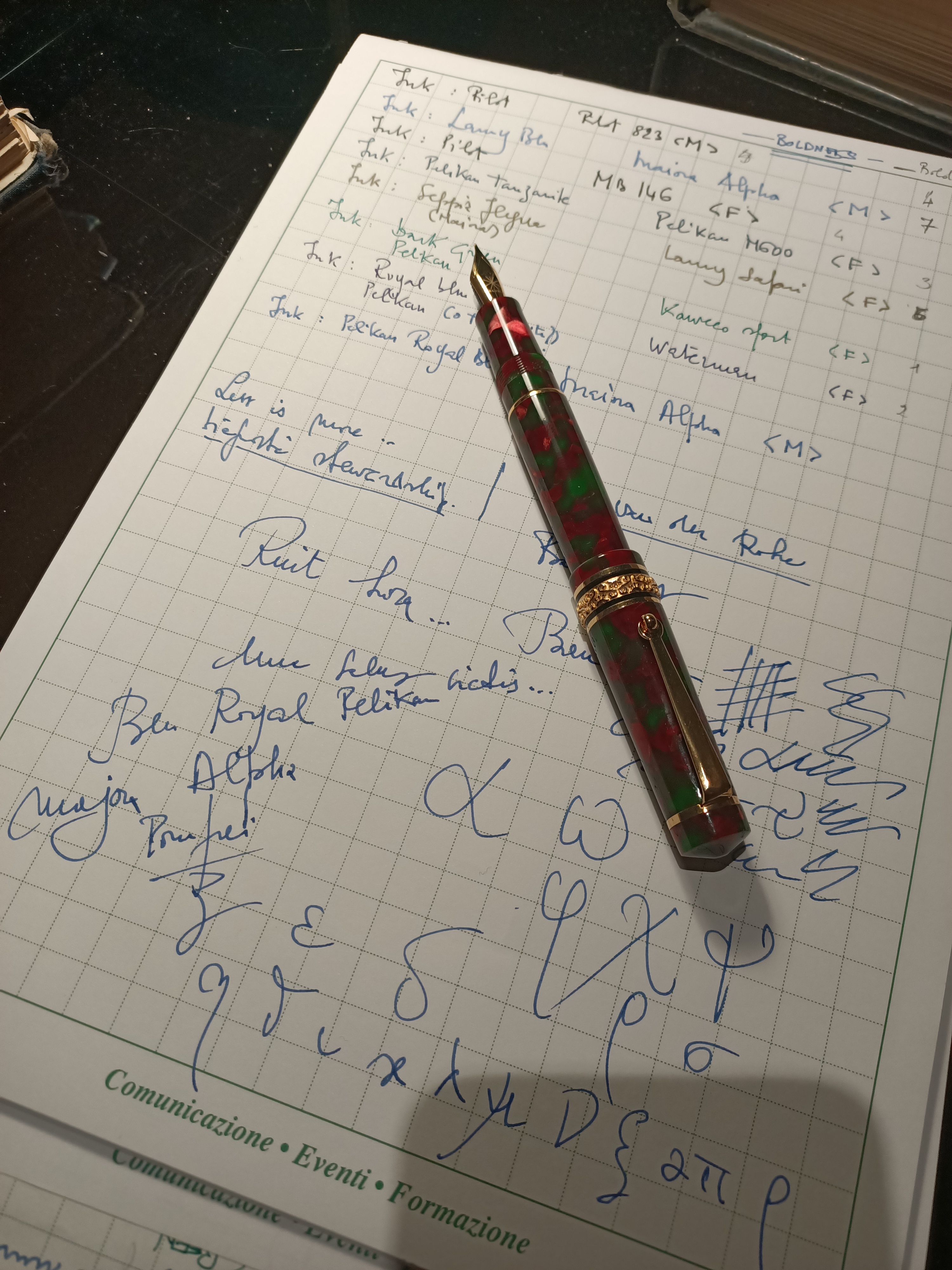 Devo dire che l'inizio non è stato dei migliori, forse per qualche impurità presente nel pennino (il flusso si bloccava repentinamente, o non partiva affatto, se non bagnando il pennino) almeno nei primi due giorni, tanto che stavo per riportarla indietro. Poi si è decisa a scrivere, di colpo, passando dal Seppia Flegrea (regalo del negoziante: un disastro, colore a parte, non ho capito se era colpa dell'inchiostro questo problema dell' inizio) al Blu Lamy e poi al classico Blu Royal Pelikan.