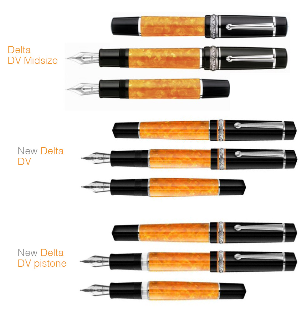 Sotto alla Delta DolceVita ho collocato le penne DV della "Nuova Delta", nelle due versioni a cartuccia/converter e a pistone, quest'ultima con la finestrella per l'ispezione del livello dell'inchiostro. Credo che tutti sapranno che il marchio Delta e il marchio DolceVita hanno due proprietari differenti, il che proibisce ai proprietari della Nuova Delta di usare il nome "DolceVita" per le loro penne (per questo DV, come un'allusione), e ai proprietari del marchio "Dolcevita" di chiamare le proprie penne con il nome di Delta...