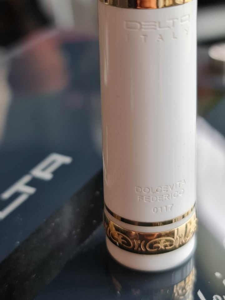 Buon pomeriggio amici del forum. Riesumo un vecchio argomento. Oggi mi è stato offerto questo Delta Federico che il venditore dice provenire da Martemodena.sansenri ha scritto: ↑sabato 18 marzo 2023, 19:43concordo Francesco.fufluns ha scritto: ↑sabato 18 marzo 2023, 13:44 Le DolceVita prodotte sotto il rebranding di MarteModena sono un discorso a parte, DolceVita, ma non al 100%. Non ho mai capito quale fosse la relazione te il marchio produttore e la casa di vendita, né mi interessa, ma le DolceVita di MarteModena mancavano di un elemento che io - almeno - considero essenziale nell’estetica di quella linea di penne: l’anello in argento massiccio “a cera persa” con il motivo pompeiano, sostituito da un anello in metallo privo di rilievo.