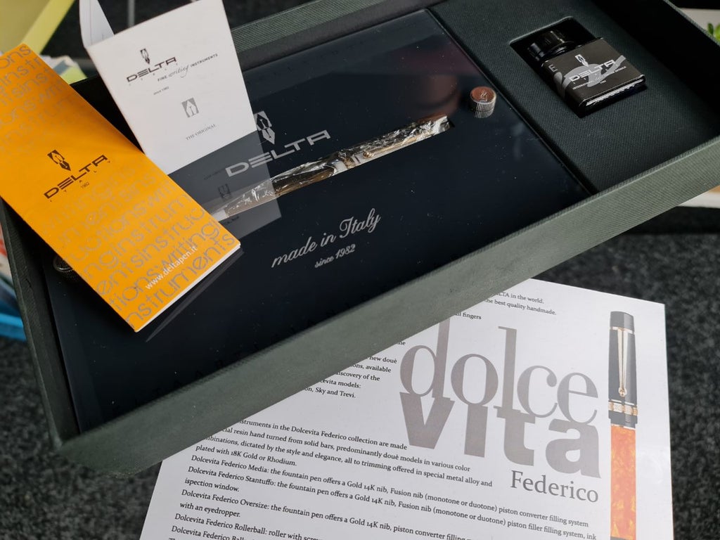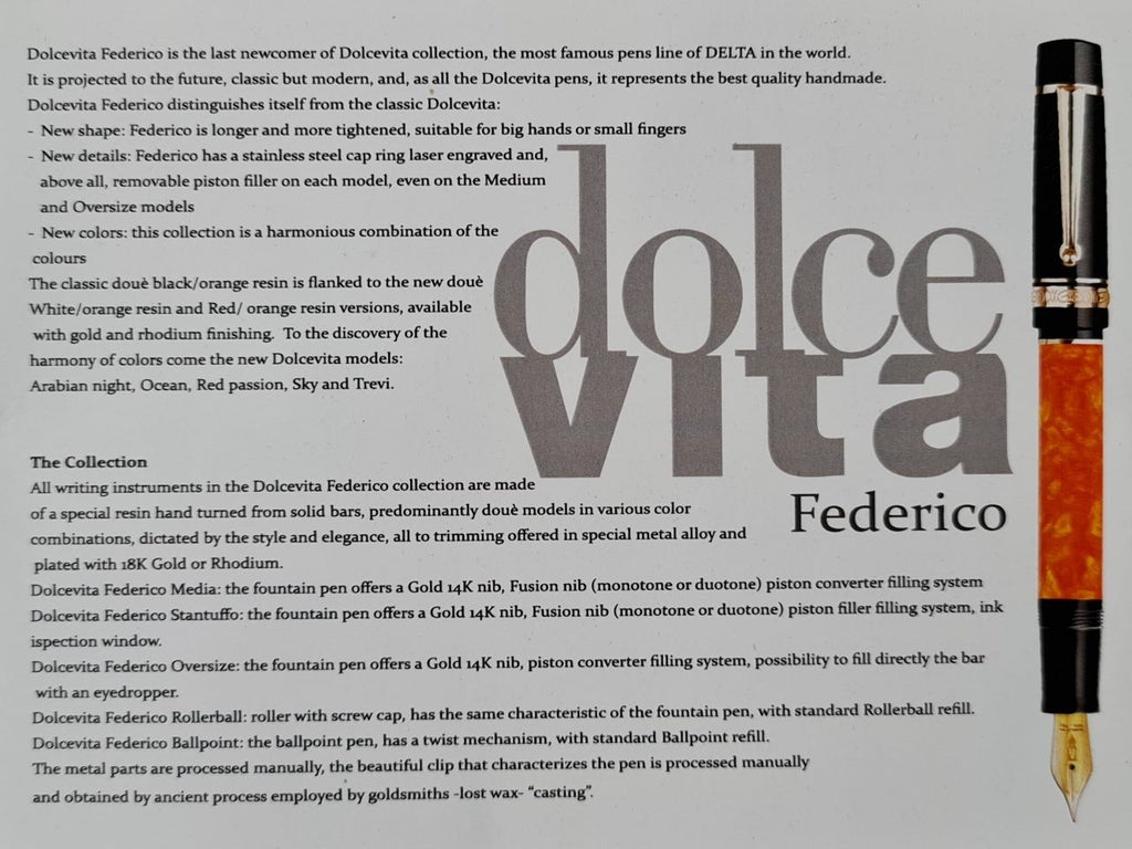 La Federico è la versione economica della Dolcevita, come scritto in precedenza la differenza è l’anello in metallo inciso al laser piuttosto che in argento in altorilievo. Ma la penna veniva comunque prodotta in casa Delta con la qualità che ha sempre contraddistinto la sua produzione.