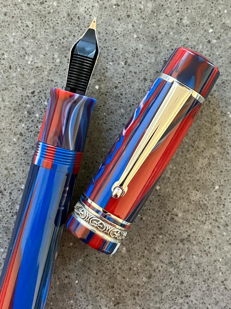è una bella celluloide, Delta aveva accesso a questa rossa e a quella verde, che vi somiglia molto nelle striature interne, e le aveva utilizzate per fare la Corsani Fantasy, una produzione custom per un noto negozio di Roma, sulla base della Delta Journal.