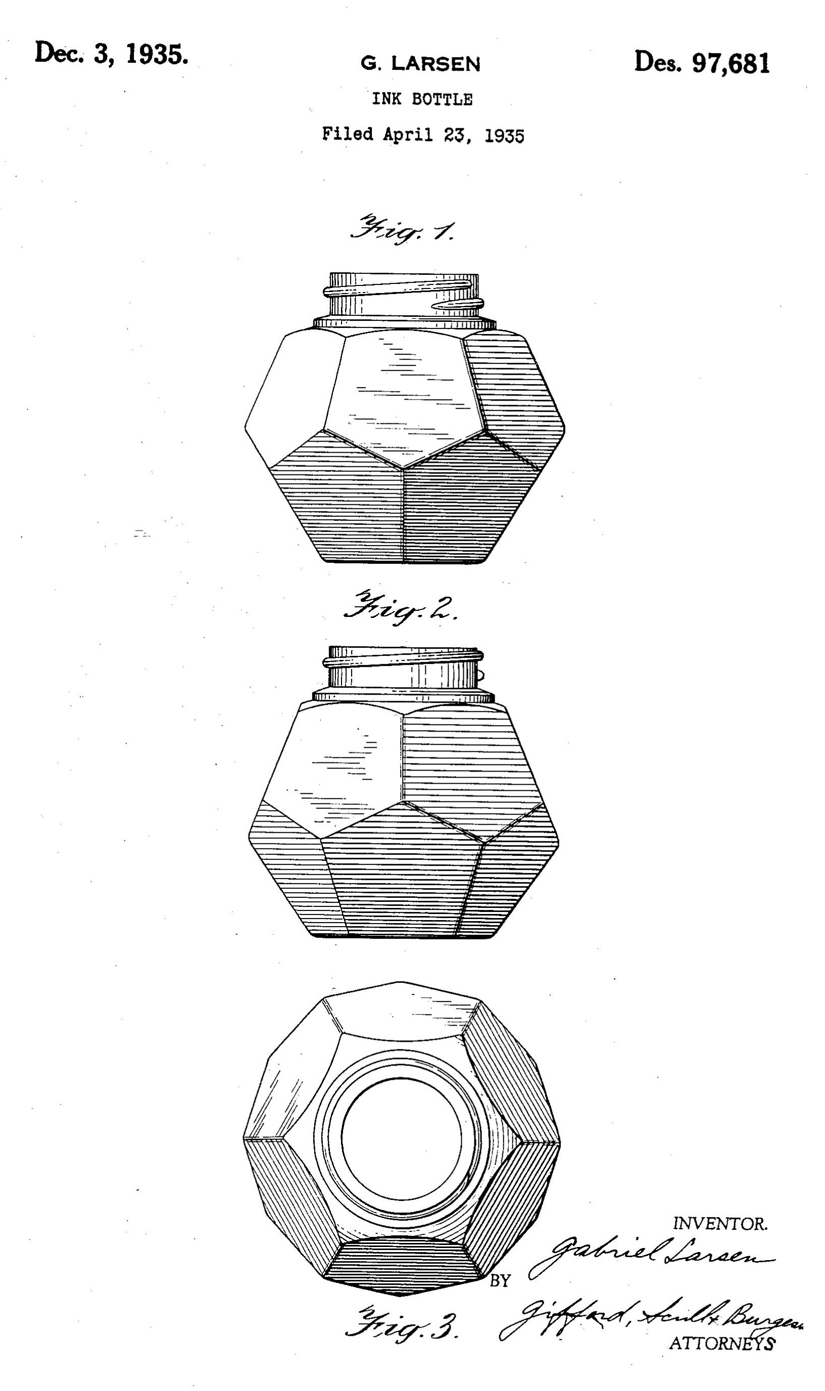 Il primo flacone “Tip-Fill” (numero ② nel primo allegato) oggi in presentazione era stato progettato da uno dei massimi creatori di stilografiche di sempre, il designer Gabriel Larsen, lo stesso che aveva disegnato la mitica Patrician e poi la Waterman #94, la Lady Patricia, anche nella versione Ink-Vue… (dal Wiki)