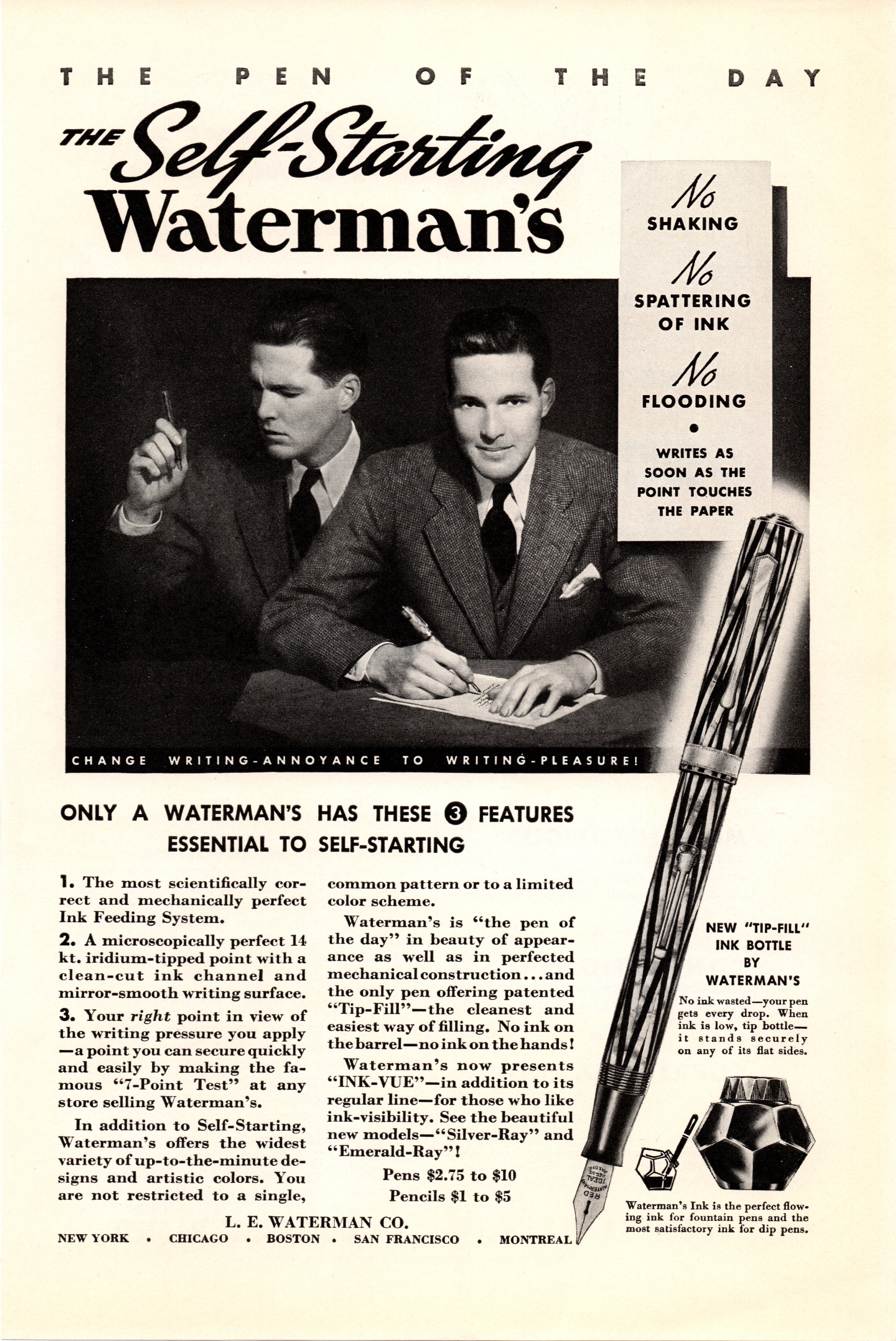 La situazione cambiò dal 1933, sicuramente anche in vista del cinquantesimo anniversario di attività della Casa (1884-1934), e nel 1936, per promuovere più efficacemente la vendita dei quattro nuovi flaconi di inchiostro mostrati in apertura (stilisticamente tutti così pienamente quanto irresistibilmente Art Déco), il marketing della Waterman decise di presentarli come dotati di “special features” (caratteristiche speciali), non solo evidentemente per il design, ma anche per il tipo di impiego per essi suggerito.