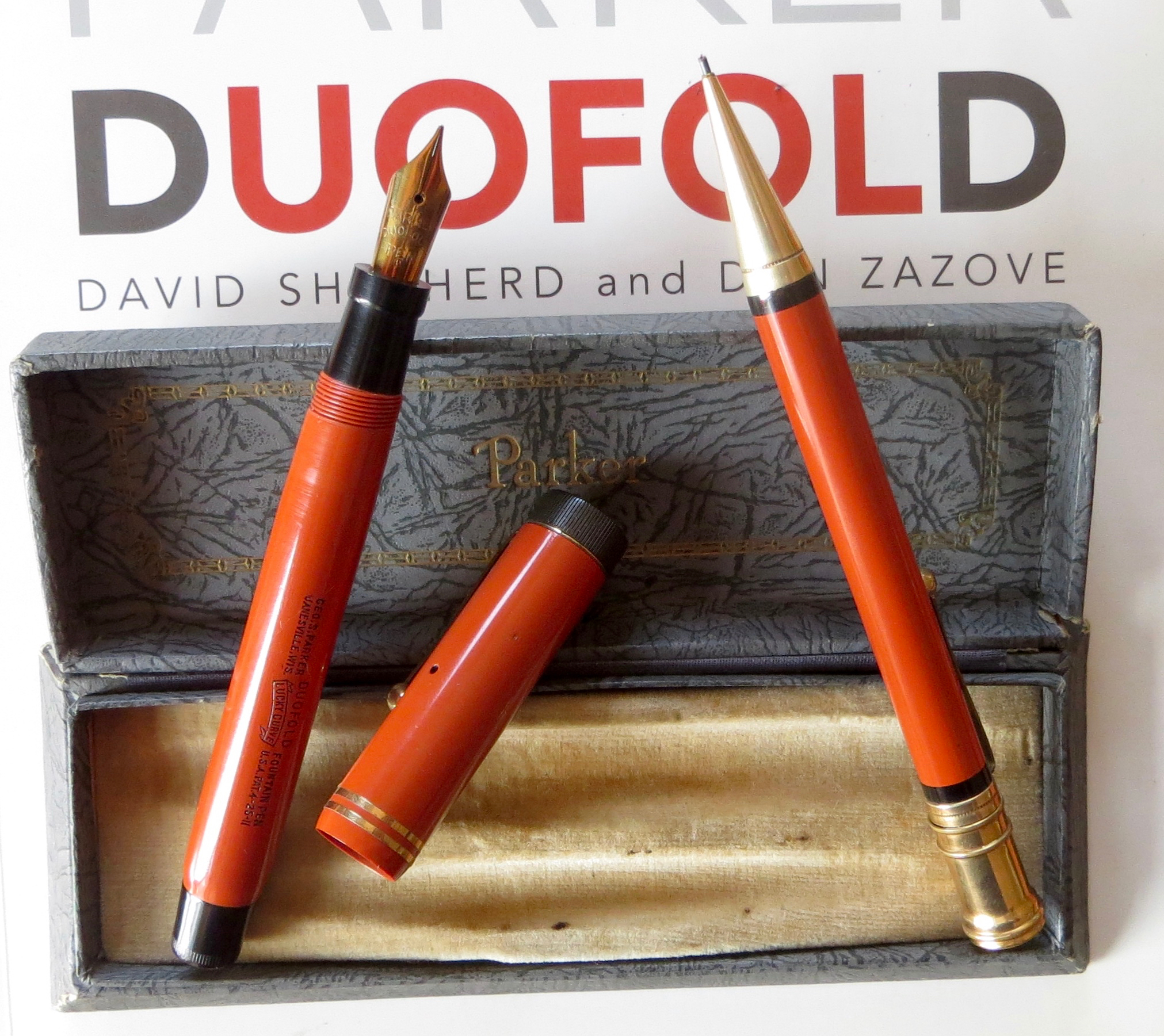 1928-29 Parker Duofold Senior penna e matita, "Red Permanite", con scatola.