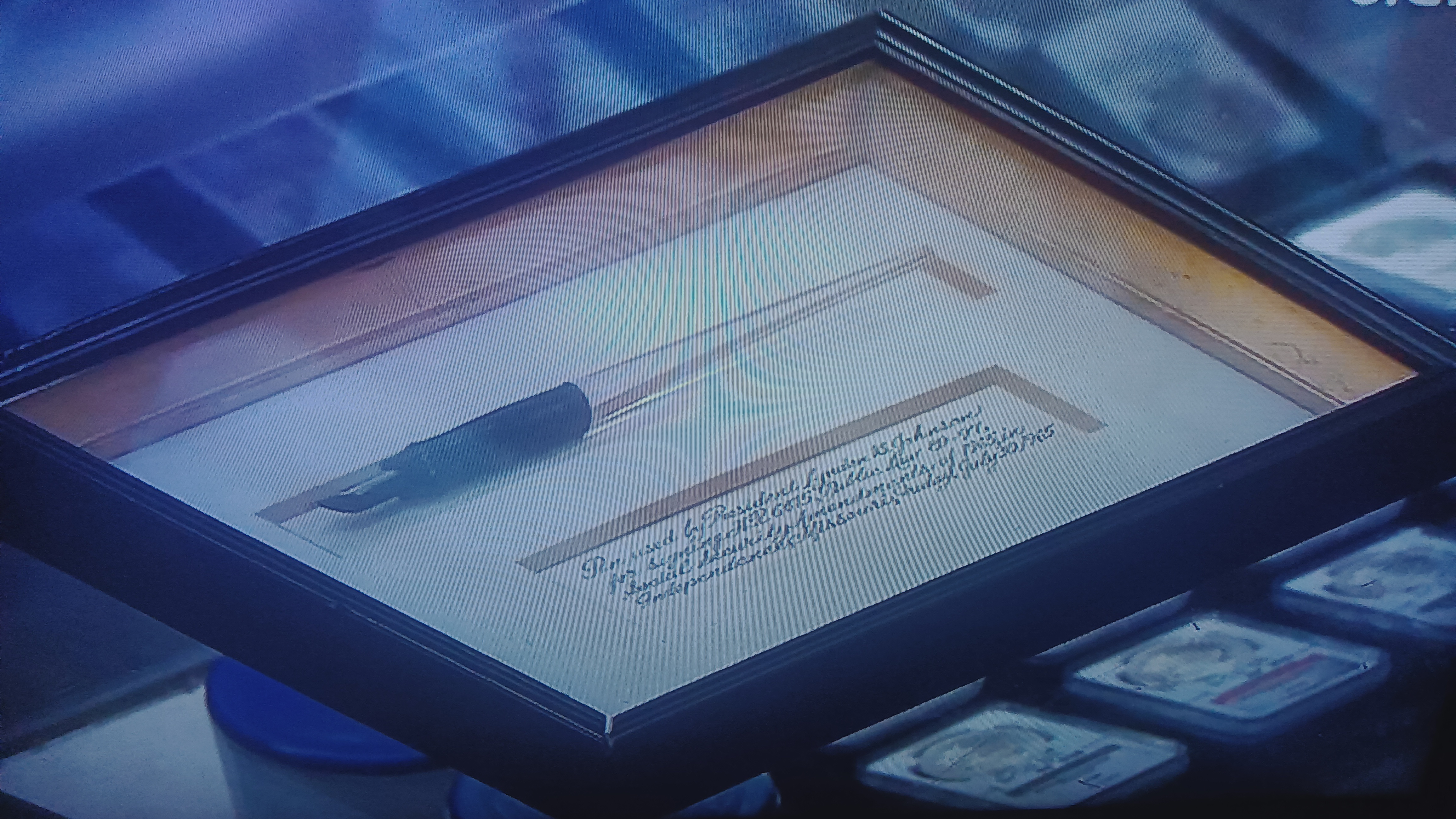 Nella puntata di "Affari di famiglia" in onda in questo momento su Cielo, una persona ha provato  a vendere una penna usata dal presidente Lyndon Johnson per firmare una legge. Ho fatto una foto, scusate la scarsa qualità.