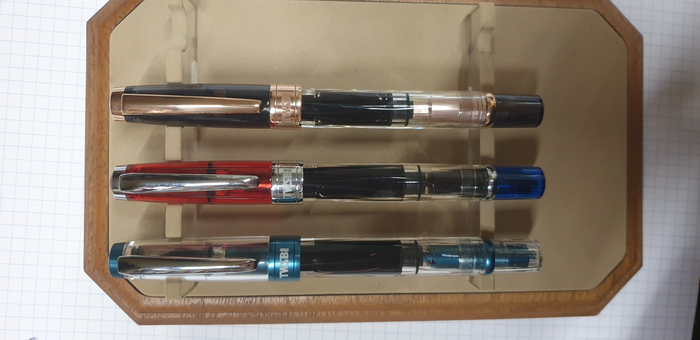 Non avevo specificato "Diamond" 580. La RBT è quella Rosso Blu Trasparente. Non ho foto singole pertanto Ti allego una fotografia di tre Diamond 580, quella in centro è la RBT a sinistra una AL ed a destra la Tua preferita Rose Gold. Rispetto alle altre due ha il pistone di caricamento in plastica anzichè in lega di alluminio mentre, come già saprai, i gruppi di scrittura sono intercambiabili. La Rose Gold monta un pennino fine fantastico ma preferendo portarmi appresso un medio ho preso la RBT.