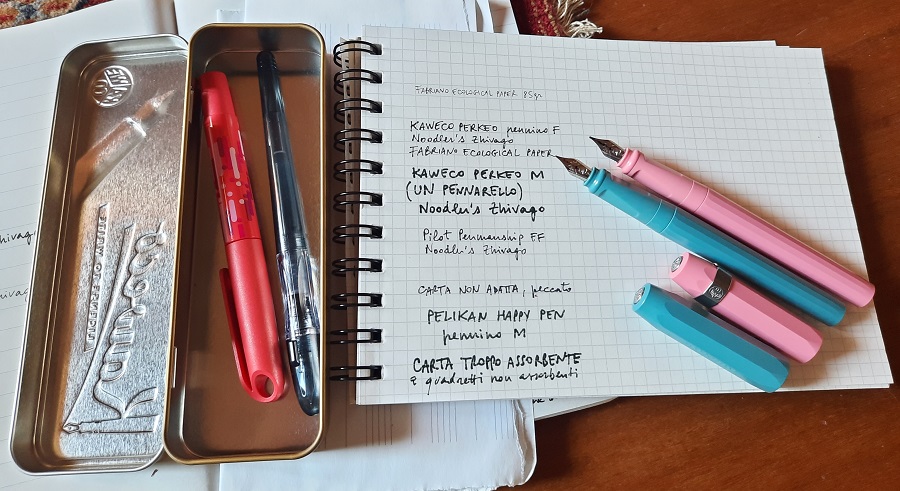 In questa foto lo si vede aperto, con dentro le altre due stilografiche "da battaglia" che ho scelto di portare sempre con me: una Pelikan Happy Pen M e una Pilot Penmanship EF. Accanto si vede una prova di scrittura su blocco Fabriano "ecological paper".
