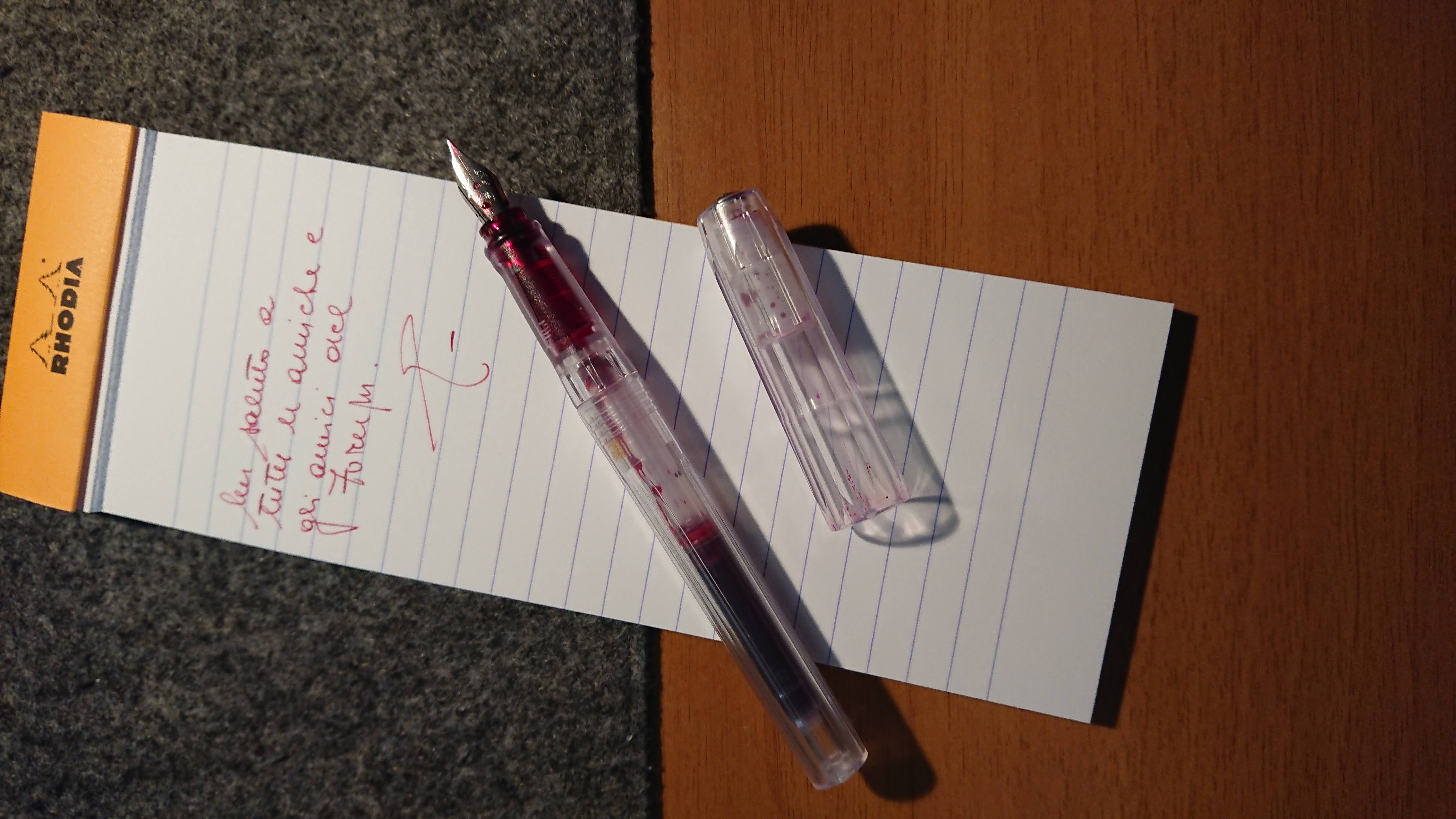 Concordo sul giudizio positivo della Perkeo "da battaglia" una penna poco menzionata ma anche secondo me molto valida. Rispetto ad altre concorrenti della stessa fascia di prezzo, trasmette una bella sensazione di robustezza. Inoltre scrive molto bene, mai una falsa partenza o uno skip anche se lasciata ferma per qualche tempo. Io ce l'ho in versione all clear e la penna prende il colore delle cartucce che si caricano, nel mio caso rosso. La trovo perfetta per le sottolineature e per prendere note a margine di testi (...da qui la scelta dell'inchiostro rosso). In più, essendo sfaccettata, non si muove di moto proprio e non ha la propensione a saltare giù dalla scrivania, anche se lasciata senza clip.