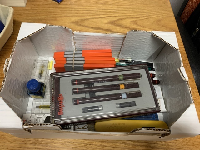 Del poco che si è salvato c’è anche una scatola di cartone con degli strumenti da disegno tecnico usati e anche altre cose.