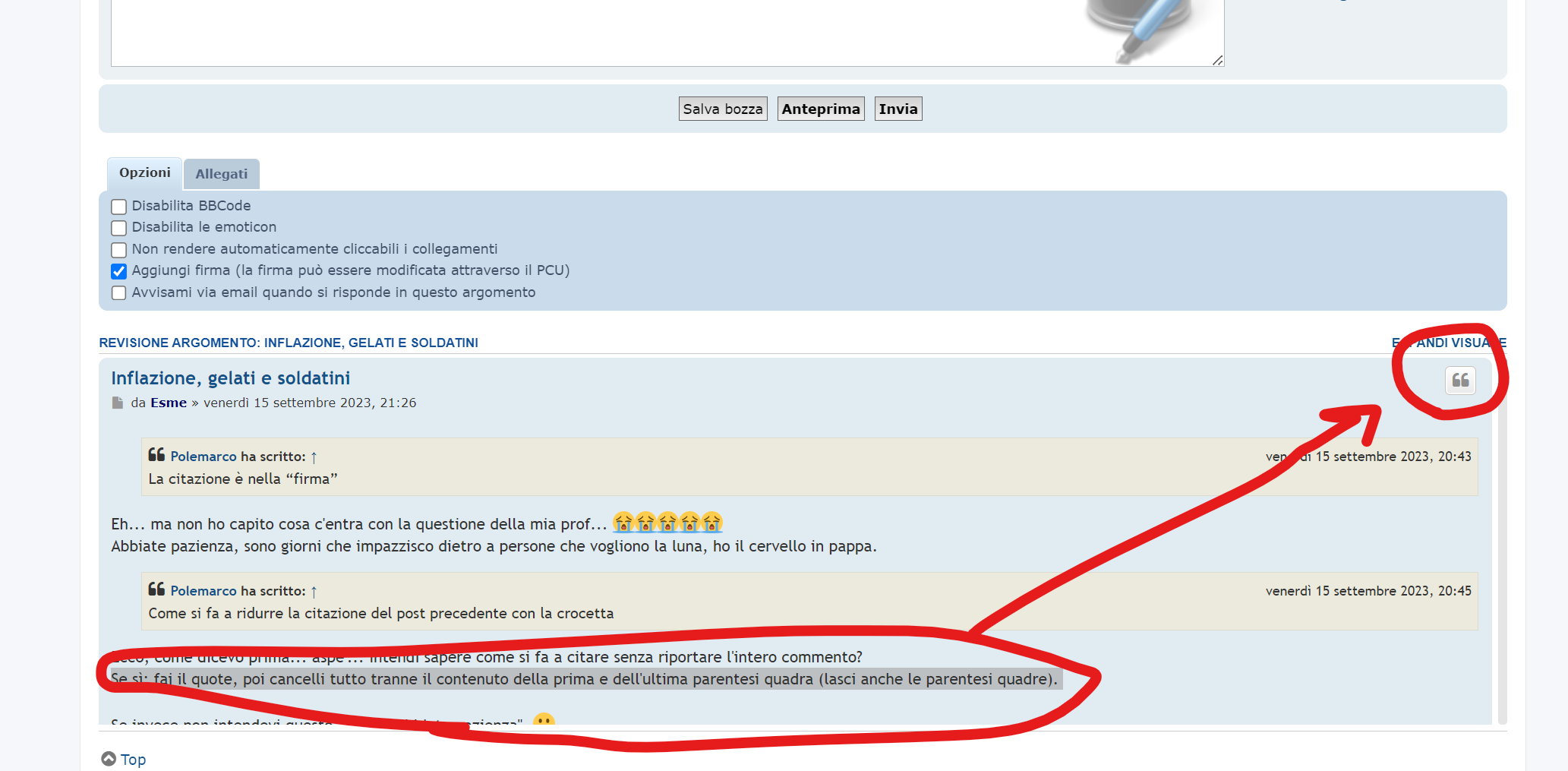 Ecco, come dicevo prima... aspe'... intendi sapere come si fa a citare senza riportare l'intero commento?