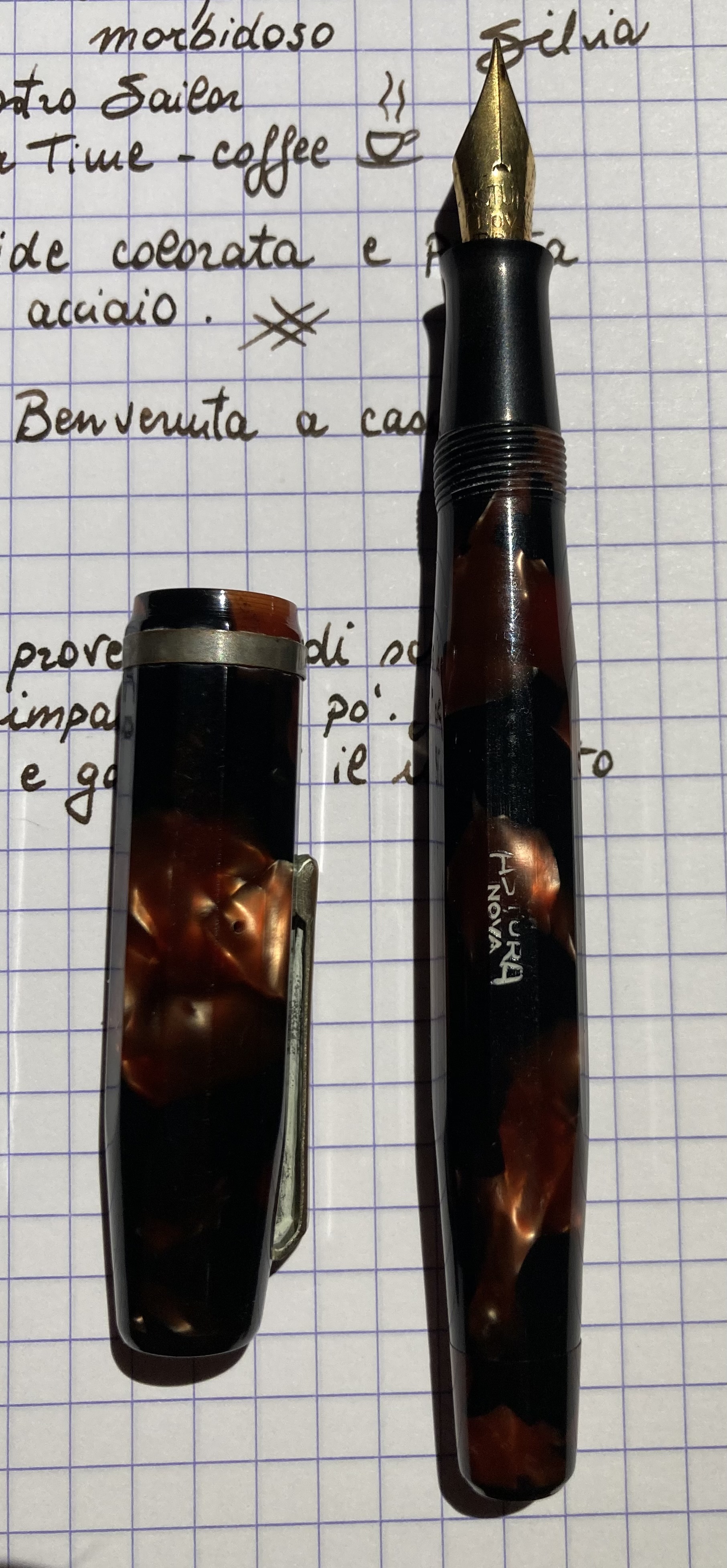 Un giorno luciderò la clip ed il pennino. Ma prima voglio prendermi il tempo di studiare eventuali controindicazioni e come evitare assolutamente di toccare la celluloide con il lucidante. Pensavo di inserire sotto la clip un foglino dí domopak alluminio, che è sottilissimo ed impermeabile