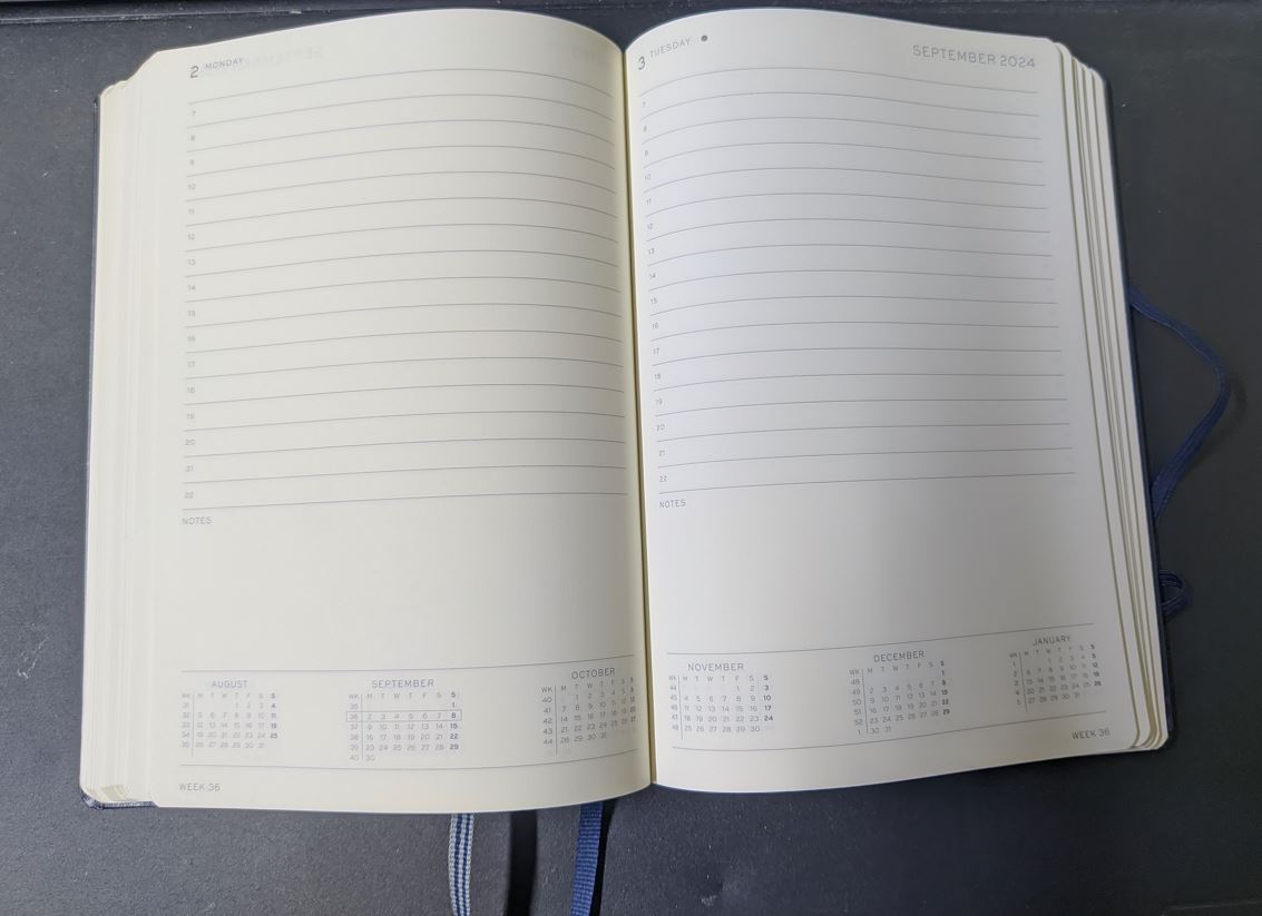 Per me nessuna scelta: sono ancora a metà del notebook A5 quadrettato e riquadrato di MD Paper, senza indicazione dei giorni. Nonostante abbia acquistato agende giornaliere negli ultimi 35 anni, ho smesso perché le uso come diario e non sempre scrivo tutti i giorni. Una volta riempivo i vuoti con foto, disegni e altro (ricordo certe Smemorande anni ‘90 divenute altissime!) ma ora sono meno produttiva e mi spiace lasciare pagine bianche.