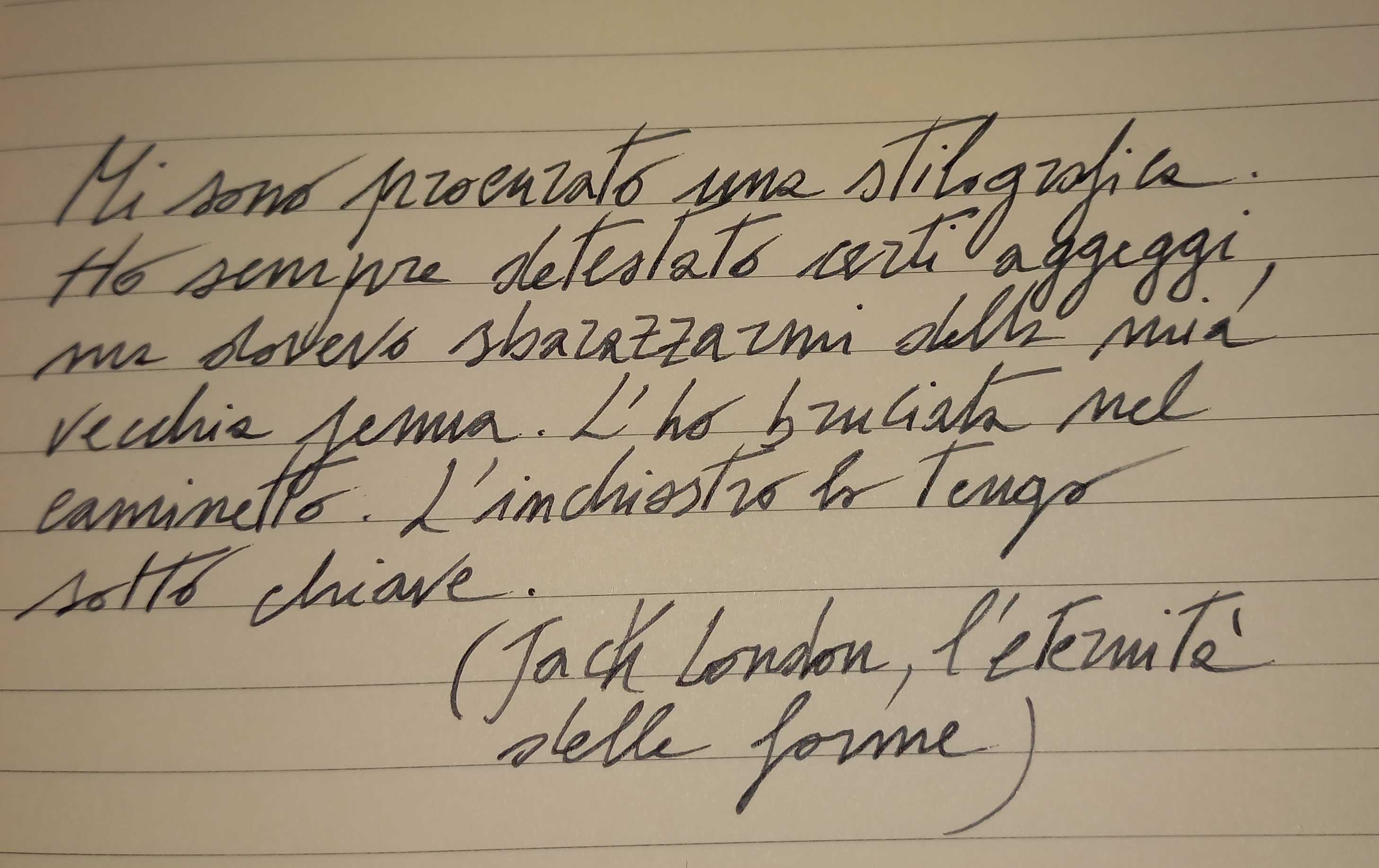 Buongiorno a tutte, a tutti. Ultimamente leggo molto più del solito e mi sono imbattuto in alcune stilografiche letterarie, diciamo così. In questo racconto di Jack London, "L'eternità delle forme" (lo si trova nel volume "Le mille e una morte", Adelphi) la penna e l'inchiostro diventano praticamente co-protagonisti di un racconto cupo. Devo poi recuperare un passaggio in Sandor Marai. Vi è mai capitato di trovare citazioni in tema?