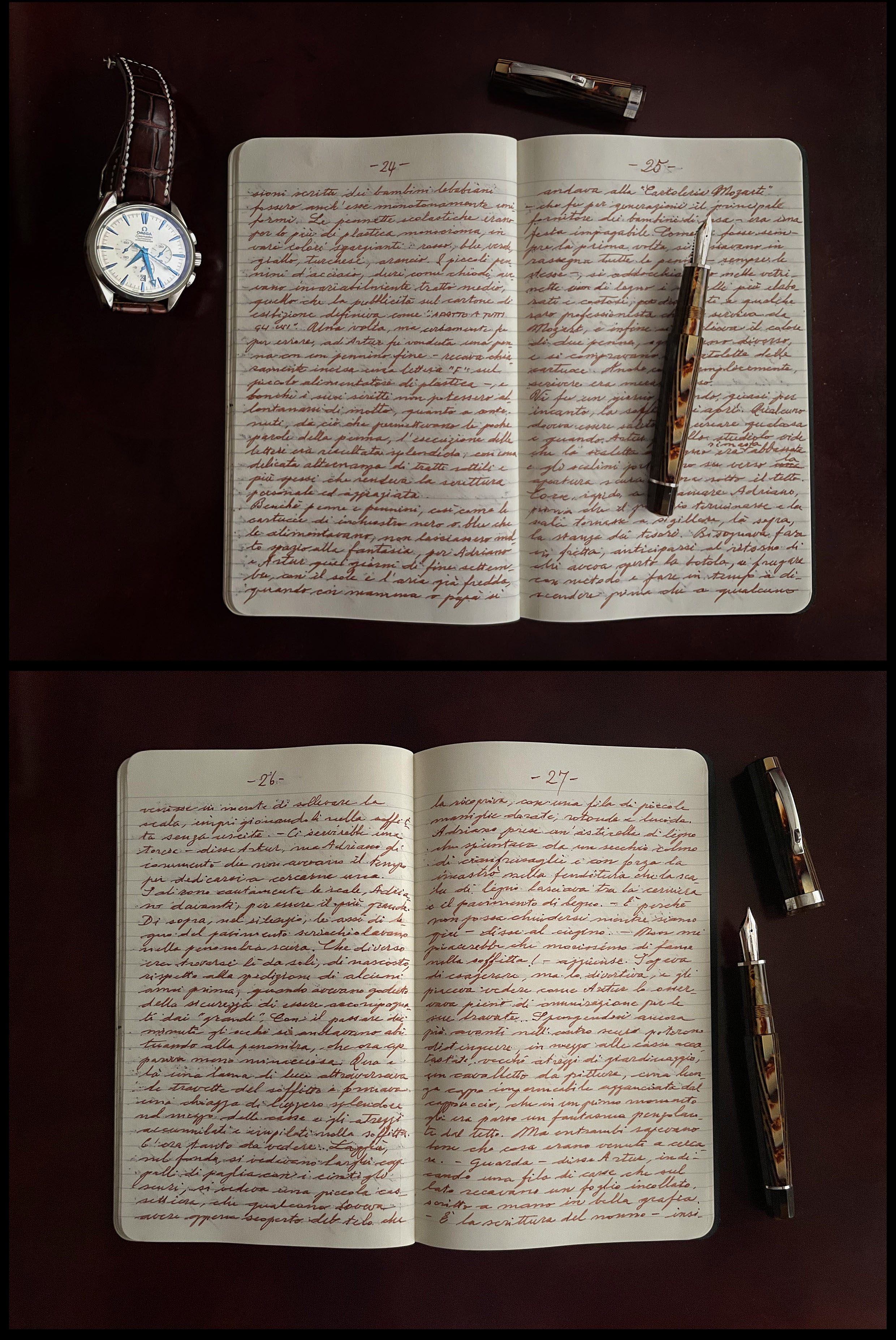Il raccontino é stato ovviamente scritto a mano, con una delle mie fidate penne Omas: una "New" Milord in celluloide Arco marrone.