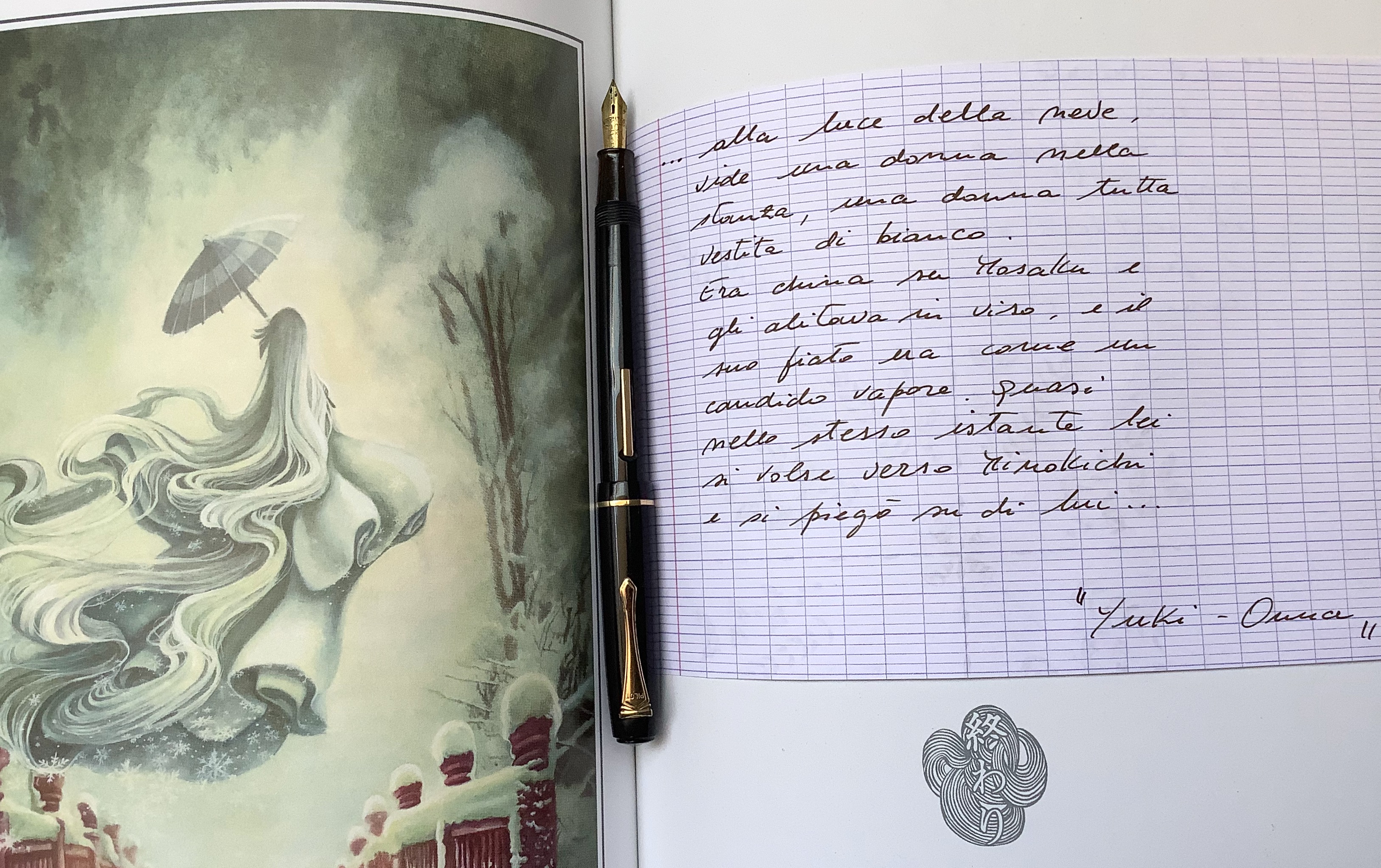 Sempre dal Giappone, uno stralcio del racconto "Yuki-Onna" (Donna, Signora o Principessa delle Nevi, ciascuno scelga la traduzione che più gli aggrada) tratto dal bellissimo libro illustrato "Storie di Fantasmi del Giappone".