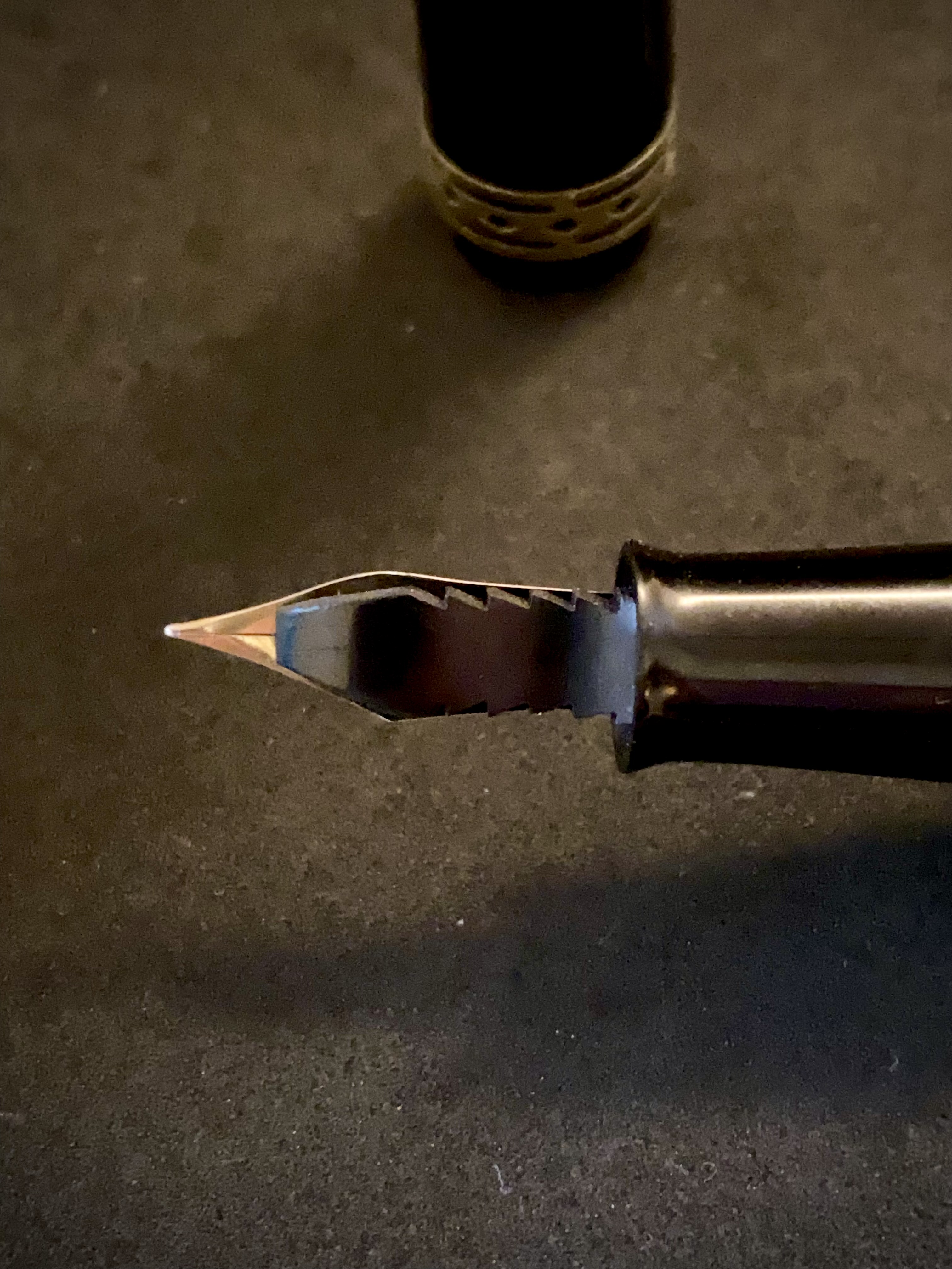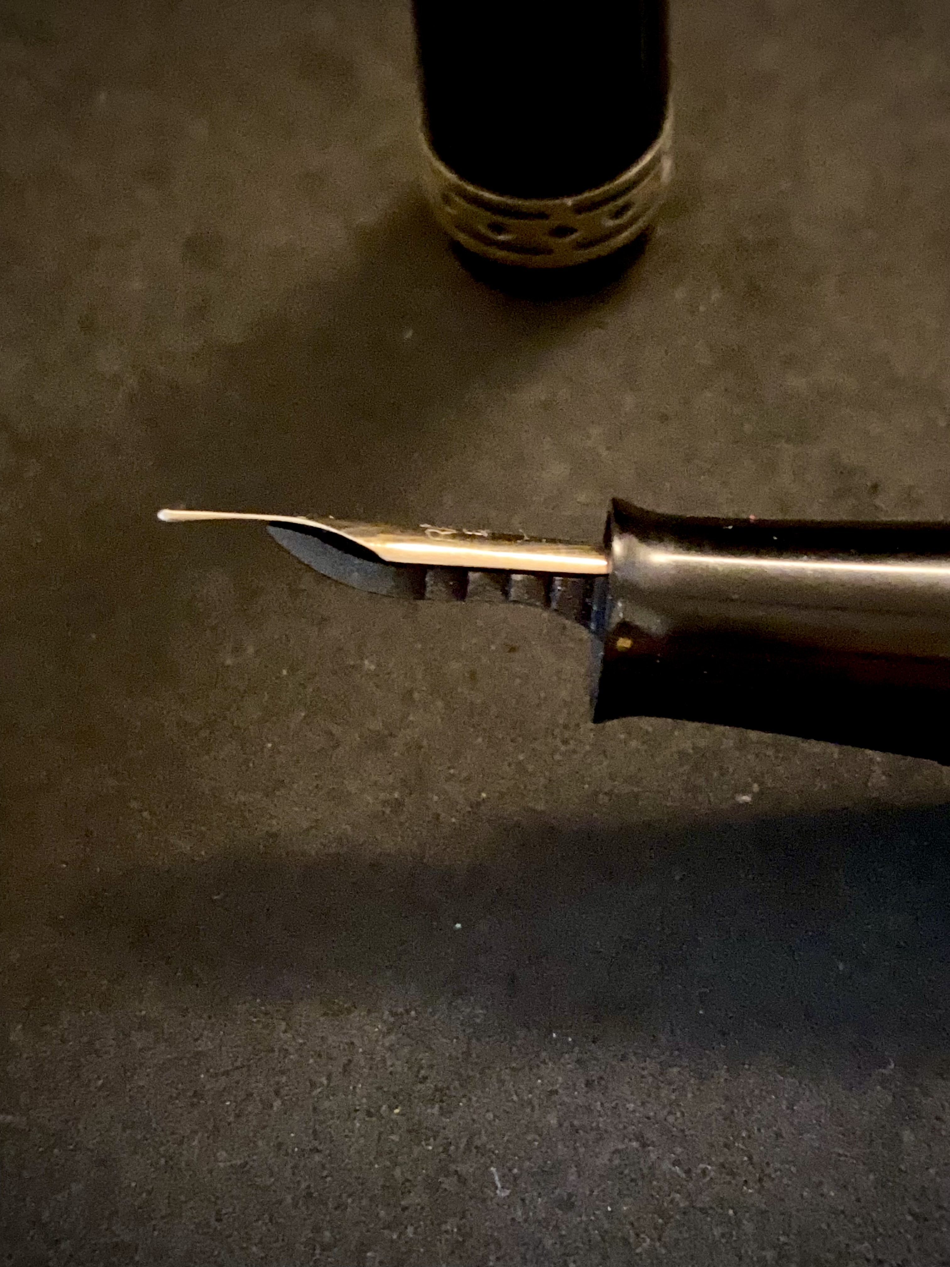 Ad occhio direi tra un EF ed un F, ha un feedback presente, ma direi che c’è da aspettarselo da un pennino di questa gradazione che ha evidentemente lavorato tanto. Caricato con il Montblanc Permanent Grey, scorre senza incertezze, con un tratto continuo ed un flusso sempre ben misurato. E’ un pennino a cui piace la mano leggera, flette solo quando chiediamo di farlo senza perdere un colpo e segue perfettamente la mano, ma è una penna d’altri tempi e se non guidata a dovere diviene poco piacevole. Se crediamo di scrivere con una biro e calchiamo la mano, la sentiamo grattare la carta ed in alcune direzioni tende quasi ad impuntarsi divenendo una vera tortura. Per cui bisogna sedersi, respirare e lasciarla scivolare sul foglio, fino a prendere confidenza con un pennino d’antan che saprà ripagarci con deliziose ore di scrittura.