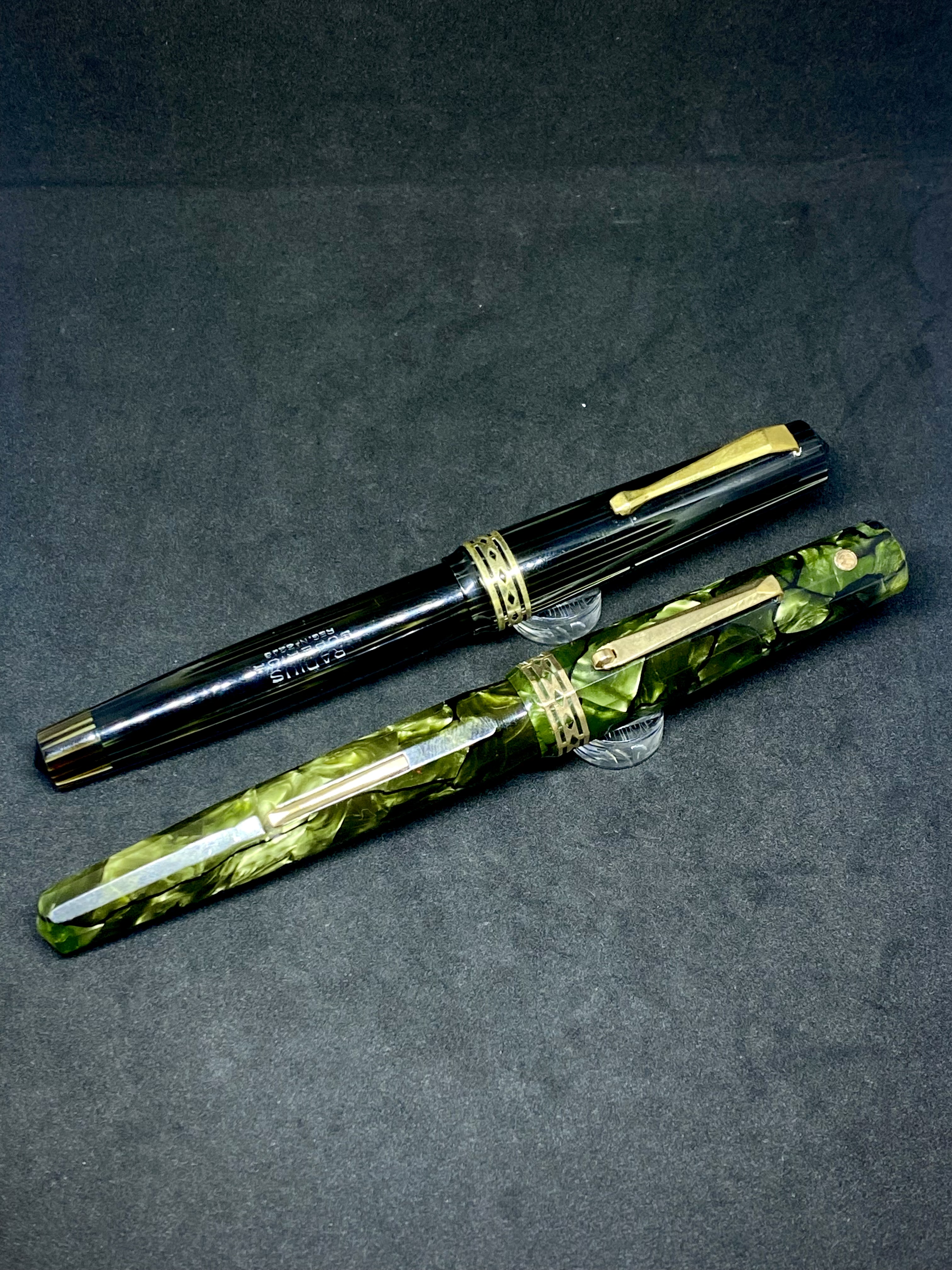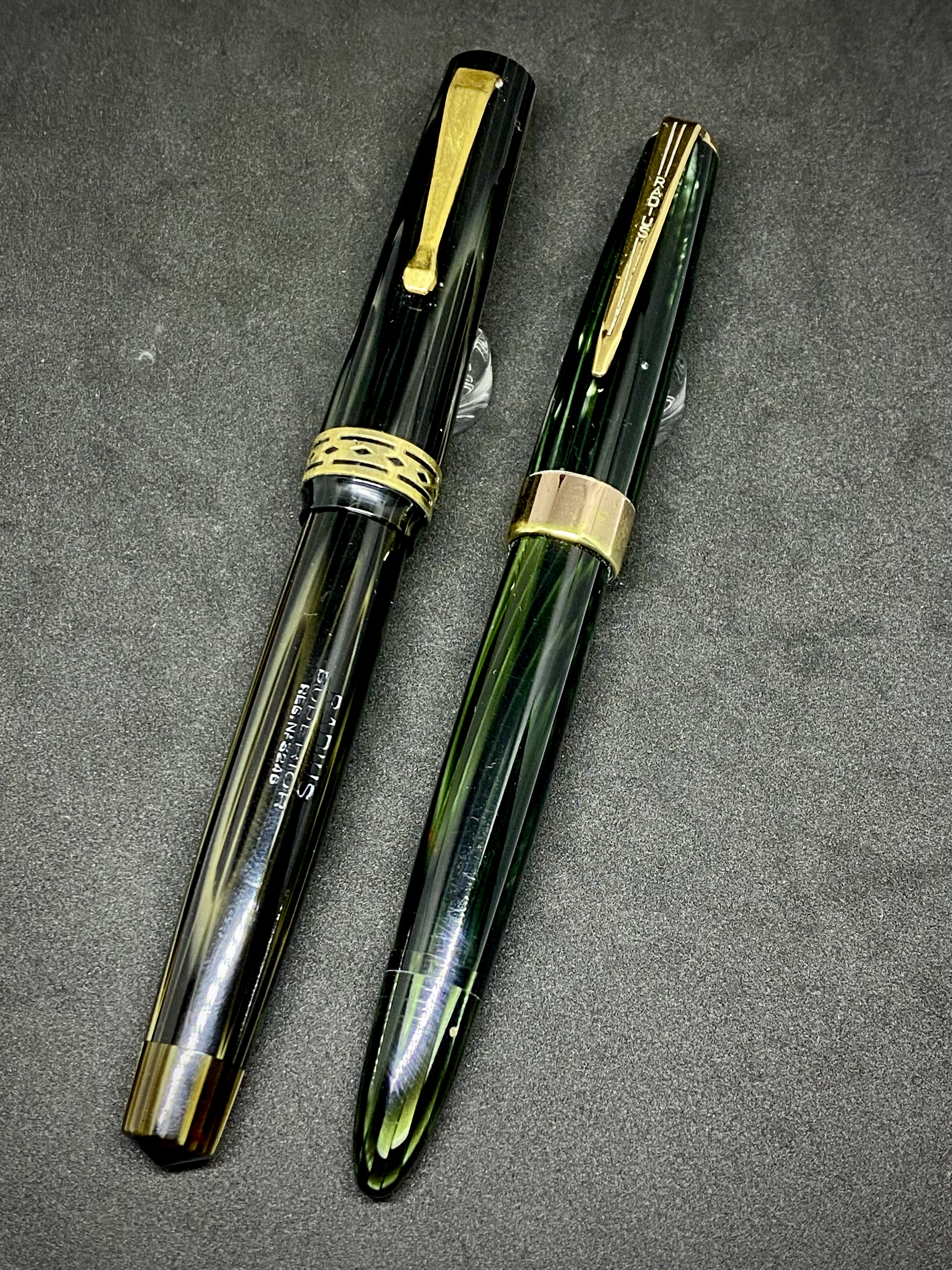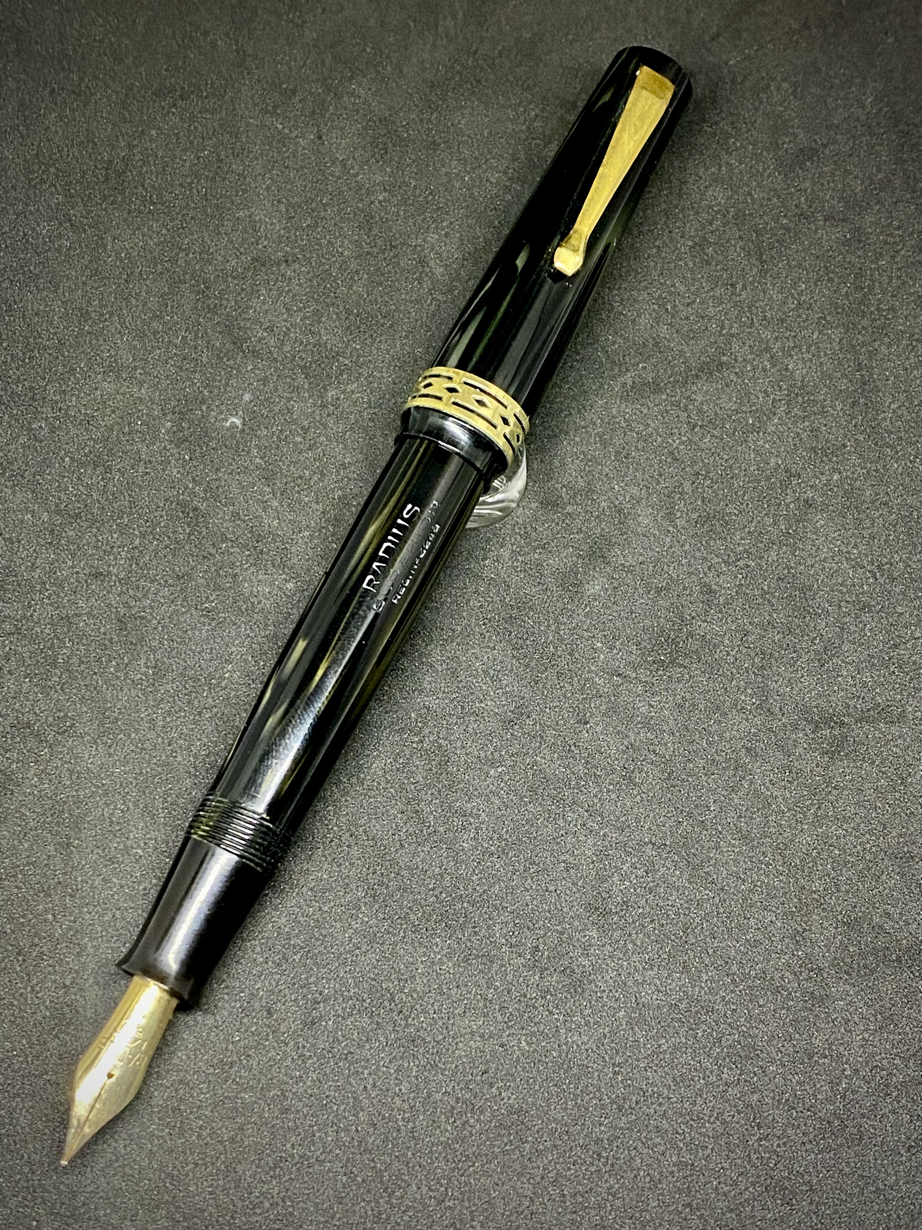 La produzione SAFIS a marchio Radius, fu una produzione di altissimo livello, erano penne solide, ben fatte e rifinite, con materiali molto belli come questa elegantissima celluloide Arco Grigio. Penne che negli anni ‘30, erano un inno allo stile Art Déco in voga già da tempo. La prima impressione che si ha guardando questa penna è che non brilla per originalità, e non solo per la sua forma affusolata, ma soprattutto per la fascetta del cappuccio che dà poco adito a dubbi vista la rassomiglianza a quella delle Doric di produzione Wahl Eversharp. Ma SAFIS è comunque riuscita a conferirle un suo stile, più muscoloso rispetto alla produzione d’oltreoceano. Messa a fianco di una Doric oversized, notiamo che nel complesso la penna è più corta e un po più sottile, ma il cappuccio è della stessa lunghezza mentre il fusto risulta più corto.