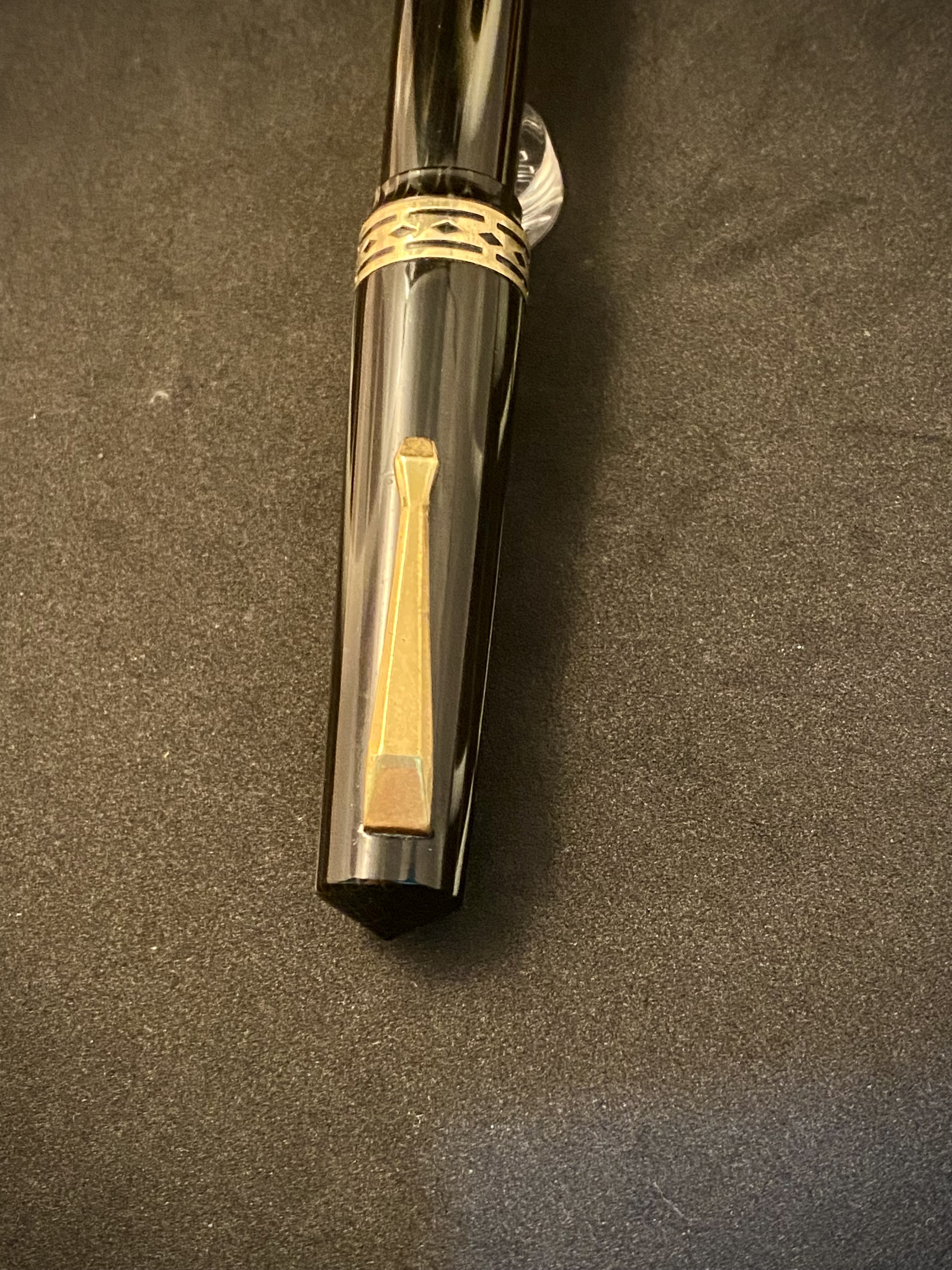 E poi c’è la clip, l’elemento distintivo della Radius che urla: non sono una imitazione di una Wahl! In perfetto stile Art Dèco, ha la forma di un triangolo con un ottagono che sembra una goccia. Ma se la guardiamo a testa in giù vediamo che diviene la rappresentazione geometricamente stilizzata di una cravatta, in cui la punta della clip ne rappresenta il nodo. Una clip estremamente elegante che dona alla penna un look raffinato da uomo in abito scuro e cravatta.