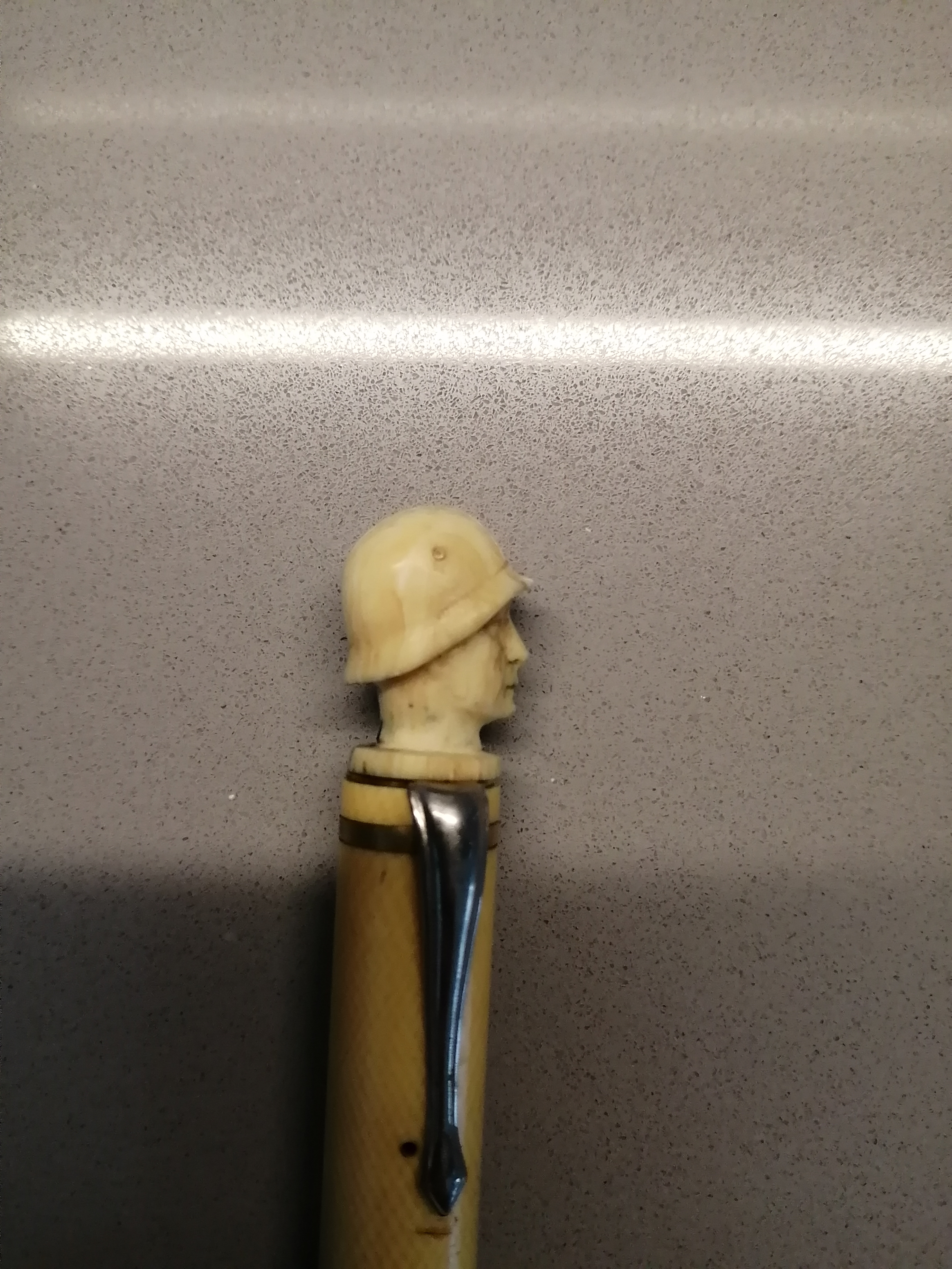 Allego di seguito le foto, la struttura è plastica\resina mentre l'estremità supriore che rappresenta un soldato con elmetto è AVORIO, sul pennino d'acciaio è incisa la sigla NICHROMA EXTRA.