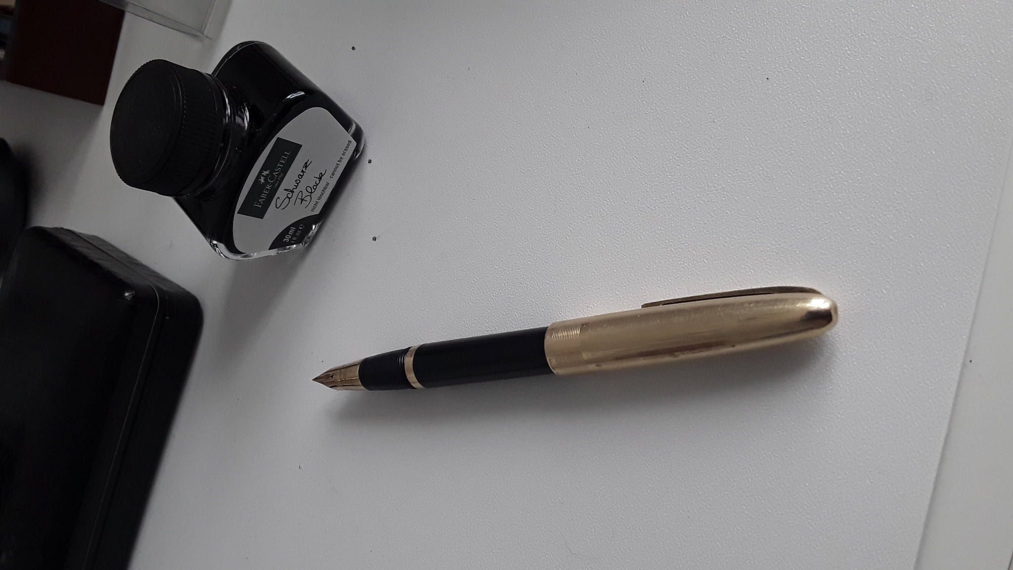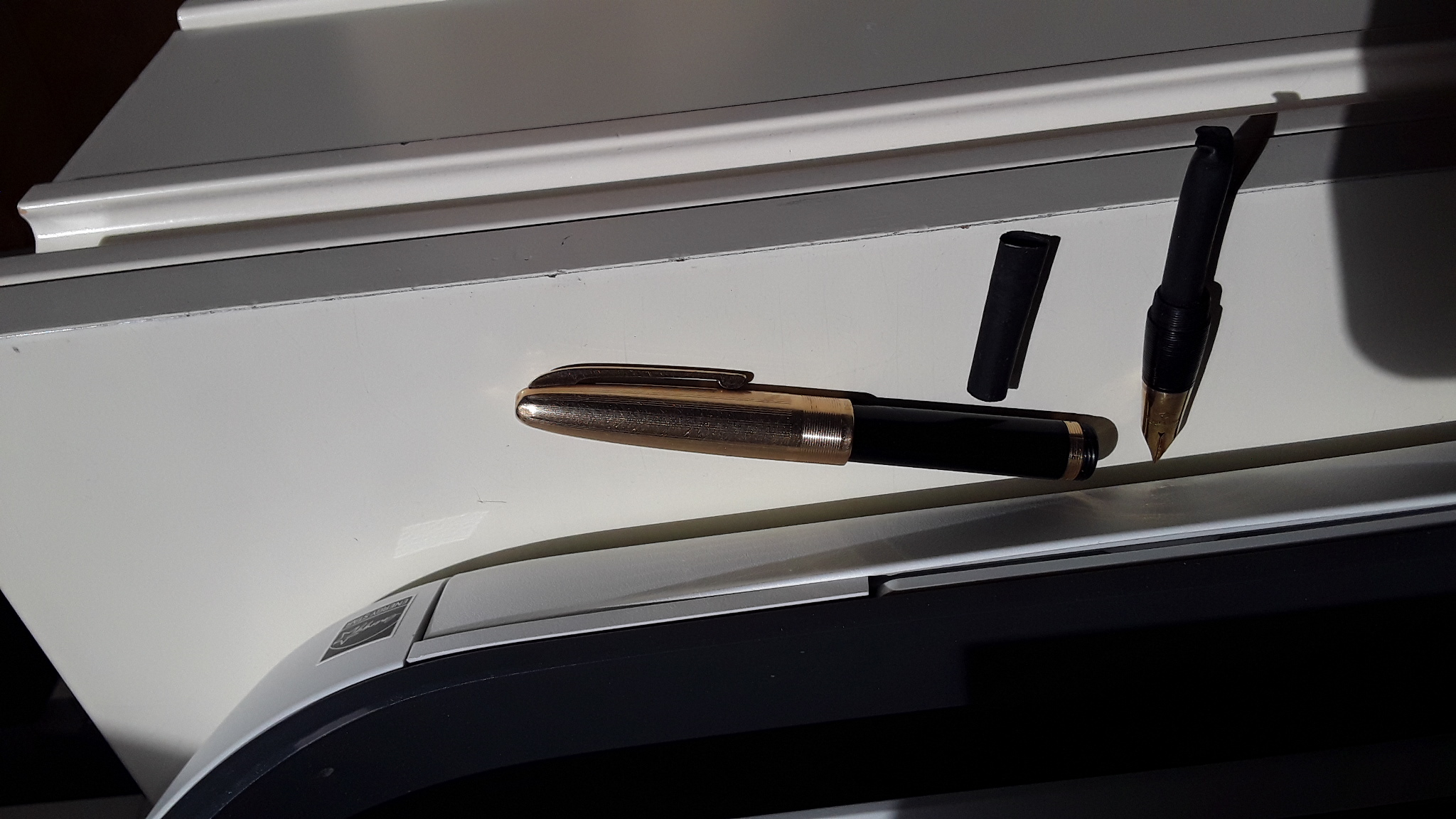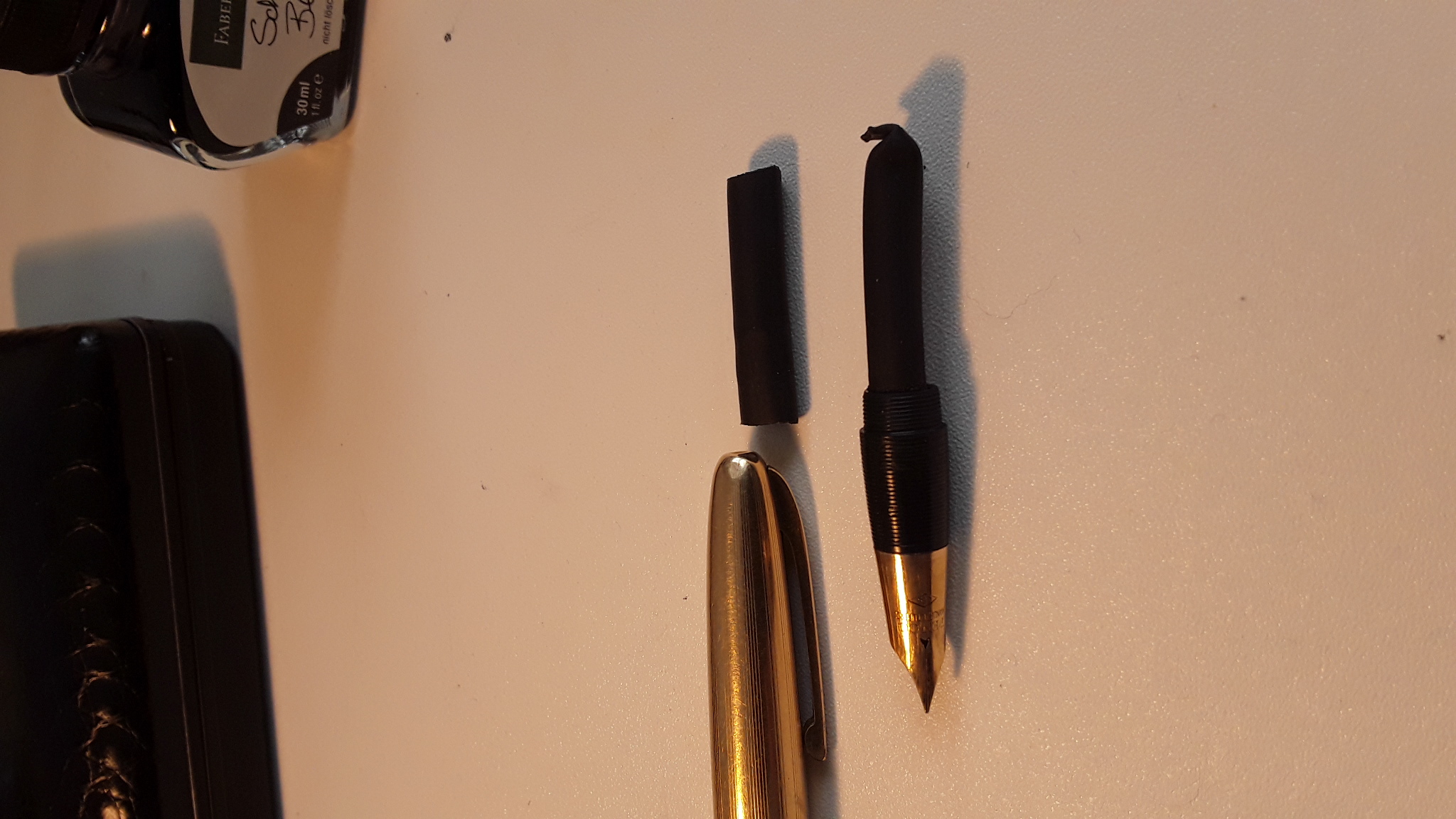 Ho utilizzato, orrore, un pezzo di guaina termorestringente e funziona! Benissimo! Il pistone lubrificato svolge egregiamente il suo compito e carica l'equivalente di una cartuccia (piccola, ovvio). La penna mi piace molto esteticamente, forse piu della Sheaffer alla quale si ispira.