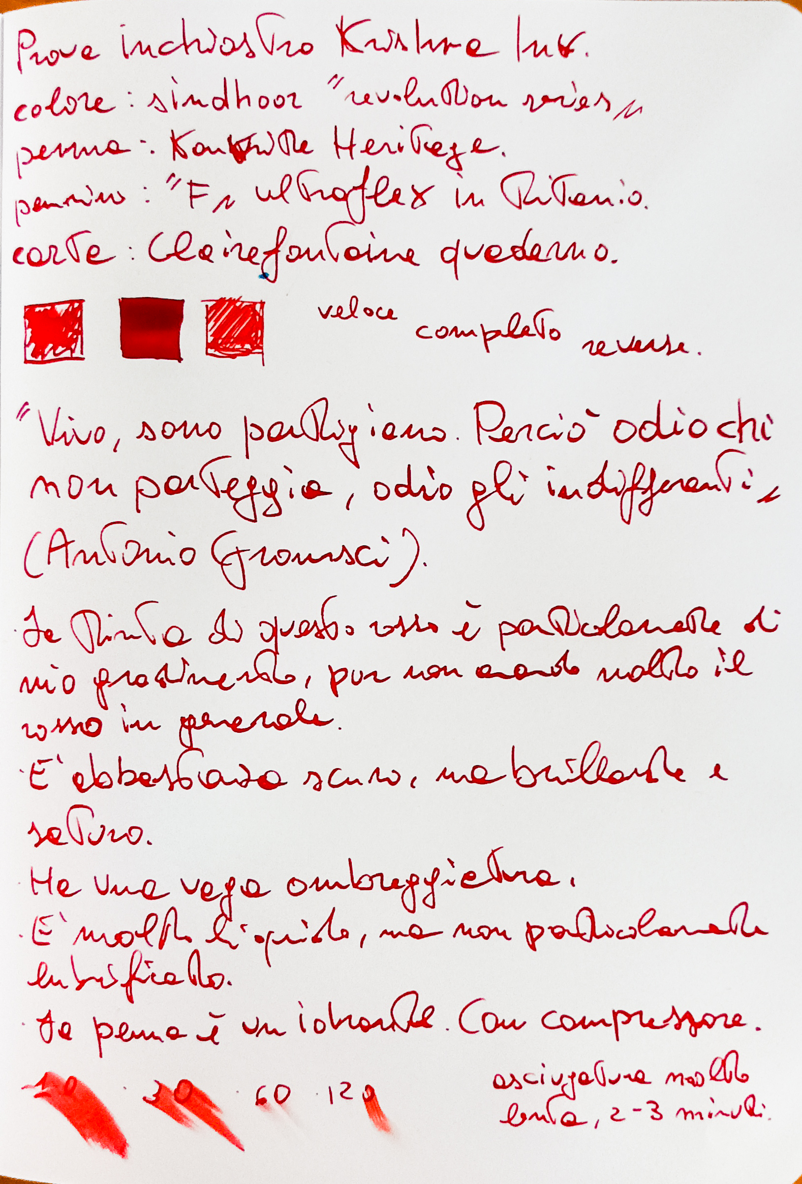 Anche in questo caso ho mantenuto l'autonomia territoriale indiana caricando la penna con il (bel) Krishna "Revolution Series" Sindhoor, un rosso vivo ispirato dal sindur, un cosmetico basato sulla curcuma.