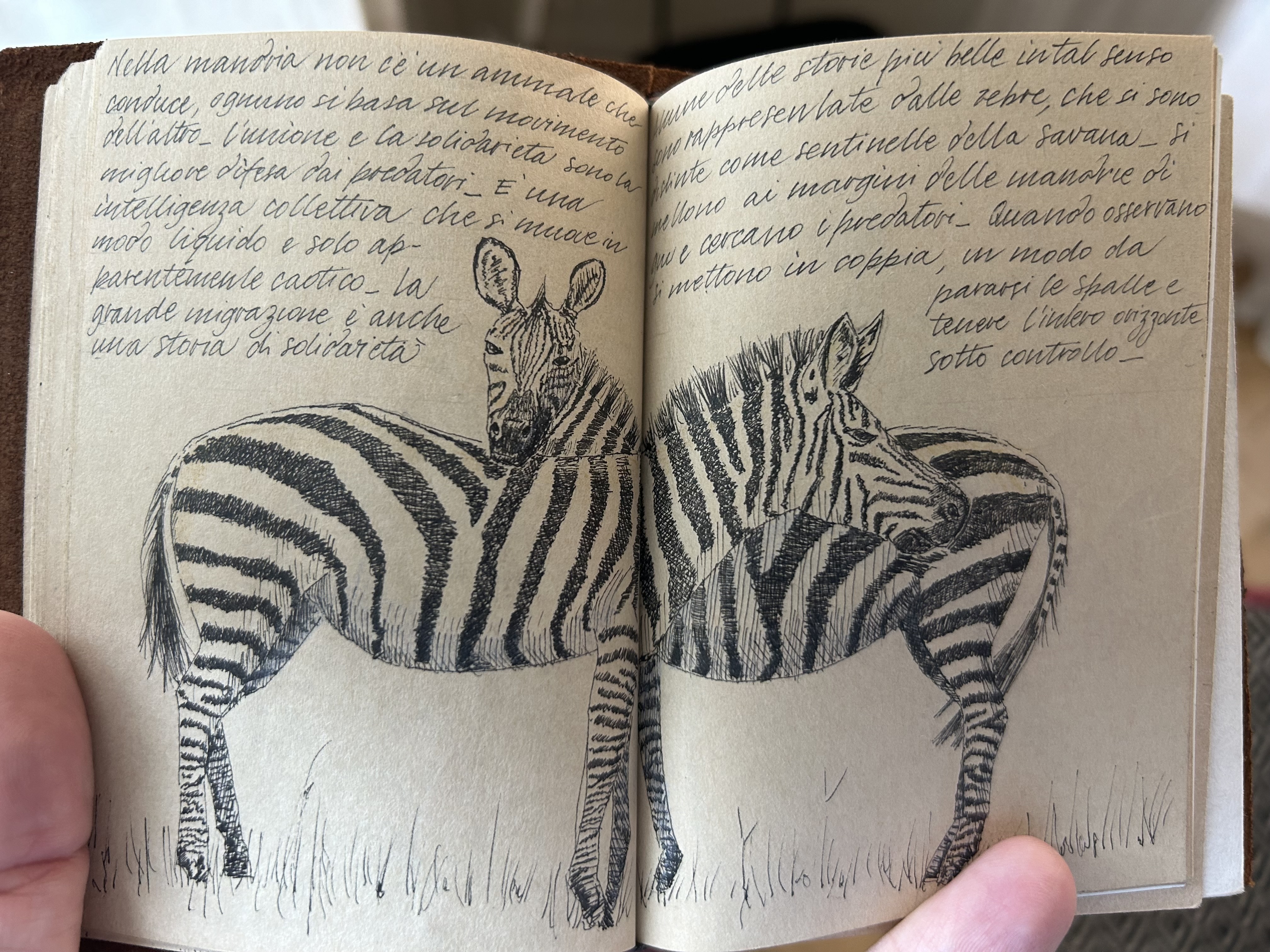 In tutti i diari che faccio il processo è sempre molto caotico! Alcuni disegni li ho fatti sul posto, altri la sera a memoria, spesso aiutato dalle foto fatte che avevo sull'iphone. In questo specifico viaggio, per capire meglio l'espressione di alcuni animali, in certi casi, ho trovato utile aiutarmi anche con immagini prese in rete. Lo ho fatto ad esempio per il rinoceronte nello ngoro ngoro, che ho visto da lontano.