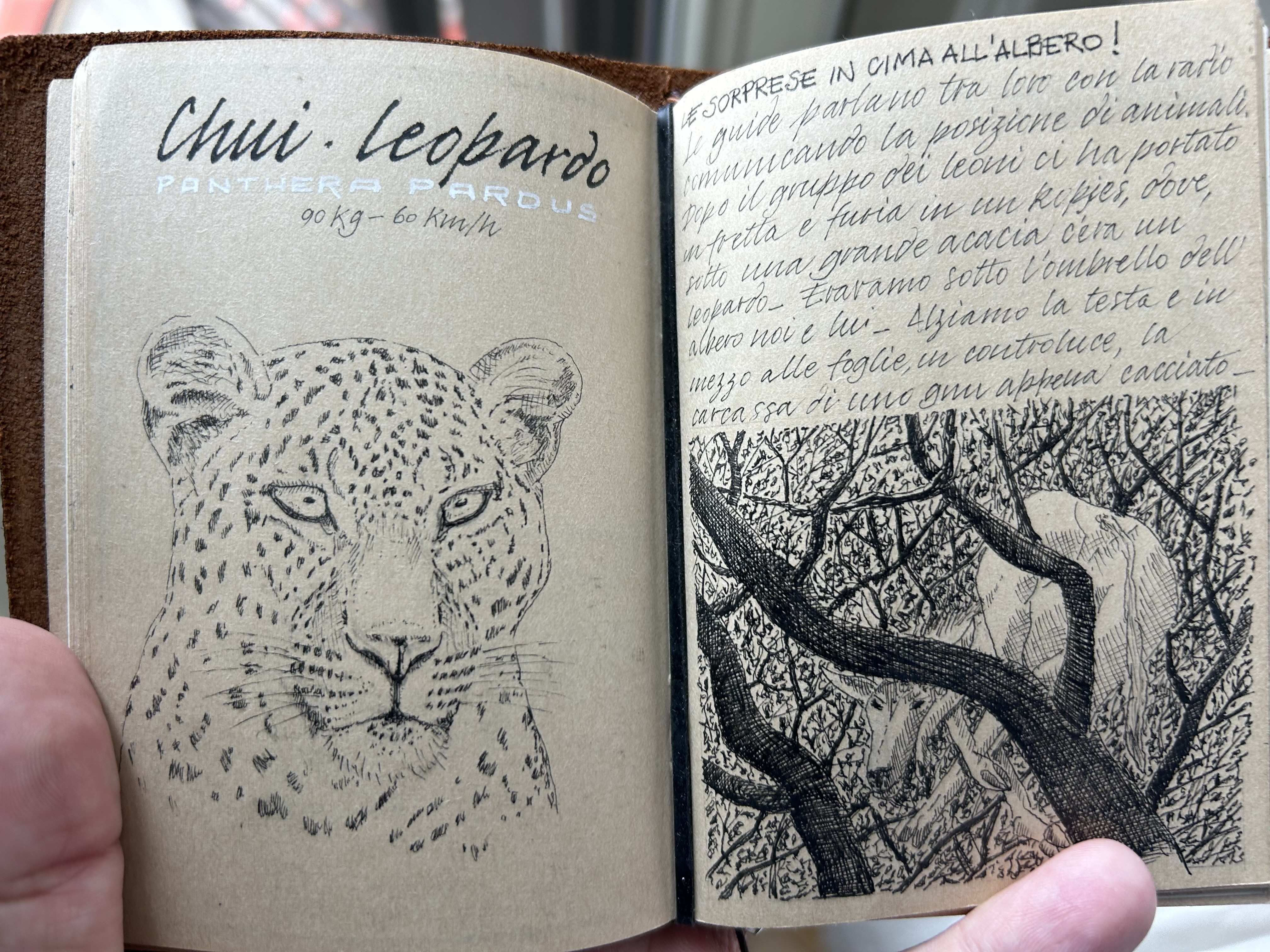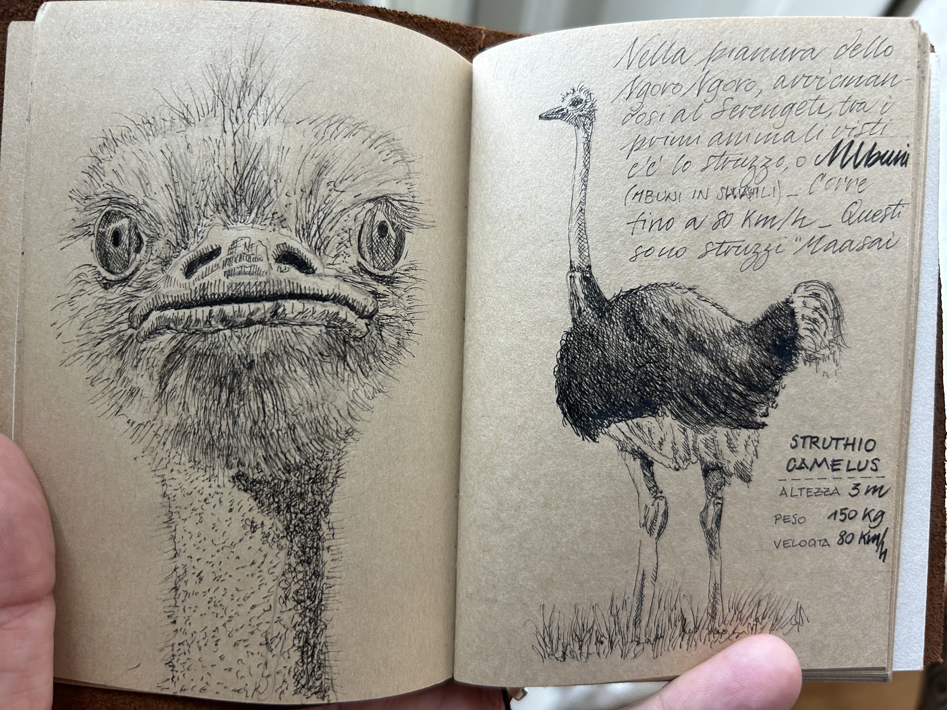 Ampiamente risposto! Grazie!Archipat ha scritto: ↑venerdì 26 luglio 2024, 19:19In tutti i diari che faccio il processo è sempre molto caotico! Alcuni disegni li ho fatti sul posto, altri la sera a memoria, spesso aiutato dalle foto fatte che avevo sull'iphone. In questo specifico viaggio, per capire meglio l'espressione di alcuni animali, in certi casi, ho trovato utile aiutarmi anche con immagini prese in rete. Lo ho fatto ad esempio per il rinoceronte nello ngoro ngoro, che ho visto da lontano.