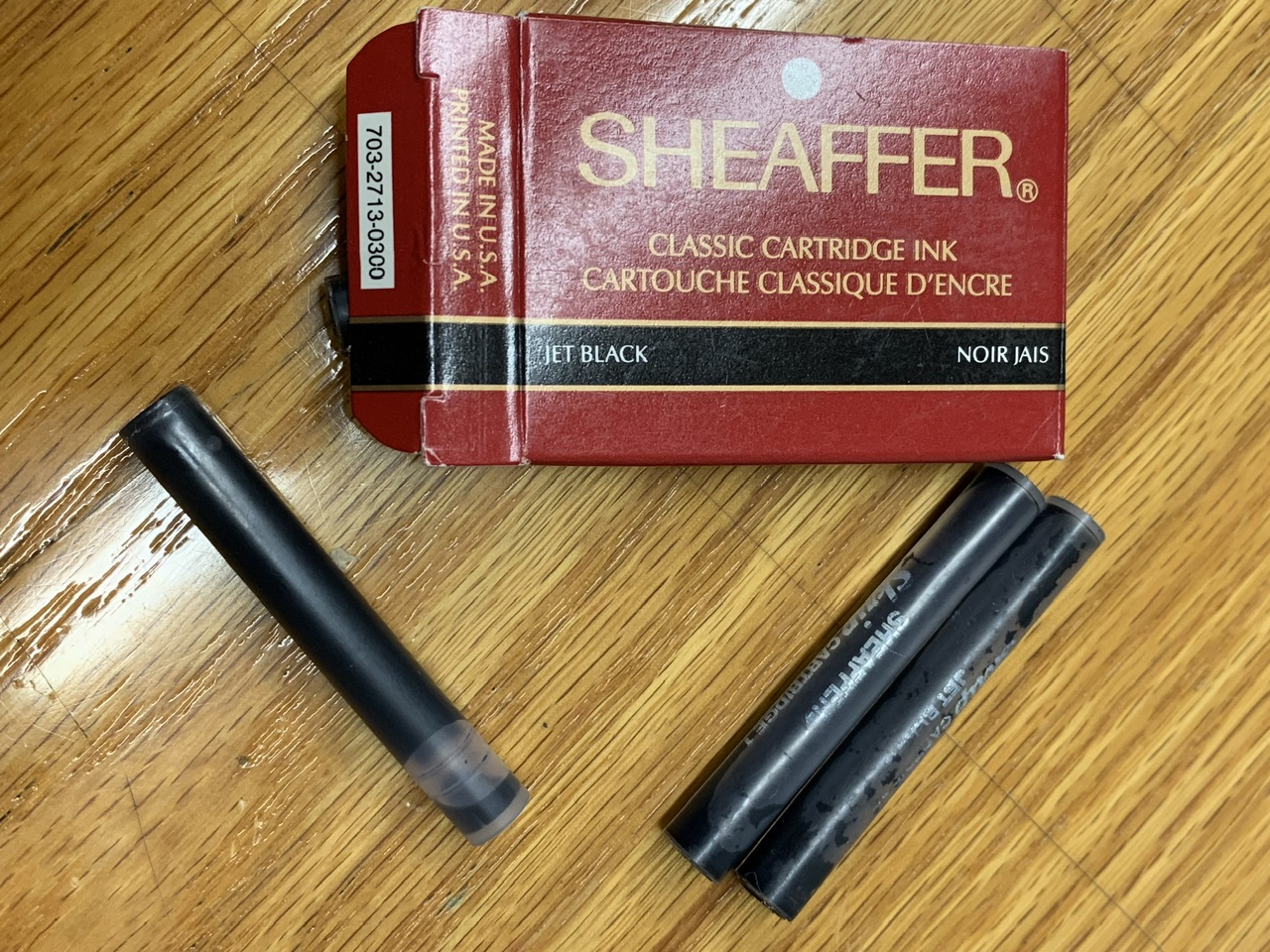 Ho scovato nel cassetto un paio di cartucce Sheaffer di "ere" differenti, una moderna e una marcata "Sheaffer skrip cartridge 1 Jet Black" metto foto comparative, le dimensioni esterne sono identiche, cambia la forma dell'imboccatura: quelle moderne hanno una specie di collarino con una pallina di chiusura, quelle vecchie hanno una semplice copertura di plastica piatta.