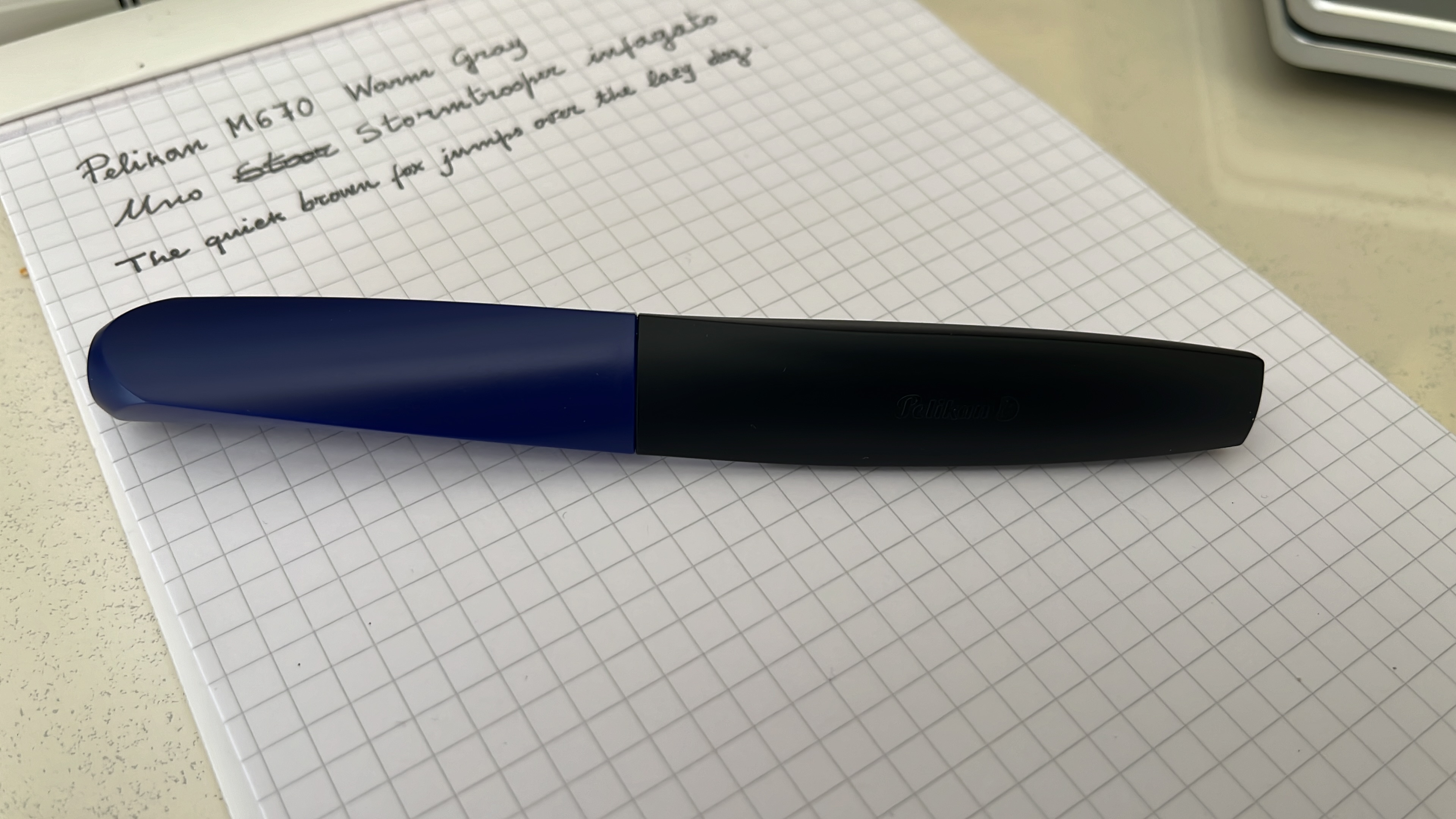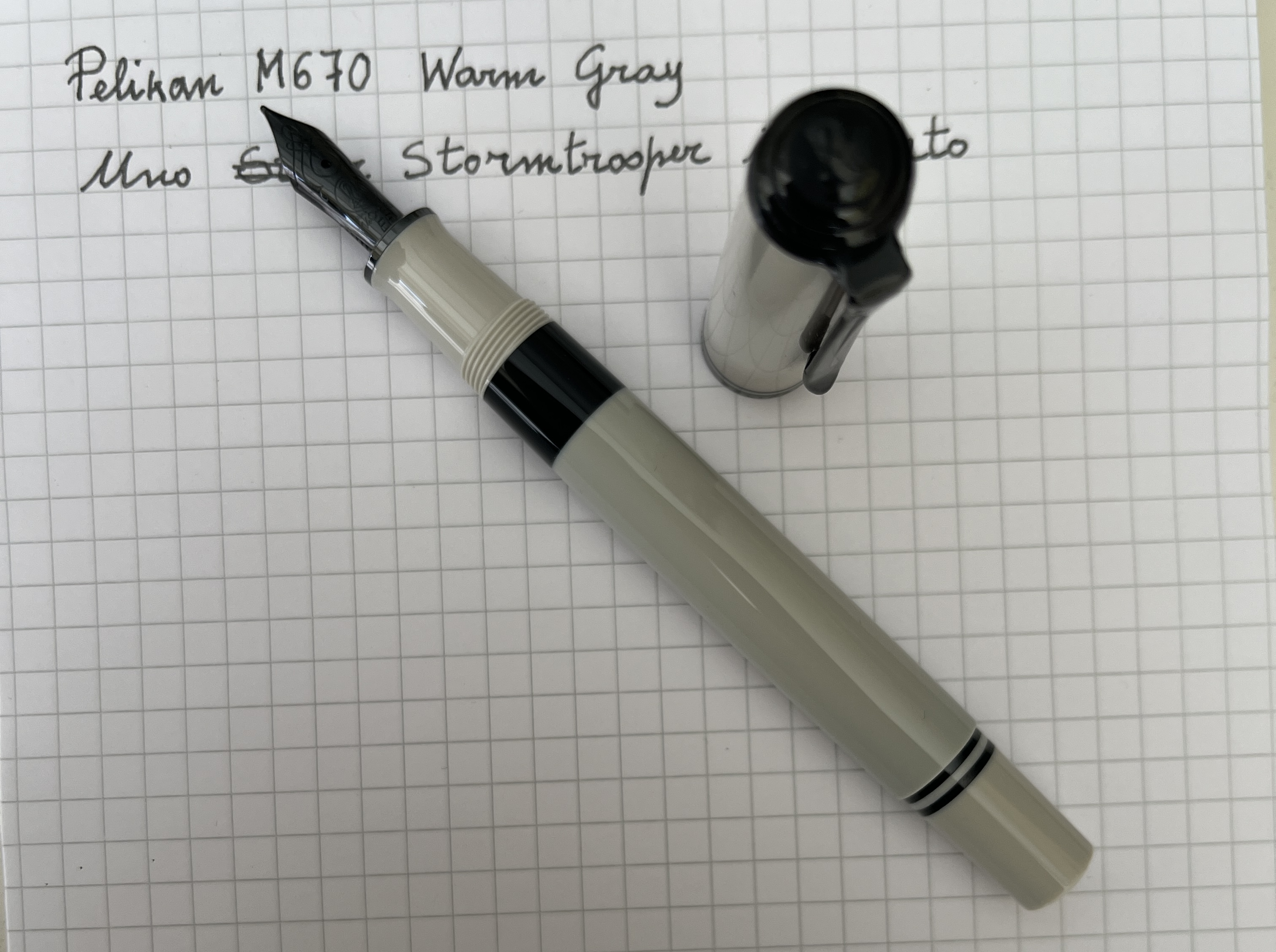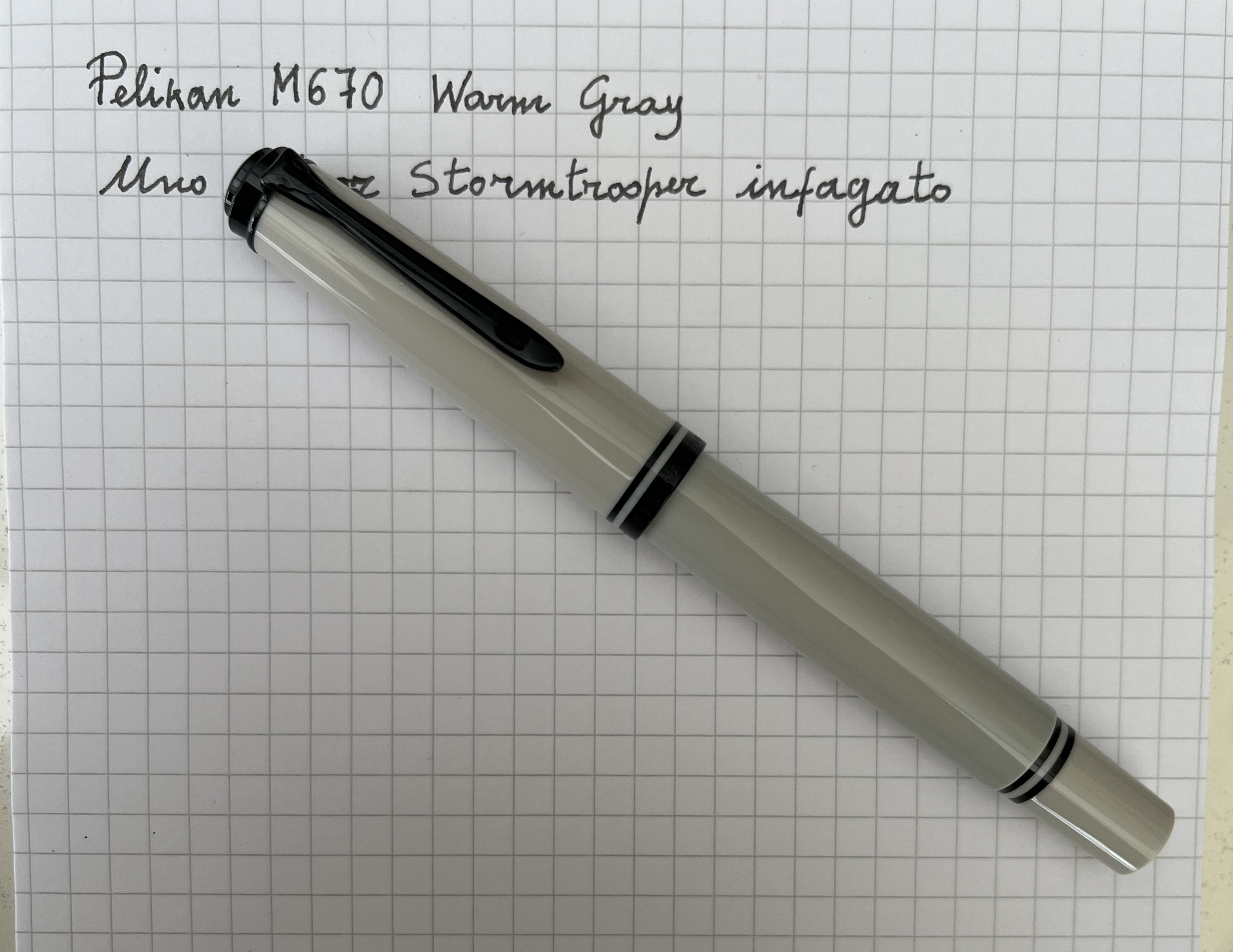 La M670 è di un colore grigio molto vicino al bianco sporco, il paragone più calzante è uno stormtroopen caduto in una pozza di fango mentre combatteva la battaglia di Endor. La colorazione mi piace moltissimo ed il tratto EF (secondo me reso più doppio dalla placcatura in rutenio) scrive molto bene.