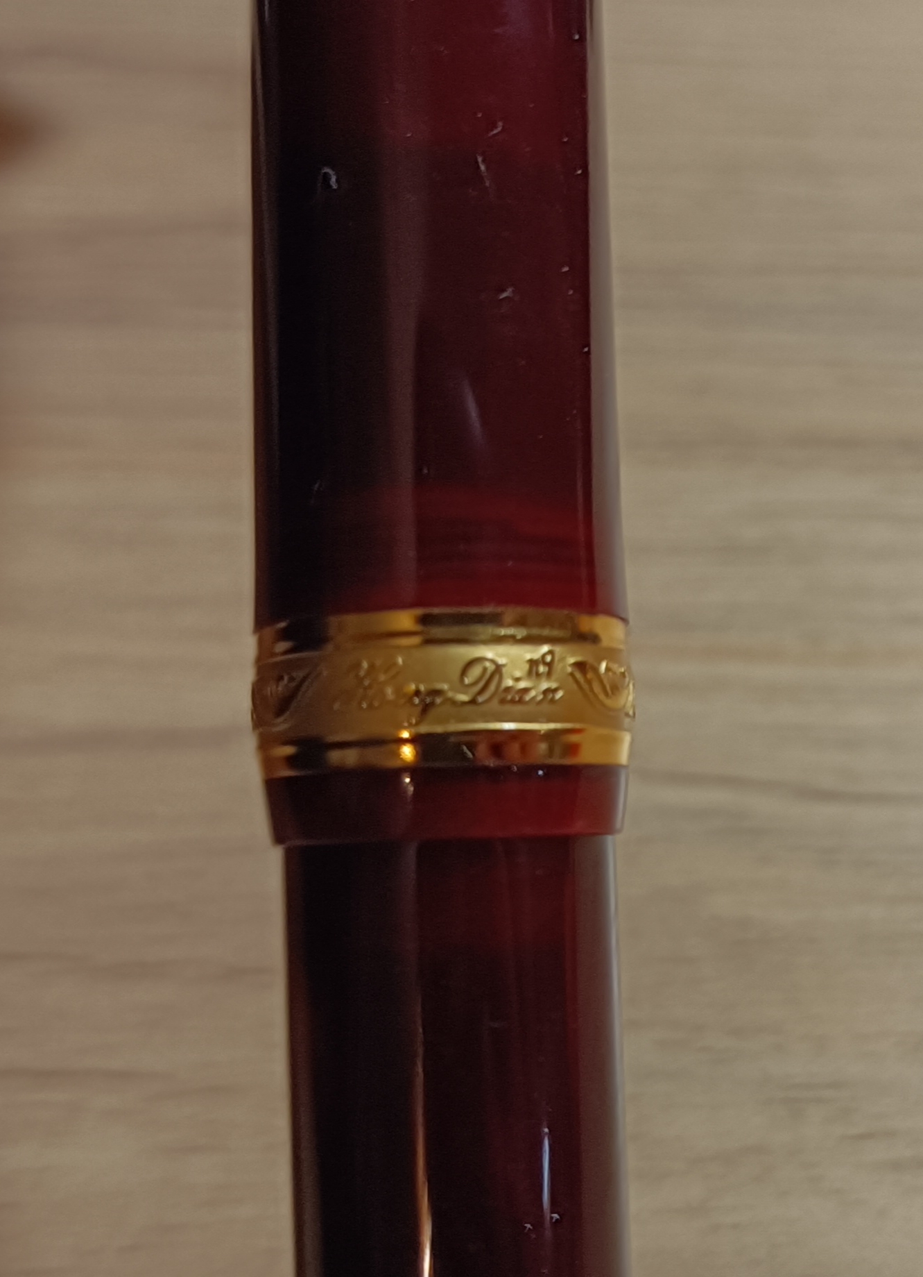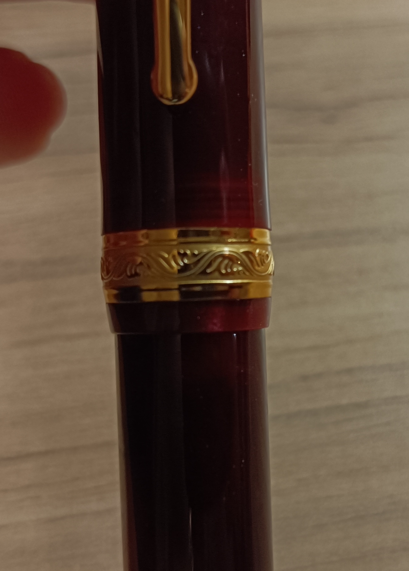 Dal punto di vista estetico la Hongdian N9 è una penna in resina dalla classicissima forma a sigaro con minuterie dorate. La resina è molto bella, di un colore viola scuro/borgogna (scusate se non sono molto preciso, ma le sfumature di colori mi confondono sempre) con sfumature “vellutate”. La resina è perfettamente tornita e lucidata, non noto giunzioni da nessuna parte. Le dimensioni sono quelle che per la mia mano definisco “medie”: 13,5 cm da chiusa e 12 cm da aperta. Da chiusa gli unici elementi decorativi che si vedono solo la clip e la banda sul cappuccio (se Cesare sta leggendo queste righe, no, non so valutare quanto siano “di qualità”, resistenti o durature: solo con il tempo e l’uso potrò scoprirlo). La clip è piuttosto rigida, senza infamia e senza lode dal punto di vista stilistico. La banda del cappuccio merita una descrizione più dettagliata: mi ha colpito la fattura, con una alternanza di parti lucide e parti opache e un disegno a onde in rilievo dal gusto “orientale” nel senso buono del termine. Sul retro in rilievo è posto il nome del modello in un font corsivo, che ben si sposta con il disegno della banda. Una volta svitato il cappuccio si scopre una sezione dello stesso materiale del resto della penna, all’inizio della quale c’è un piccolo anellino dorato. Per questo modello quelli della Hongdian hanno adottato la soluzione stilistica della “via di mezzo” già molto praticata da Sailor, cioè quella di fare un micro-scalino sul fusto in modo che la forma sia più armonica da chiusa ma al tempo stesso non sia troppo visibile a penna aperta (su questo vorrei proprio sentire il parere di Piccardi, così da sapere se questa soluzione urta la fazione anti-scalino).