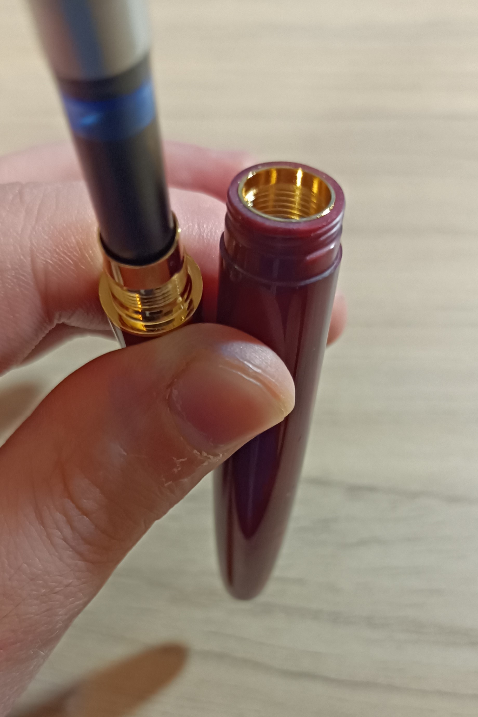 Il sistema di caricamento è un classico cartuccia/converter: l’imbocco è un po’ diverso dallo standard europeo, quindi non credo che vadano bene le cartucce ad attacco “internazionale” (che arrivati a questo punto mi chiedo quanto sia davvero internazionale, visti i molti attacchi proprietari in giro e lo standard americano/cinese). In ogni caso la penna arriva con il suo converter a stantuffo che mi sembra piuttosto robusto (ha l’imbocco rinforzato da una banda di metallo). Non ho avuto grossi problemi nel caricare la penna, funziona molto bene. Trovo degno di lode l’accorgimento di mettere una filettatura metallica anche nel fusto e non ricavarla direttamente dalla resina: ciò oltre a dare una sensazione di robustezza aggiunge anche quel po’ di peso che rende la penna più “sostanziosa”.